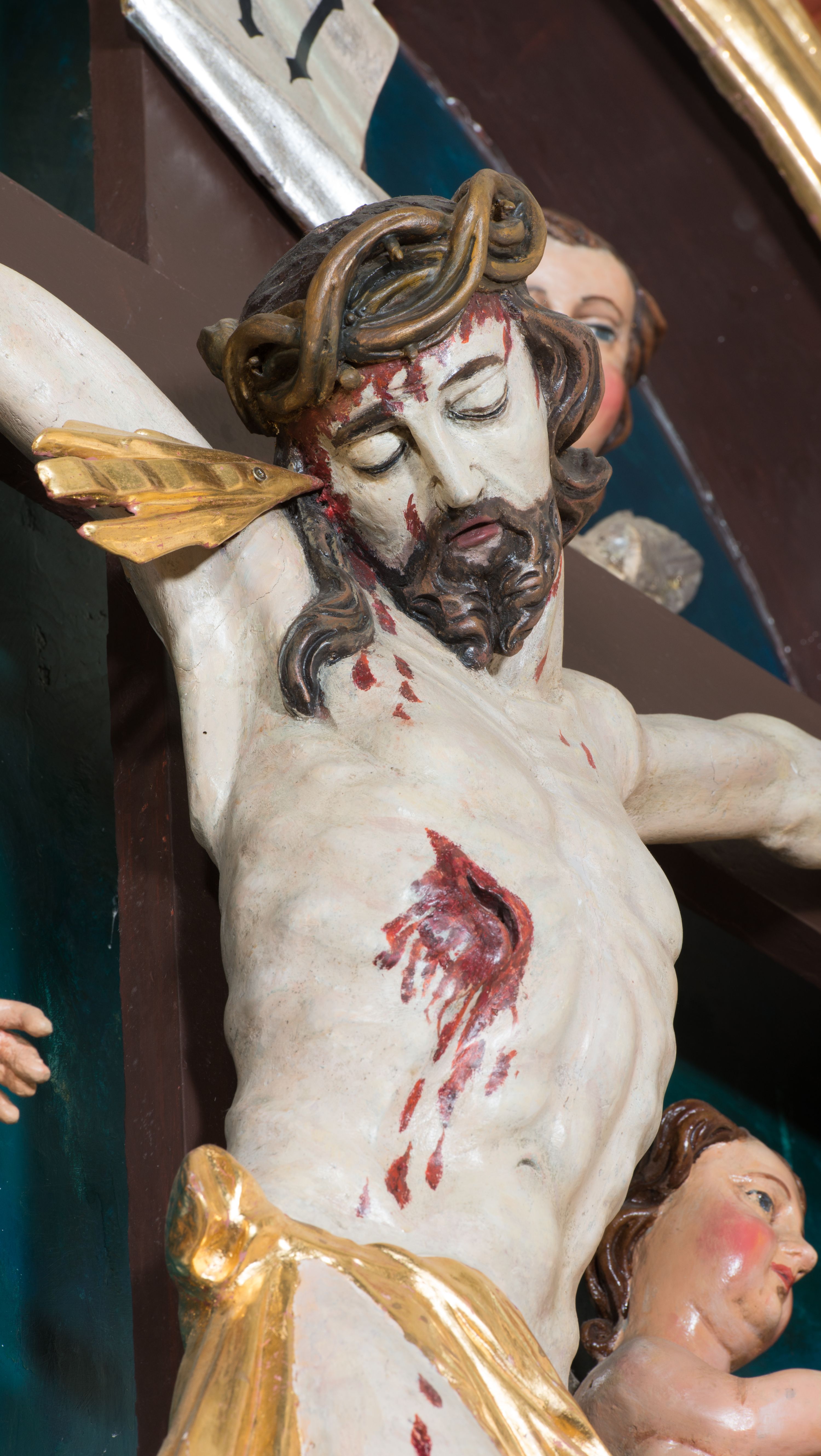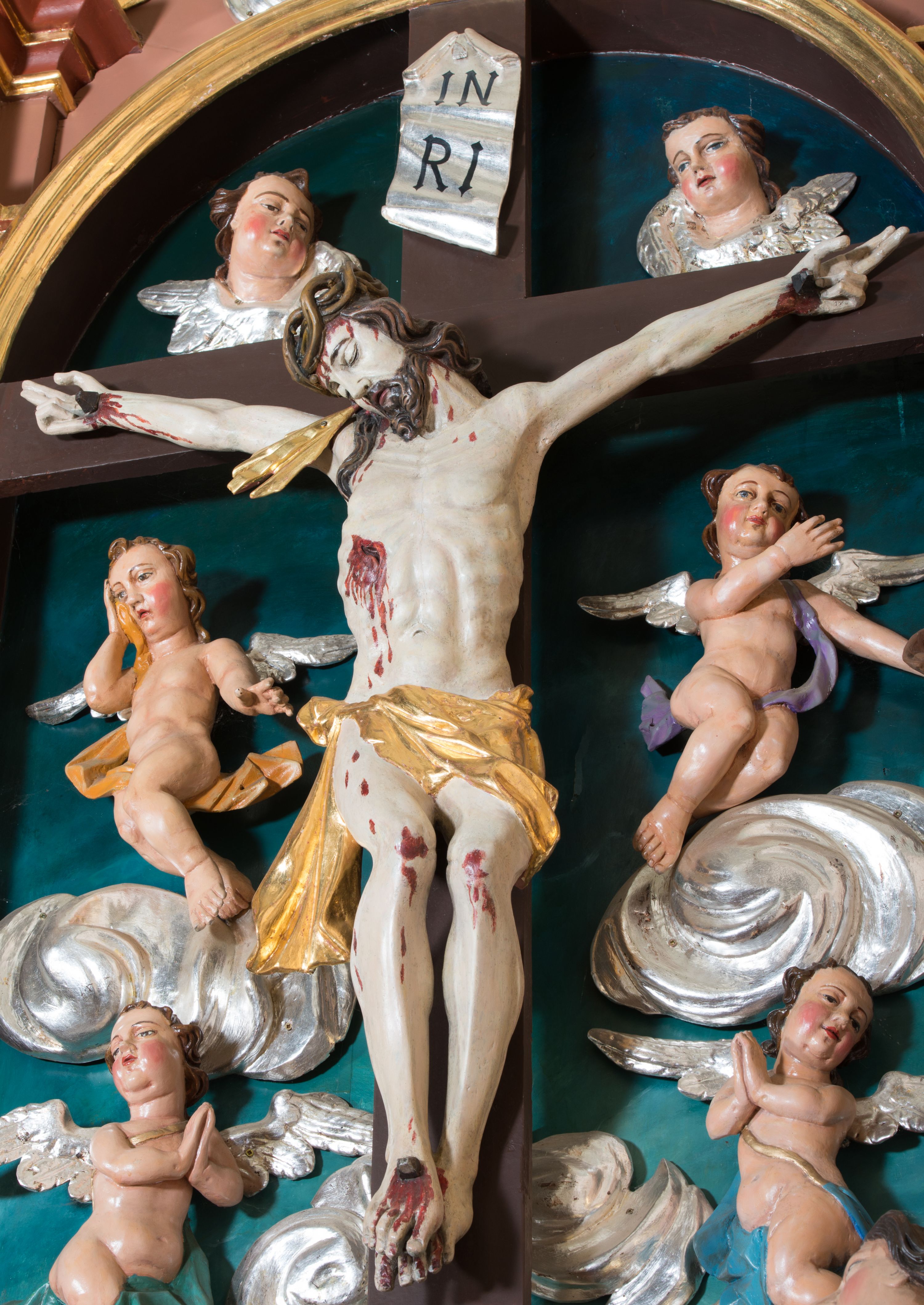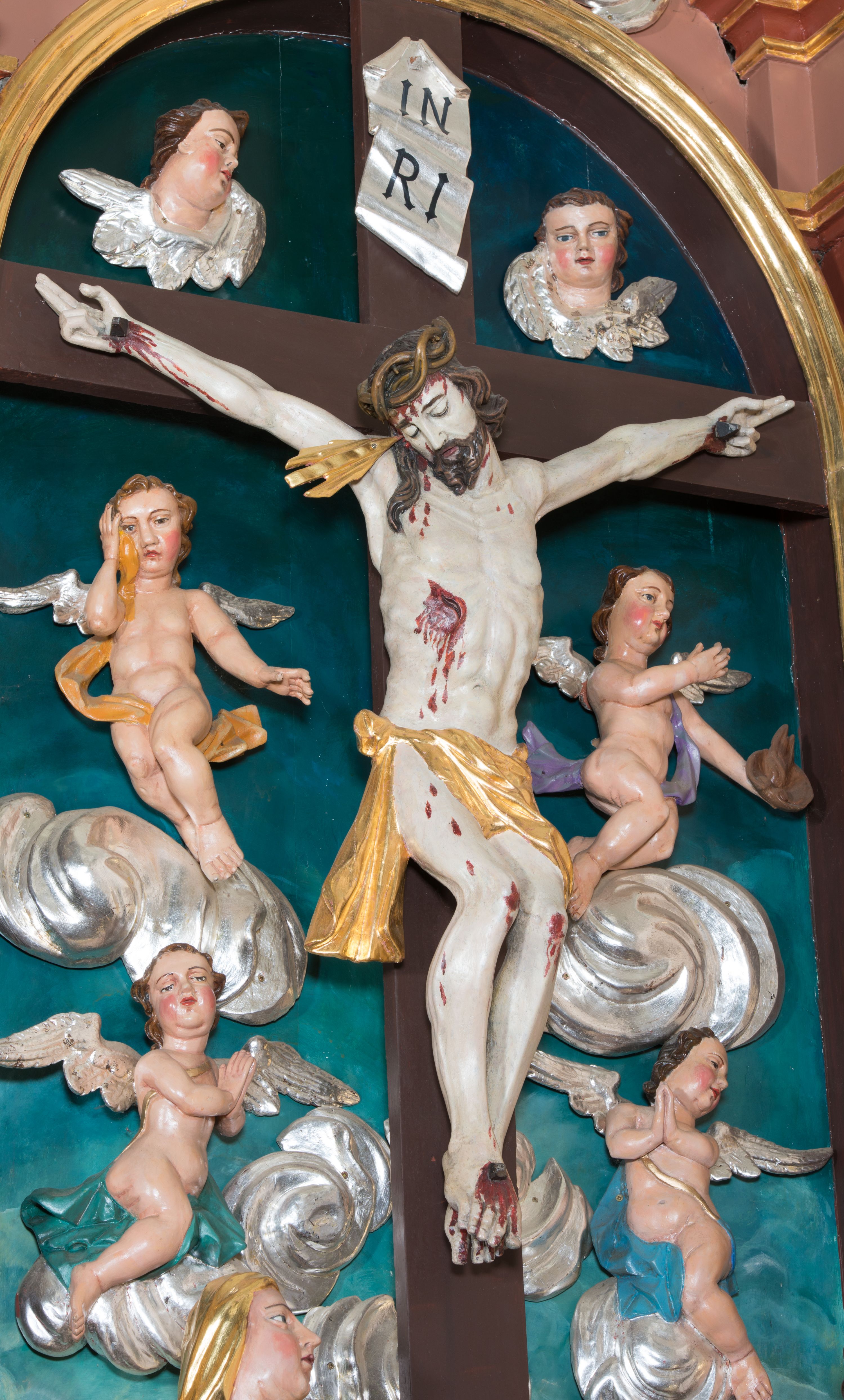 Pełnoplastyczna, polichromowana figura Chrystusa w typie Cristo morte przybitego trzema gwoździami do dużego, brązowego krzyża. Chrystus ukazany w statycznej pozie, w mocnym zwisie z ugiętymi w kolanach nogami. Twarz podłużna z długim nosem, okolona krótką brodą, która na końcu zawija się w dwa pukle. Włosy długie, ciemnobrązowe opadające na prawe ramię i plecy. Sylwetka szczupła o wyraźnie podkreślonej linii żeber z guzowatą klatką piersiową; na głowie, kolanach, dłoniach, stopach i boku ślady krwi. Perizonium przewiązane na prawym boku ze zwisem wzdłuż prawego uda, złocone. Na głowie szeroka korona cierniowa, wokół niej niekompletny nimb krzyżowy z jedną wiązką promieni. Kolorystyka ciała utrzymana w odcieniach bladego beżu. U góry pionowej belki posrebrzany titulus w formie pionowej pogiętej banderoli z napisem: „IN / RI”. Krucyfiks otaczają cztery aniołki na obłokach o teatralnych gestach, nad krzyżem dwie uskrzydlone główki anielskie. Tło malowane na kolor ciemnoniebieski. Polichromia w odsłoniętych partiach ciała naturalistyczna, detale złocone i srebrzone.