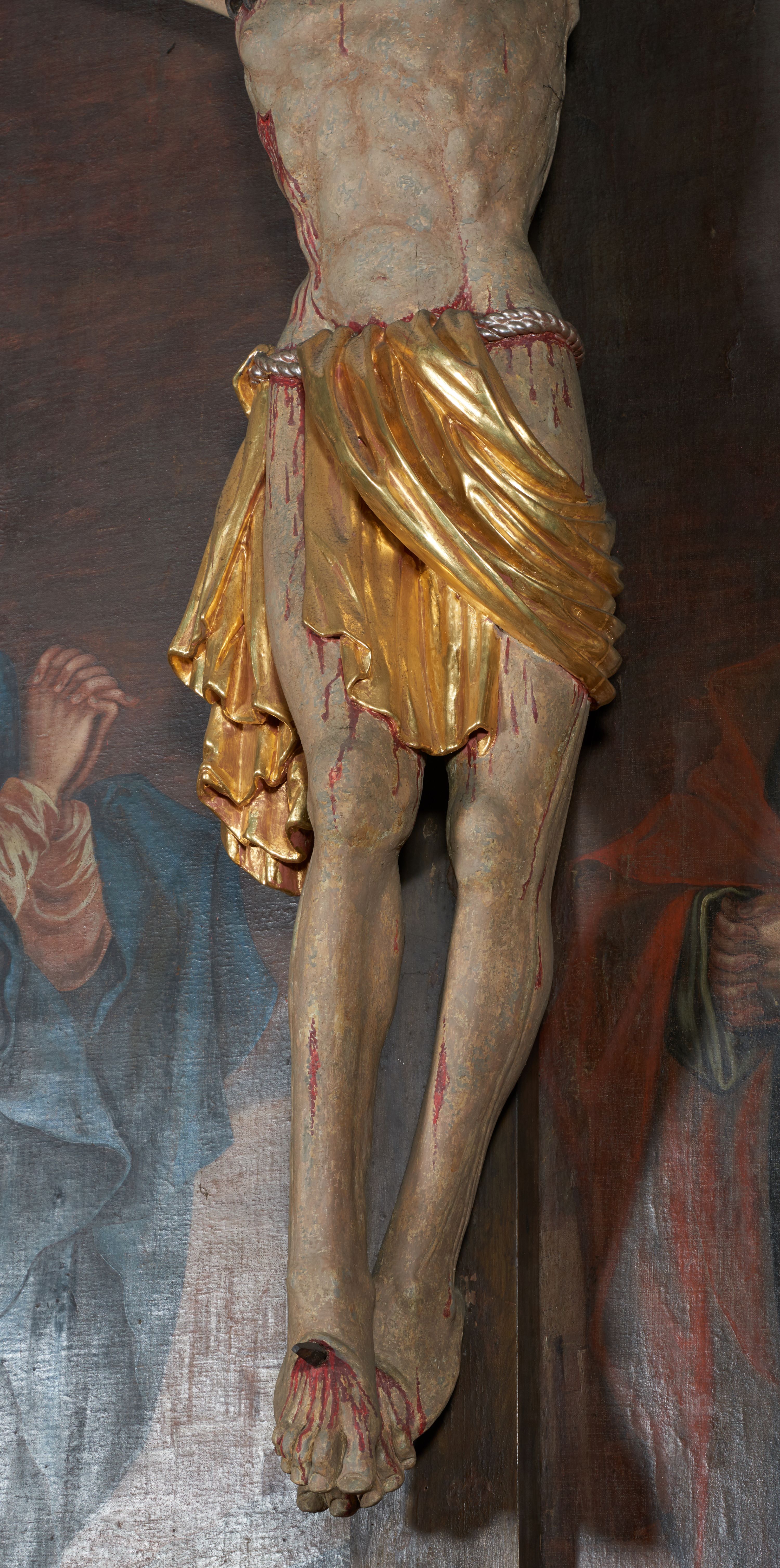 Krucyfiks w typie Christo morte; postać Chrystusa umarłego przybitego do krzyża trzema gwoździami. Sylwetka w delikatnym zwisie, o silnie zaznaczonej anatomii ciała, z podkreśloną linią żeber i zaznaczonymi śladami męki. Perizonium w formie tkaniny przewiązanej na sznurze, sięgające kolan i odsłaniające prawe udo; z prawej strony spływające kaskadowo. Twarz Jezusa podłużna opadająca na prawe ramię, okolona zarostem; oczy zamknięte, nos podłużny, wystające kości policzkowe; włosy długie spływające na prawe ramię, na głowie złota korona cierniowa. Partie ciała polichromowane naturalistycznie, korona cierniowa i perizonium złocone.