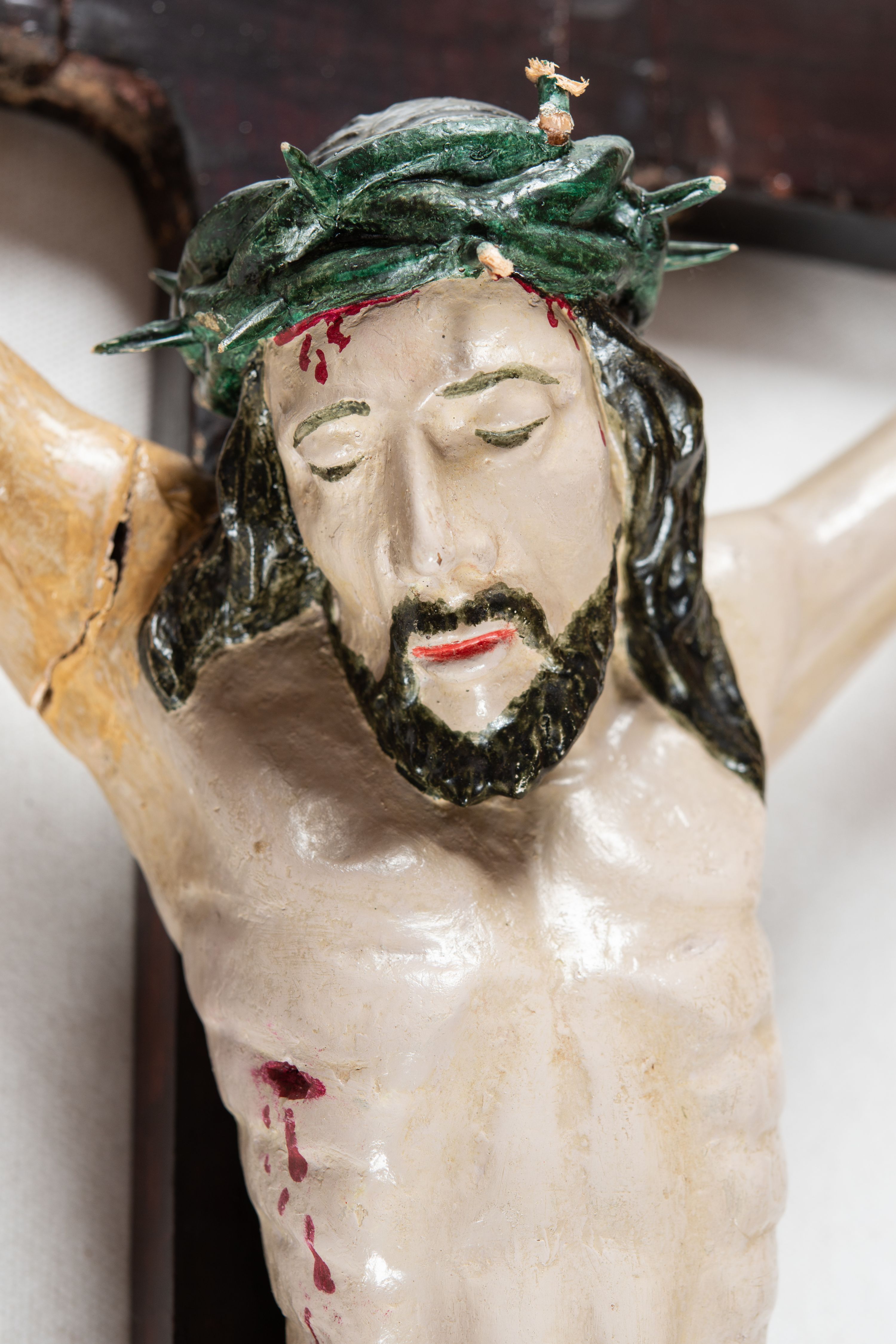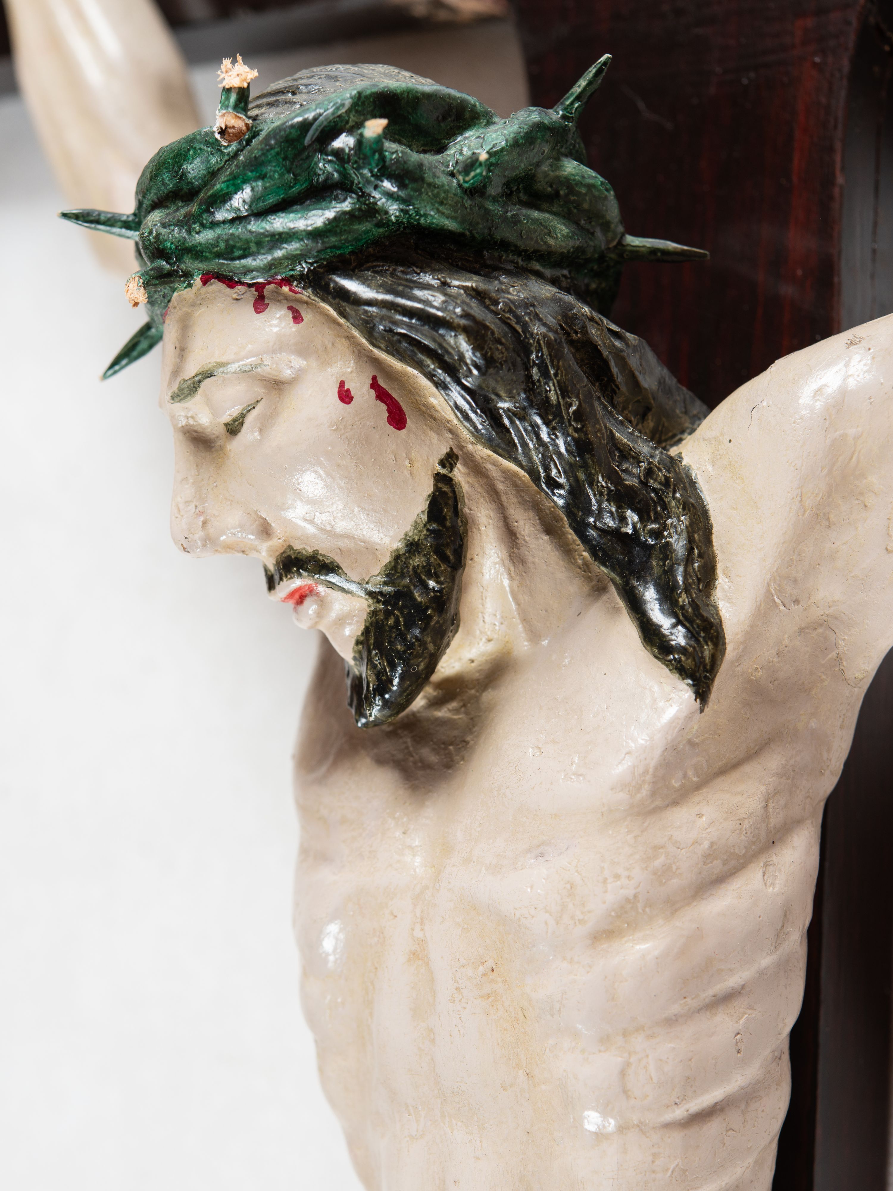 Krucyfiks reprezentuje osiemnastowieczną rzeźbę o charakterystycznym perizonium przewiązanym sznurem, odsłaniającym oba boki. Chrystus na krzyżu został ukazany w typie Cristo morte z zamkniętymi oczami i delikatnie otwartymi ustami.