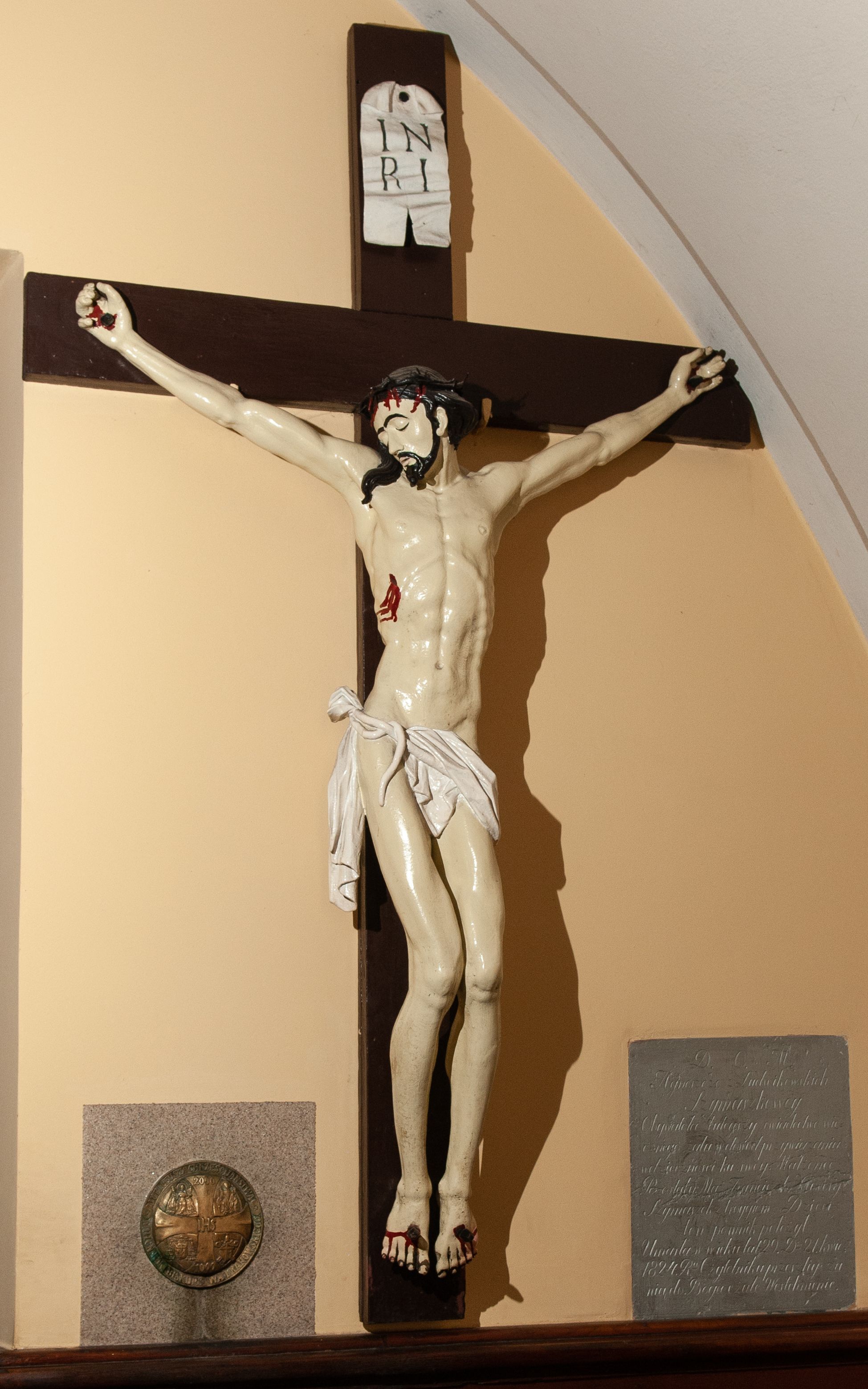 Wizerunek Chrystusa przybitego czterema gwoździami do krzyża. Ciało szczupłe, wydłużone, wyprostowane, o wyraźnie zaznaczonej linii żeber, długie ręce rozciągnięte powyżej głowy, nogi delikatnie ugięte w kolanach, stopy przybite obok siebie. Głowa opada na prawy bark. Jezus ma podłużną, szczupłą twarz, oczy zamknięte, usta rozchylone, nos prosty. Na jasnej karnacji silnie odznaczają się ciemne brwi, krótkie wąsy oraz broda. Układające się w fale włosy opadają na plecy i prawy bark. Na głowie cienka, czarna korona cierniowa. Biodra otacza białe perizonium ułożone w sztywne fałdy, przewinięte z przodu i zwisające przy prawym udzie, przytrzymane sznurem przewiniętym na prawym boku. W miejscach przebić gwoździami, przy koronie cierniowej oraz w ranie w boku ślady krwi. Krzyż gładki, ciemnobrązowy, na górnej belce titulus w formie rozwiniętego zwoju z literami „IN/RI” (łac. Iesus Nazarenus Rex Iudaeorum). Polichromia w partiach ciała naturalistyczna.
