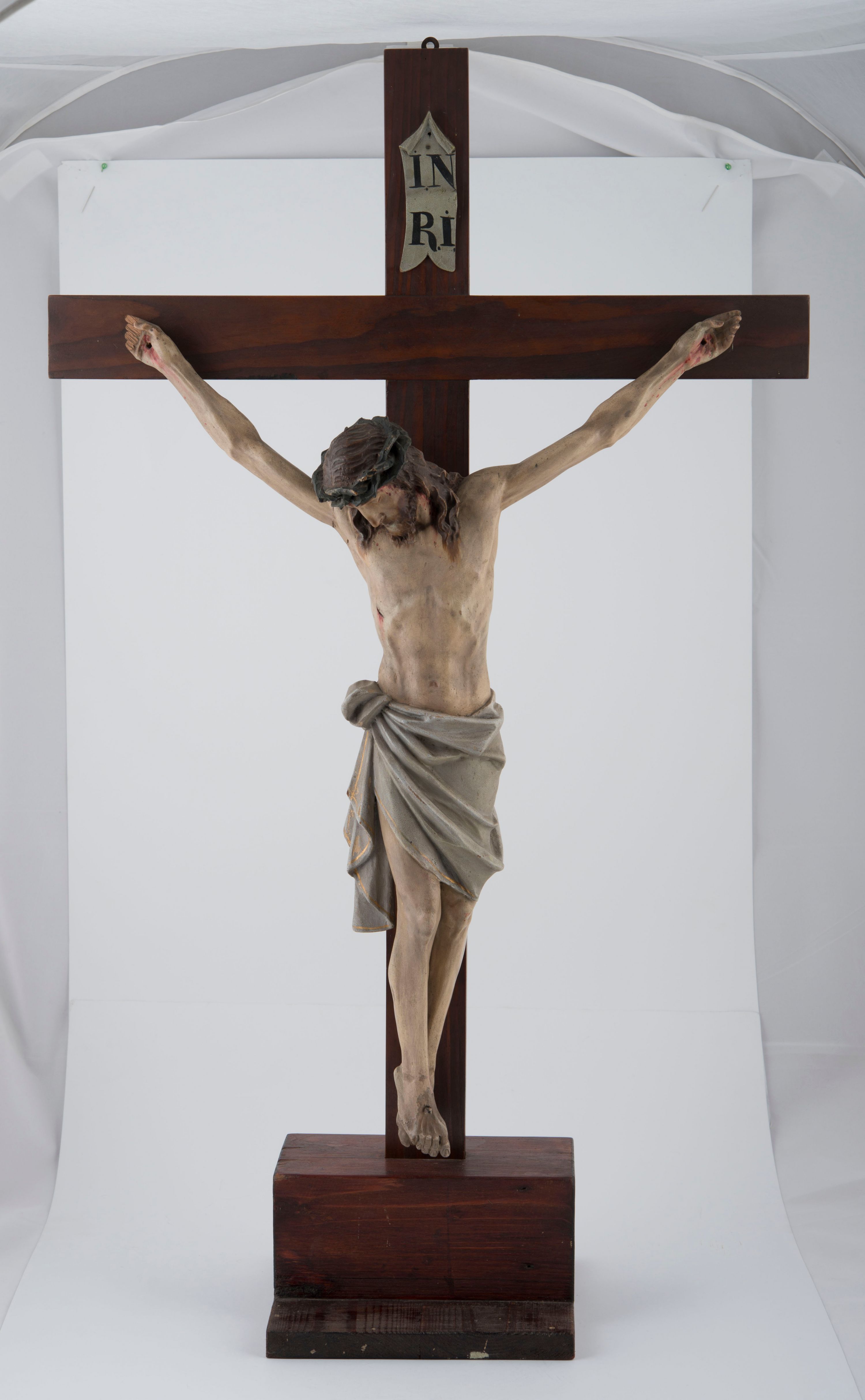 Pełnoplastyczna, polichromowana figura Chrystusa na krzyżu. Sylwetka zmarłego jest smukła, o naturalnej karnacji, z wyraźnie zaznaczoną muskulaturą i układem kostnym. Ramiona uniesione do góry tworzą łuk, nogi są lekko skręcone w lewo. Głowa opada na prawe ramię, twarz pociągła, oczy zamknięte, nos prosty, usta zamknięte, blade. Na ramiona spływają pasma długich włosów, krótka broda dotyka torsu. Na głowie gruba, zielona korona cierniowa, biodra przewiązane białym, krótkim perizonium ze złotym paskiem przy brzegu, związanym w węzeł na prawym biodrze i opadającym pionowymi fałdami. Na ciele Chrystusa mało widoczne są ślady męki: przebity bok, dłonie oraz stopy. Nad głową titulus z napisem „IN/RI”.