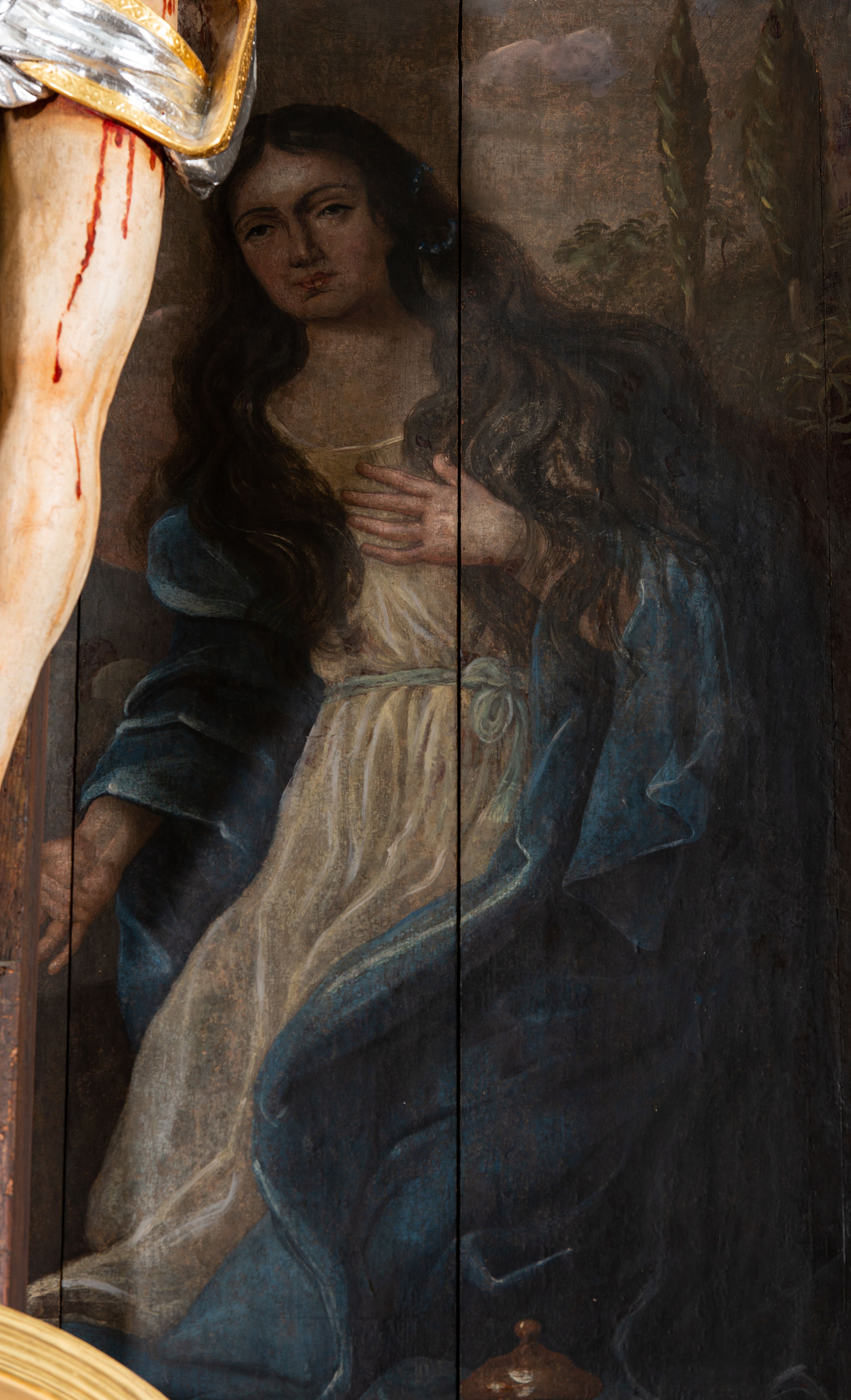 Pole główne ołtarza bocznego prawego wypełnia krucyfiks umieszczony na tle rozległego widoku z murami Jerozolimy i postacią klęczącej pod krzyżem Marii Magdaleny. Komponowanie przedstawienia złożonego z rzeźby i obrazu to znany zwyczaj – podobna kompozycja pojawiła się w kościele Bożego Ciała w Krakowie oraz w kościele Reformatów w Węgrowie.