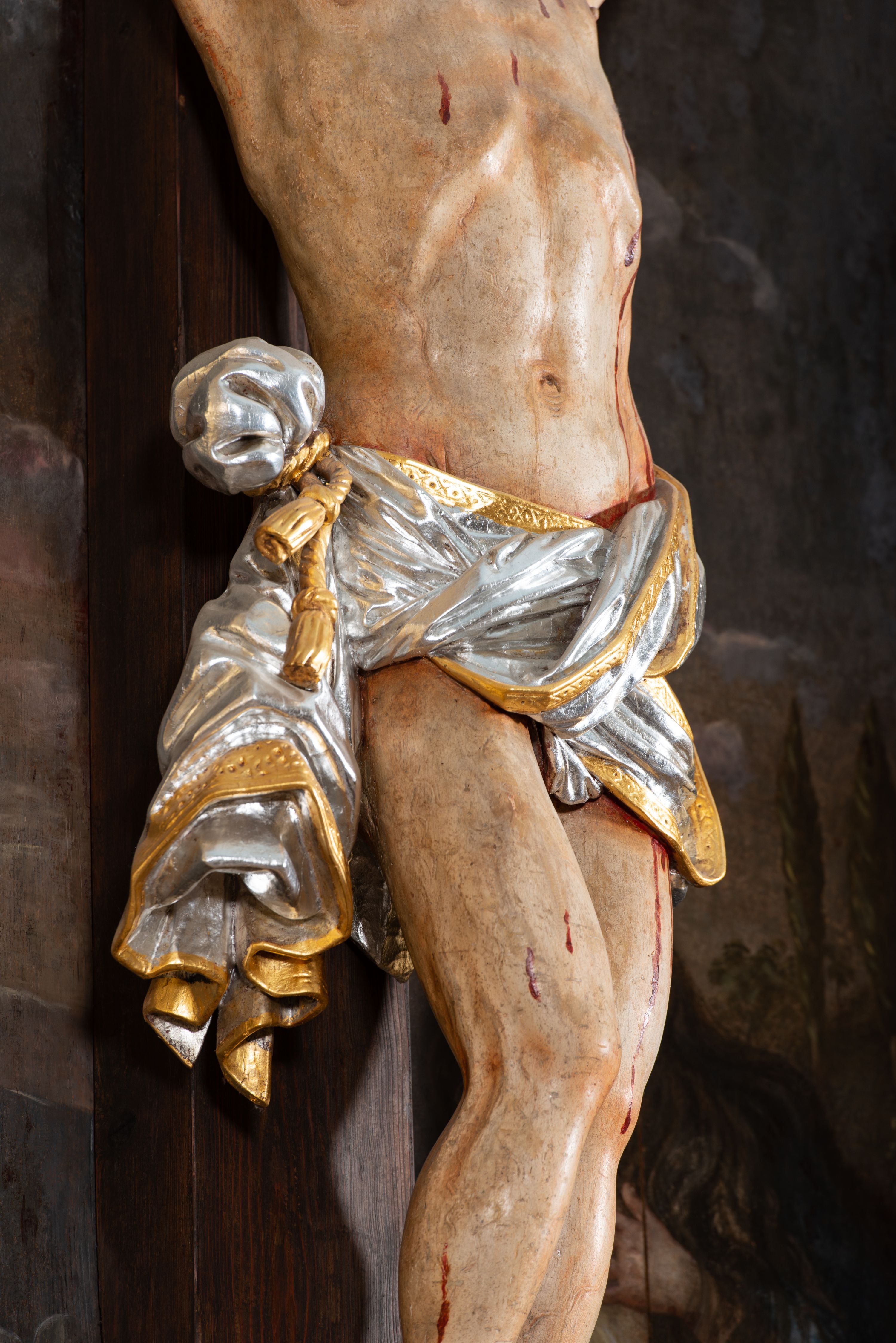 Kompozycję z krucyfiksem w centrum pola obrazowego znaleźć można w kościele Bożego Ciała w Krakowie oraz w kościele Reformatów w Węgrowie. Jednak tło tych ołtarzy w obu przypadkach jest gładkie – w kościele krakowskim widnieje tylko delikatny relief w złocie, natomiast w Węgrowie Andreas Schlüter zrezygnował z dodatkowych zdobień, umieszczając krzyż z Chrystusem na czerwonym tle. Figura została wykonana według schematu popularnego w sztuce nowożytnej – stopy przybite są dwoma gwoździami, a na ciele nie widać oznak cierpienia (obecnie są dość wyraźne, lecz jest to efekt konserwacji wykonanej po 1971 roku). Krótkie, udrapowane perizonium, związane na prawym boku w finezyjny węzeł, zakończone jest spływającą kaskadowo tkaniną. Fałdowanie jest stosunkowo płytkie, tkanina bardzo przestrzenna, momentami ażurowa. Ciało Chrystusa wykonane jest bardzo starannie, z dbałością o poprawność anatomiczną.