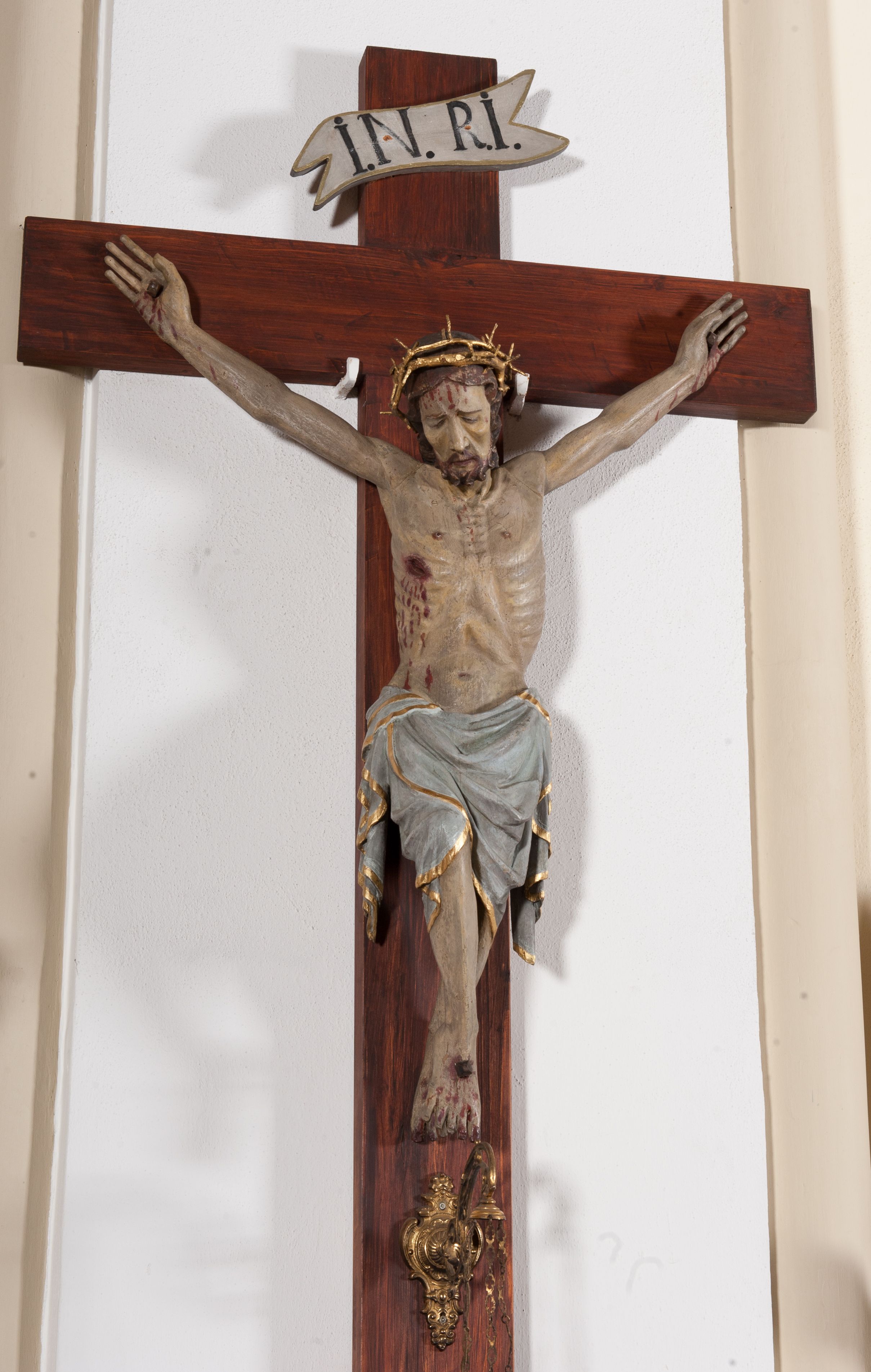 Nazwa krucyfiks pochodzi od łacińskiego słowa „crucifixus” i oznacza „przybity do krzyża”. Nad głową Zbawiciela znajduje się titulus, czyli tabliczka z napisem winy, skróconym do liter INRI (łac. Iesus Nazarenus Rex Iudaeorum), czyli Jezus Nazarejczyk Król Żydów, zgodnie z opisem w Ewangelii św. Jana: „Wypisał też Piłat tytuł winy i kazał go umieścić na krzyżu. A było napisane: «Jezus Nazarejczyk, Król Żydowski». Ten napis czytało wielu Żydów, ponieważ miejsce, gdzie ukrzyżowano Jezusa, było blisko miasta. A było napisane w języku hebrajskim, łacińskim i greckim. Arcykapłani żydowscy mówili do Piłata: «Nie pisz: Król Żydowski, ale że On powiedział: Jestem Królem Żydowskim». Odparł Piłat: «Com napisał, napisałem»” (J 19,19-22).
