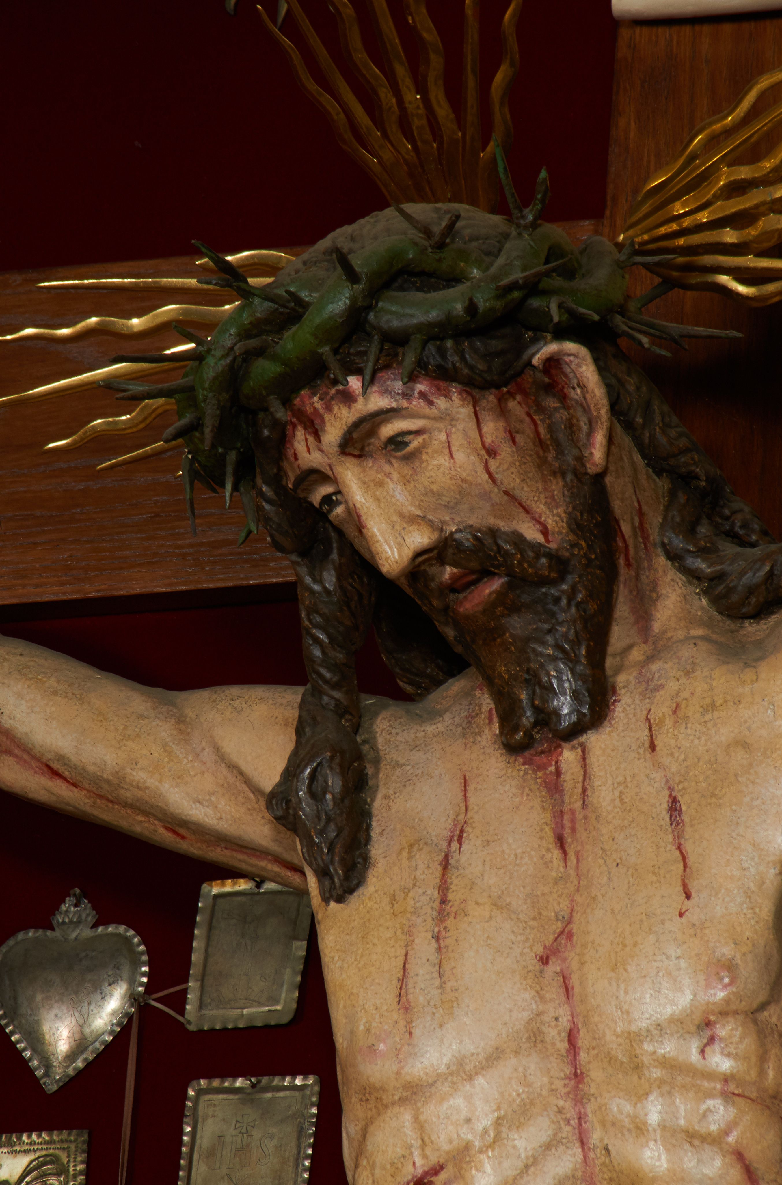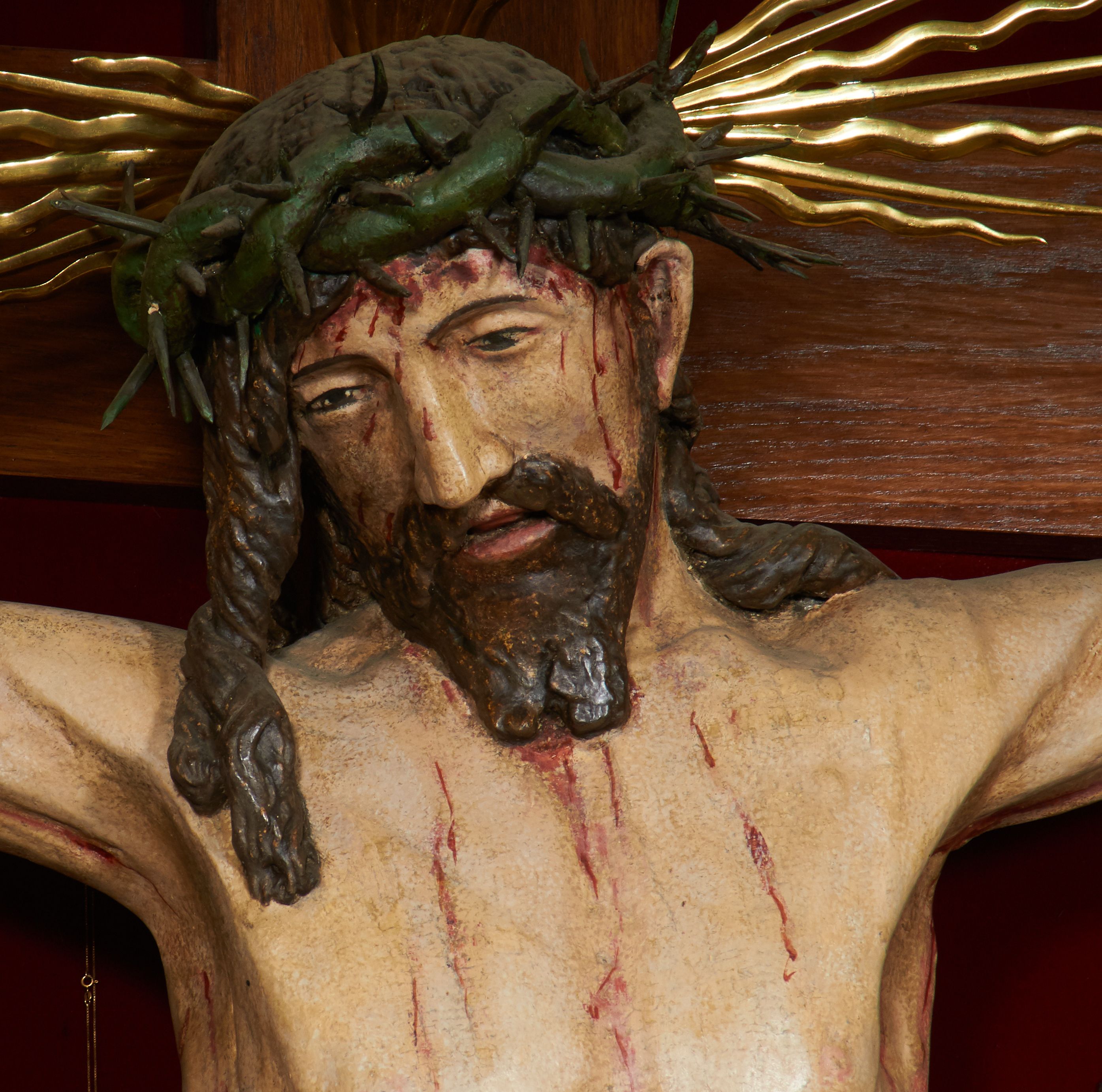 Krzyż drewniany o prostych ramionach z figurą w typie Cristo vivo przybitą trzema gwoździami. Sylwetka w lekkim zwisie, o szerokim rozłożeniu ramion, z głową przechyloną na prawe ramię; nogi ugięte w kolanach, skierowane w prawą stronę, stopy w układzie prawa na lewą. Twarz pociągła o wąskich, otwartych oczach, dużym nosie, otwartych ustach, okolona brodą oraz włosami skręconymi w rurkowate pukle. Na głowie korona cierniowa, wokół niej trzy wiązki promieni. Ciało wychudzone, o zaznaczonych mięśniach ramion i nóg oraz sumarycznie kształtowanej klatce piersiowej z podkreślonymi liniami żeber i wypukłością brzucha oraz ze śladami męki w postaci rzeźbionych kropel krwi wypływającej z ran. Perizonium krótkie, ściśle opinające biodra, zawiązane w partii podbrzusza, ze zwisem na prawym biodrze. Na górnym zakończeniu pionowej belki krzyża banderola z napisem „INRI”. Ciało polichromowane naturalistycznie, perizonium pozłacane.