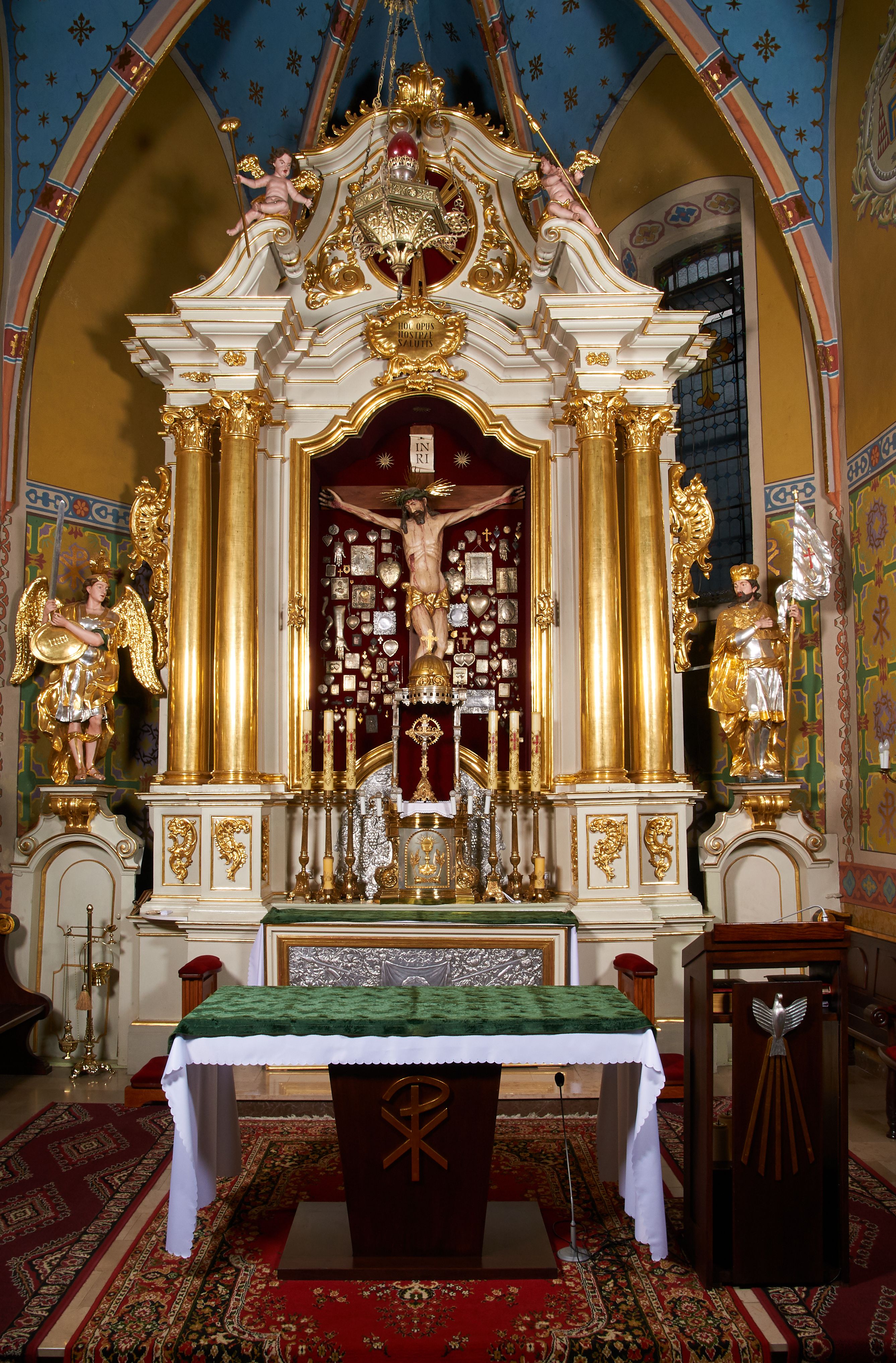 Późnogotycka figura Chrystusa Ukrzyżowanego powstała najpewniej na przełomie XVI i XVII wieku. Prawdopodobnie pierwotnie była umieszczona na łuku tęczowym kościoła. W związku z cudami, jakimi słynęła podczas modernizacji wnętrza świątyni została wmontowana do nowo wybudowanego około 1766 roku ołtarza głównego, w którym znajduje się do dziś.