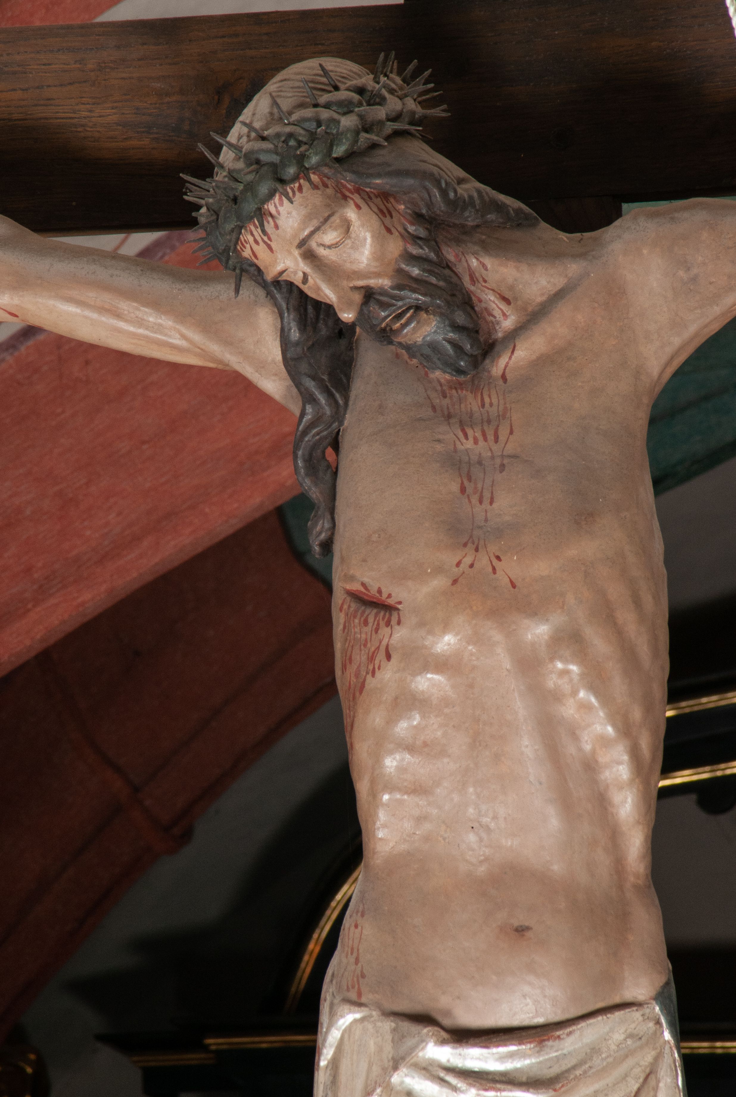 Chrystus wiszący na ramionach łagodnym łukiem rozpostartych na krzyżu, o smukłej sylwecie, z nogami skrzyżowanymi, lekko ugiętymi w kolanach. Ciało zmarłego Chrystusa ukazane jest realistycznie, z głową silnie przechyloną na prawe ramie, zamkniętymi oczami, długim nosem i otwartymi ustami. Twarz okala krótka, spiczasta broda i wąsy, włosy opadają na kark i klatkę piersiową, na głowie korona cierniowa w kształcie skręconego sznura z kolcami. Klatka piersiowa o owalnym obrysie, z zaznaczonymi żebrami. Stosunkowo długie perizonium, zdobione srebrzeniem na pulmencie, układa się z przodu łukowatymi fałdami i spływa z bioder dekoracyjnie traktowanymi zwisami. Na ciele widoczna rana od włóczni, z niej i z ran na rękach i nogach widoczne spływające strużki krwi.