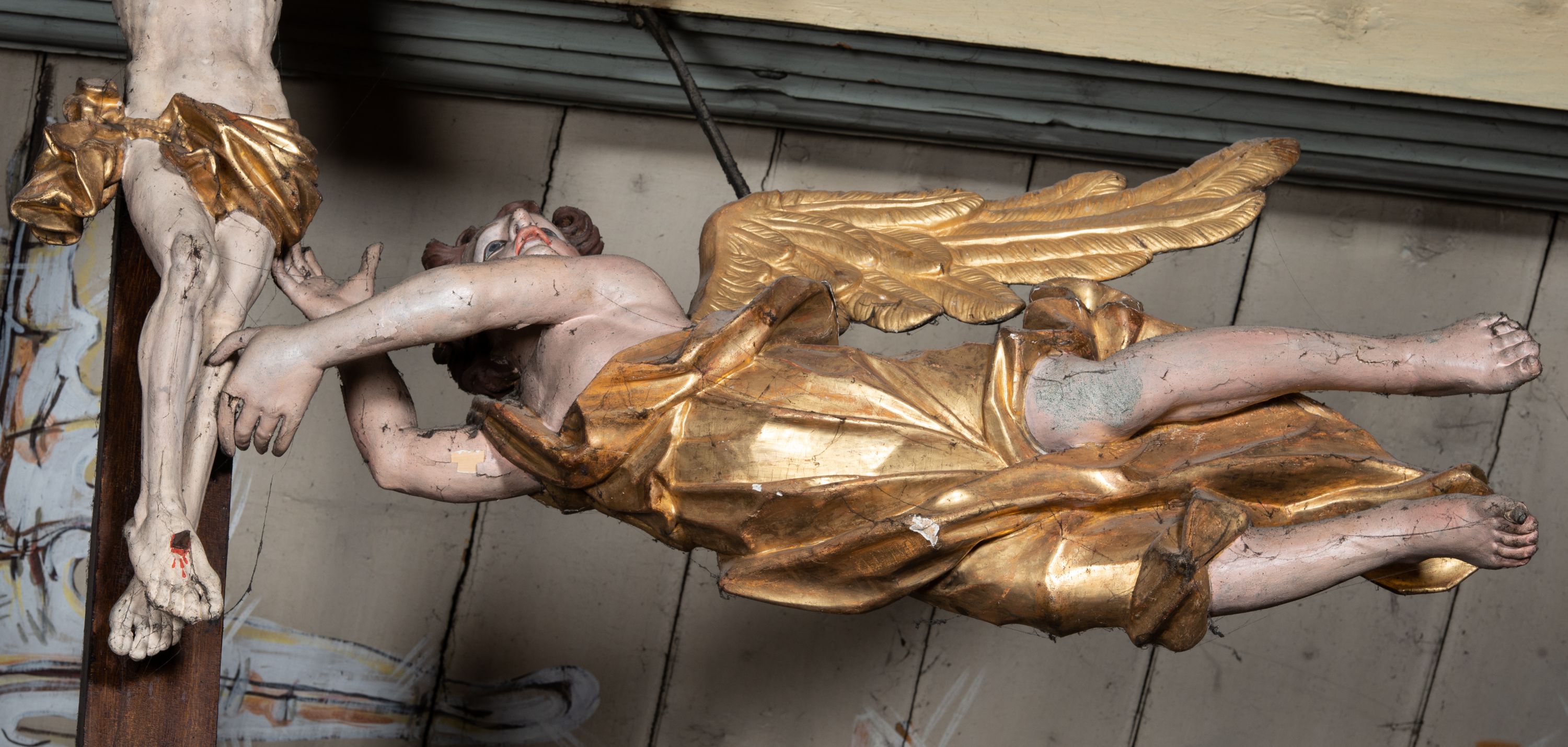 Rzeźbiarska grupa Ukrzyżowania, przedstawiająca przybitego do krzyża Chrystusa podtrzymywanego przez trzy anioły. Figura Chrystusa ścięta z tyłu, przybita do krzyża trzema gwoździami, głowa opadła na prawe ramię, ramiona szeroko rozłożone w delikatnym zwisie. Ciało szczupłe, o wyraźnie podkreślonej anatomii, wydatna klata piersiowa z delikatnie zaznaczoną linią żeber. Twarz o sumarycznie opracowanych rysach, z krótkim, ciemnobrązowym zarostem, dużymi ustami i zamkniętymi oczami. Włosy długie, ciemnobrązowe, falowane, opadające na plecy i prawe ramię grubymi lokami. Na głowie złocona korona cierniowa. Na biodrach krótkie, złocone, przewiązane sznurem perizonium z węzłem i krótkim zwisem na prawym boku. Na czole, dłoniach, stopach i prawym boku delikatne strużki krwi. Kolorystyka ciała naturalistyczna. Krzyż polichromowany na ciemny brąz, nad głową Chrystusa złocony titulus w formie podłużnej banderoli z napisem „IN / RI”. Po prawej stronie, w połowie wysokości dolnej części pionowej belki pełnoplastyczna figura anioła, unoszącego się w powietrzu, z rękami zwróconymi do podtrzymywania krucyfiksu. Głowa w trzech czwartych skierowana w lewo, odchylona do tyłu. Twarz owalna, o wyrazistych rysach, z mocno zaróżowionymi policzkami. Włosy krótkie, kręcone i brązowe. Ubrany jest w złoconą szatę odsłaniającą ramiona, fragment klatki piersiowej i nogi do wysokości kolan. Na plecach ma duże, złocone skrzydła. Belka pozioma flankowana parą przeciwstawnych, unoszących się w powietrzu, pełnoplastycznych putt, podtrzymujących dłońmi krawędzie poziomej belki krzyża. Główki zwrócone frontalnie, twarze o zaokrąglonych, pełnych, wyrazistych rysach i zarumienionych policzkach z dużymi oczami. Włosy krótkie, kręcone i brązowe. Ciała nagie, o zaokrąglonych kształtach, z rozwianymi na plecach, niewielkimi, złoconymi płaszczami i parami małych skrzydełek. Polichromia w odsłoniętych partiach ciała naturalistyczna, szaty i detale złocone.