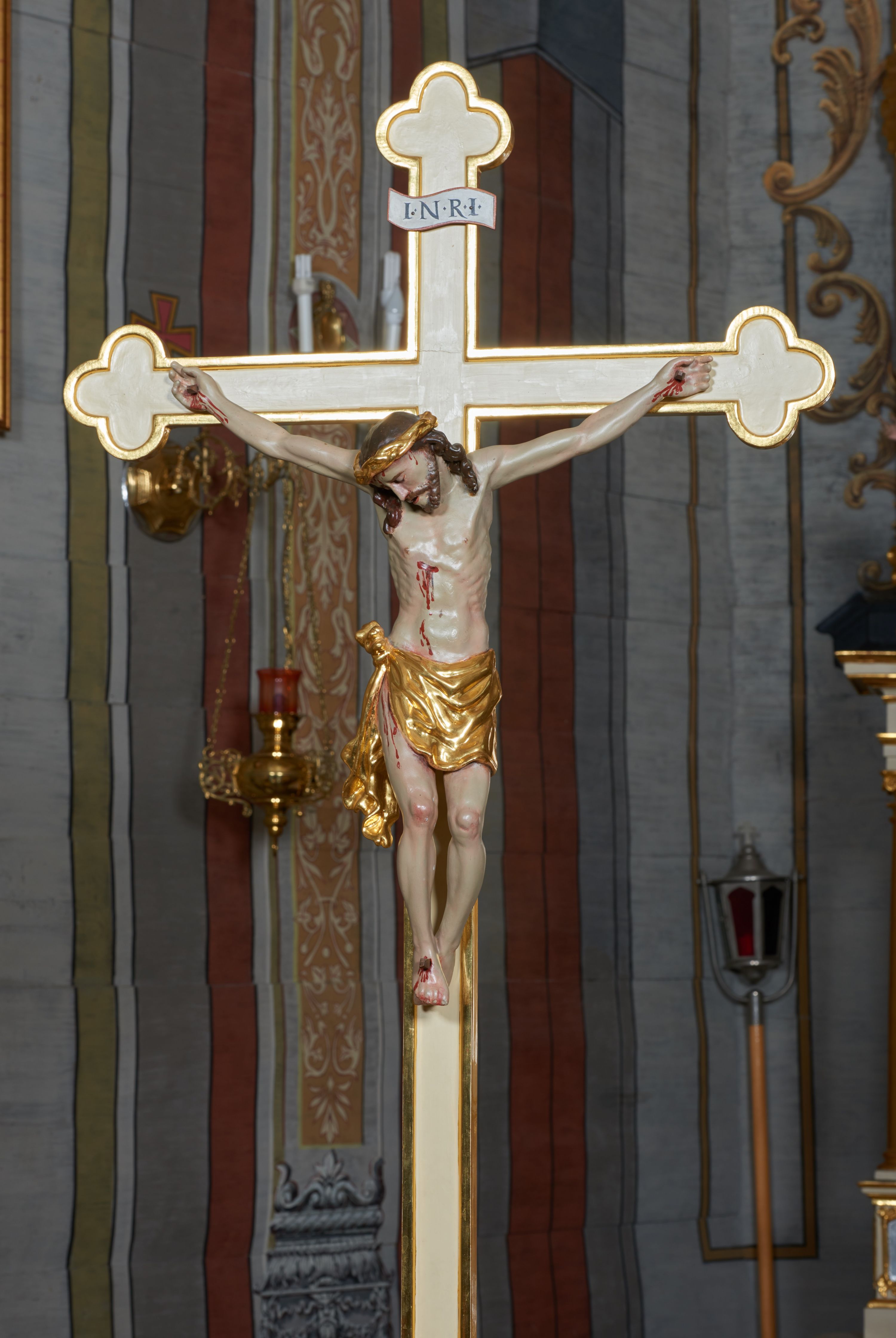 Nazwa krucyfiks pochodzi od łacińskiego słowa „crucifixus” i oznacza „przybity do krzyża”. Krzyż jest niesiony na początku każdej procesji. Ten zwyczaj, jak wyjaśnił w swoim dziele z 1739 roku Protazy Newerani, symbolizuje kilka ważnych treści religijnych. Po pierwsze oznacza, że procesja podąża i jest zgromadzona w imię Jezusa Chrystusa Ukrzyżowanego. Po drugie, że postępując według napomnień św. Pawła, nabożeństwo zaczyna się w imię Jezusa. Po trzecie krzyż na początku procesji pokazywał, że ukrzyżowany Chrystus jest jej wodzem. I po czwarte, że procesja uprasza Boga Ojca o dane łaski w imię krzyża i w imię Jezusa Chrystusa, zgodnie z jego zachętą: „O cokolwiek byście prosili Ojca, da wam w imię moje” (J 16, 23). Omawiany krzyż został wykonany w XIX wieku.