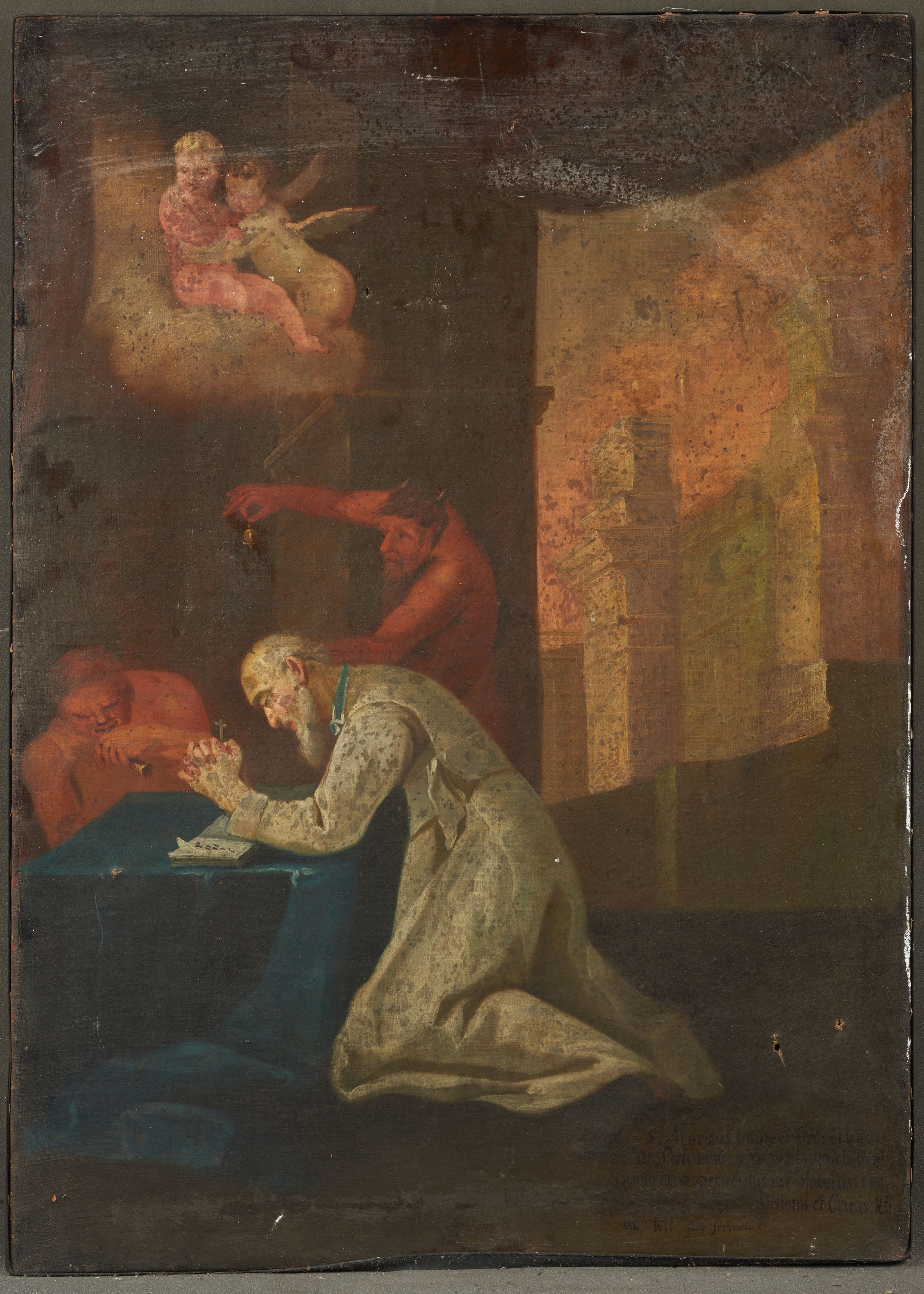 Obraz o kształcie stojącego prostokąta, przedstawiający św. Moricusa. Na pierwszym planie znajduje się ukazana bokiem postać klęczącego świętego, w pochylonej pozycji wpierającego na łokciach o stolik rękach złożonych do modlitwy. Pociągła twarz starszego mężczyzny okolona siwą brodą. Ubrany jest w błękitną suknię z szarym kołnierzem. Stolik o który opiera się święty przykryty jest zieloną tkaniną, a na nim stoi otwarta księga. Obok znajdują się dwa diabły, jeden wspierający się o blat tego samego stołu trzyma w ugiętych rękach piszczałkę, drugi stojąc za świętym w prawej uniesionej ręce trzyma dzwonek, a lewą opiera o ramię św. Moricusa. Diabły ubrane są w czerwono brązowe szaty. Powyżej stolika widnieją dwa siedzące na obłokach aniołki. Po prawej stronie pola obrazowego znajduje się okno z panoramą miejską. Tło obrazu w odcieniach brązu. W prawej dolnej krawędzi obrazu inskrypcja: „S Moricus Conessor Ords Crucig / de P[…] 1236 […] 30 marty sancte obyt / quem cum perseculus est diabolus con / […]ssionis et Crucis S / de vicit teste ferrario.”