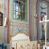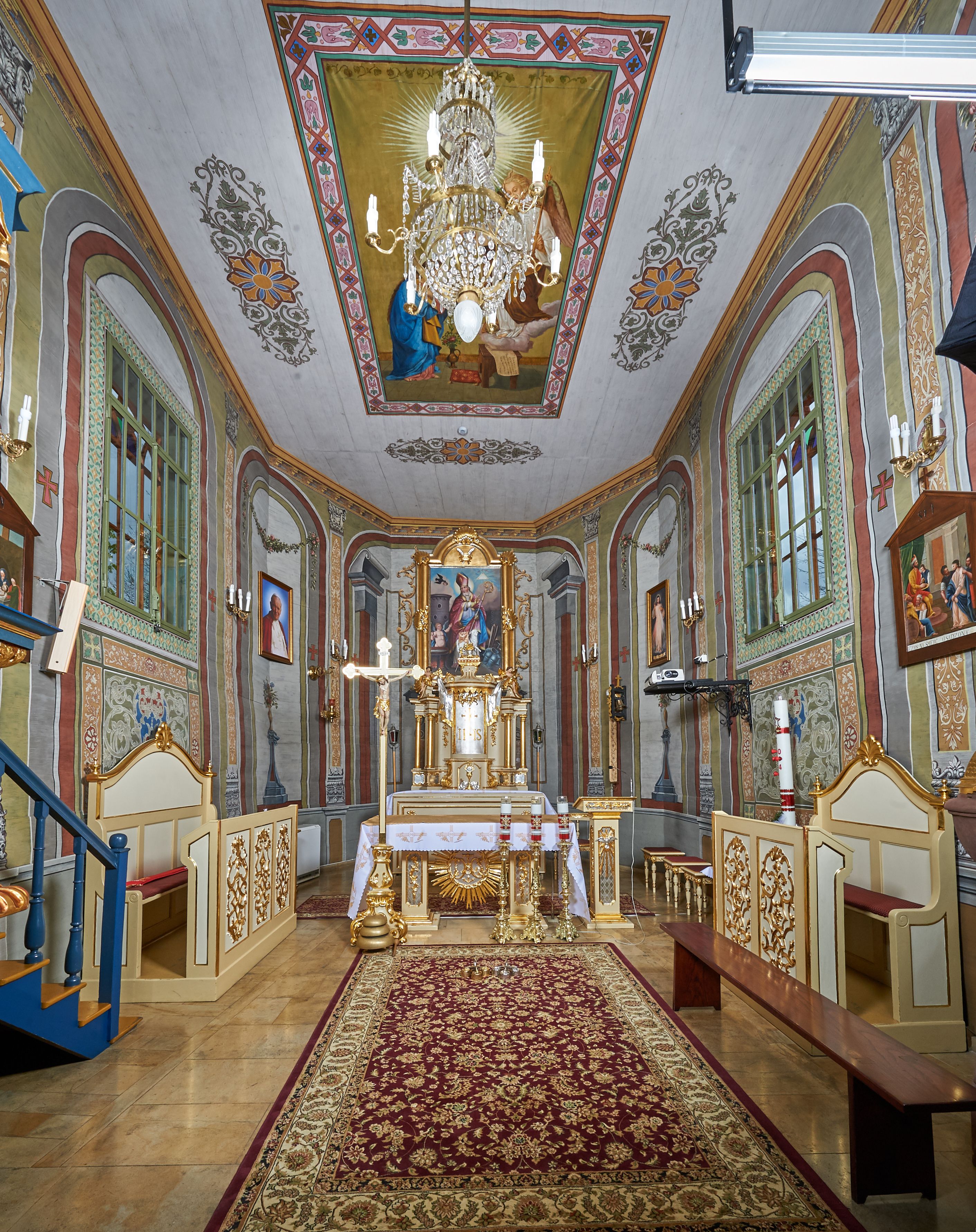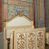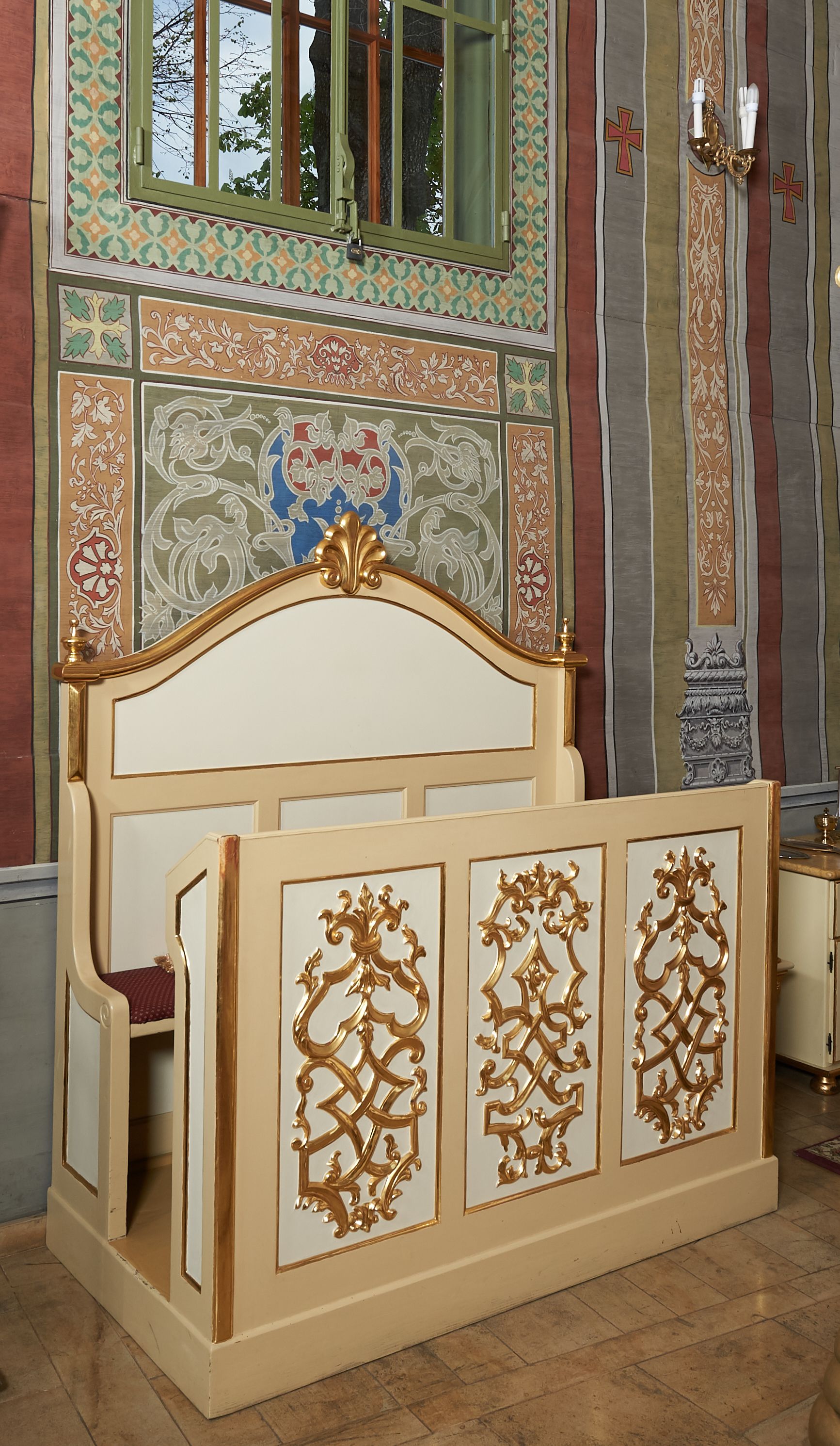 Ława ustawiona na niskim prostopadłościennym podeście, jednorzędowa, trójosobowa, z zapleckiem i z przedpiersiem, zwieńczona dwiema wolutami spinającymi pośrodku palmetę oraz małymi wazonikami ustawionymi na skrajach zaplecka. Przedpiersie przedzielone na trzy płyciny w kształcie stojących prostokątów zdobione w polu stylizowaną wicią z motywami ornamentu pseudoregencyjnego. Zaplecek przedzielony na dwie strefy; w dolnej zdobiony trzema kwadratowymi płycinami, w górnej płyciną w kształcie leżącego prostokąta zamkniętego od góry łukiem wklęsło-wypukłym.
