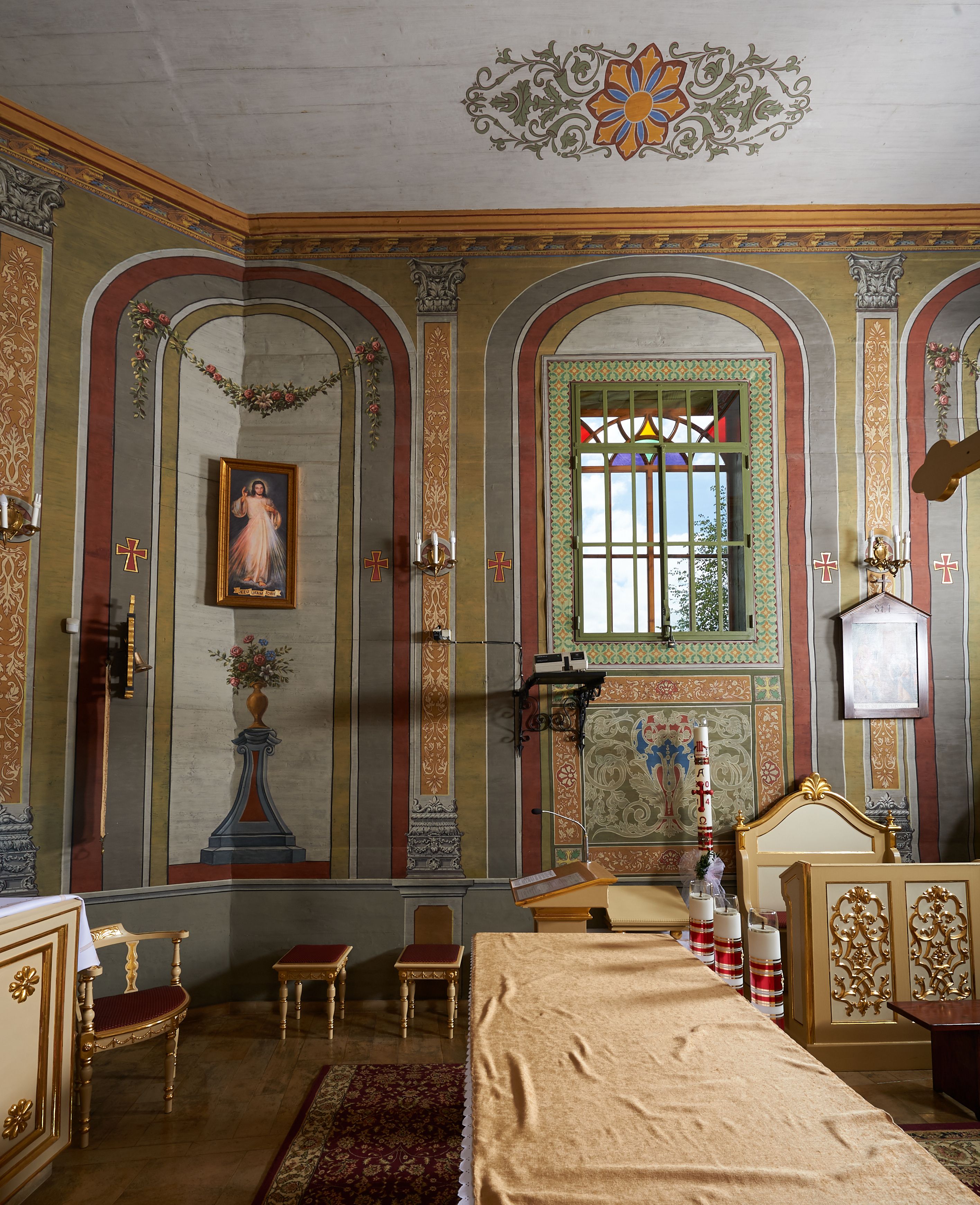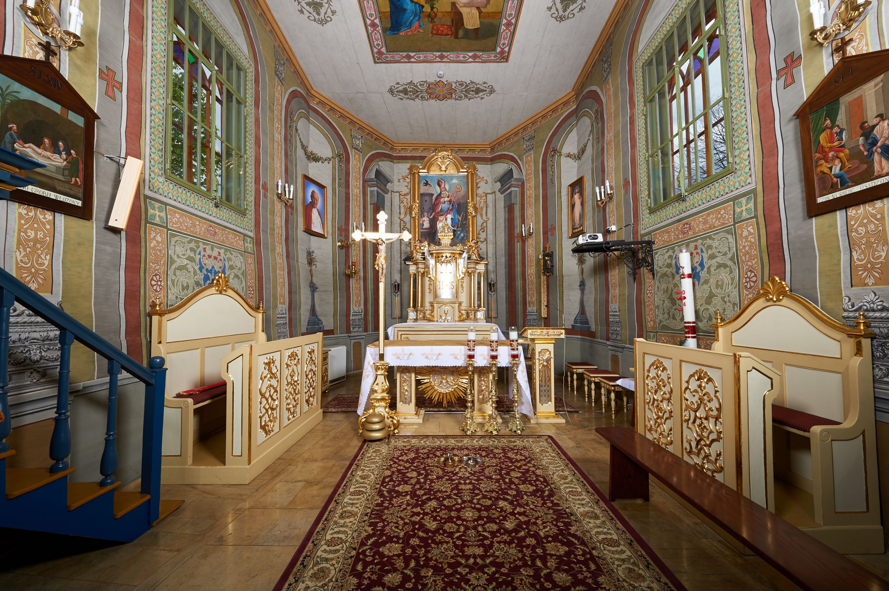 Ławka powstała w XIX wieku. Na przedpiersiu zdobiona jest pseudoregencyjnym ornamentem. Ławy ustawione w prezbiterium przeznaczone były dla duchowieństwa. Jej forma sięga genezą do rozbudowanych stall występujących w kościołach kolegialnych, katedralnych i klasztornych, które posiadały wysokie zaplecki i baldachimy.