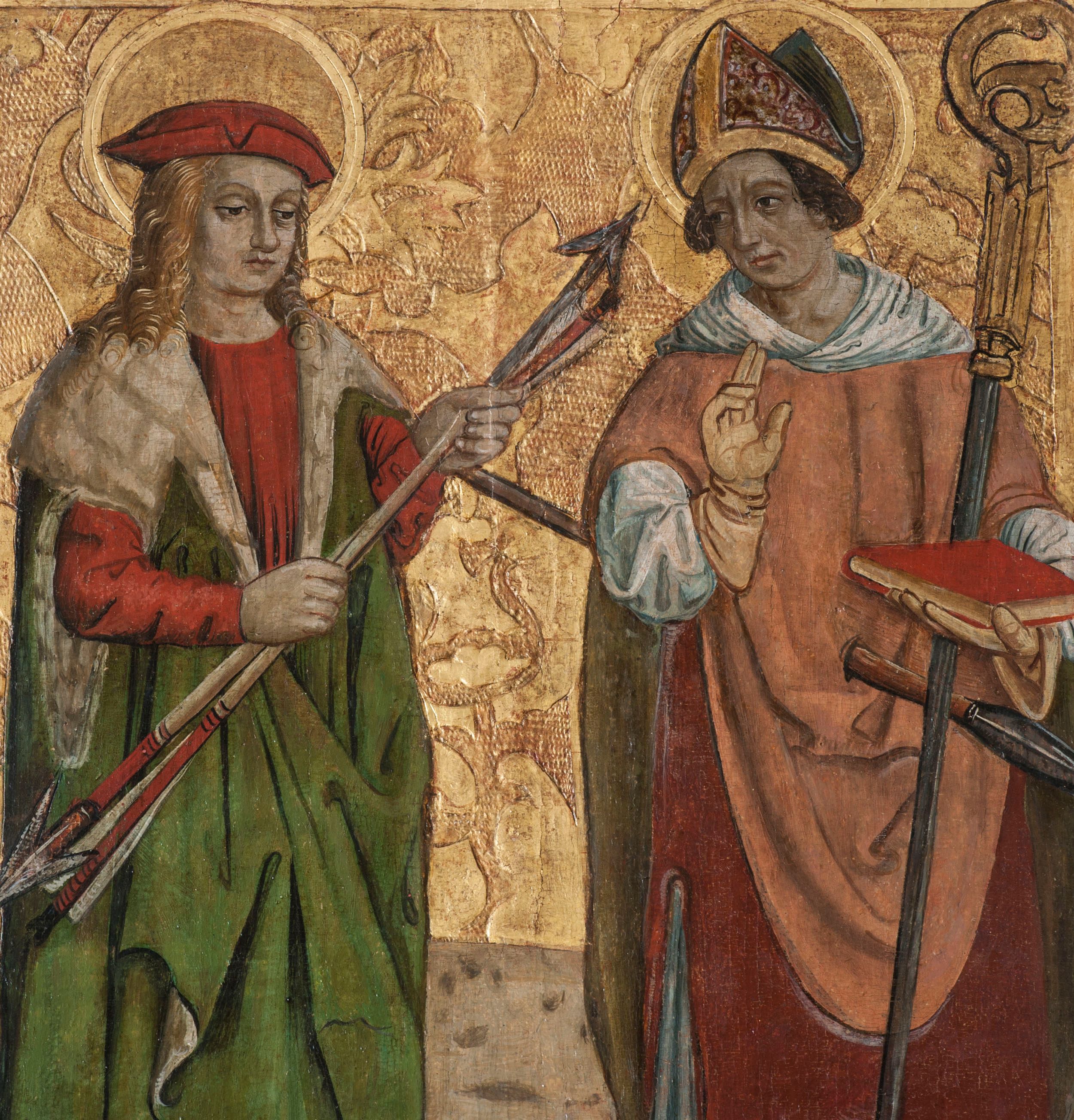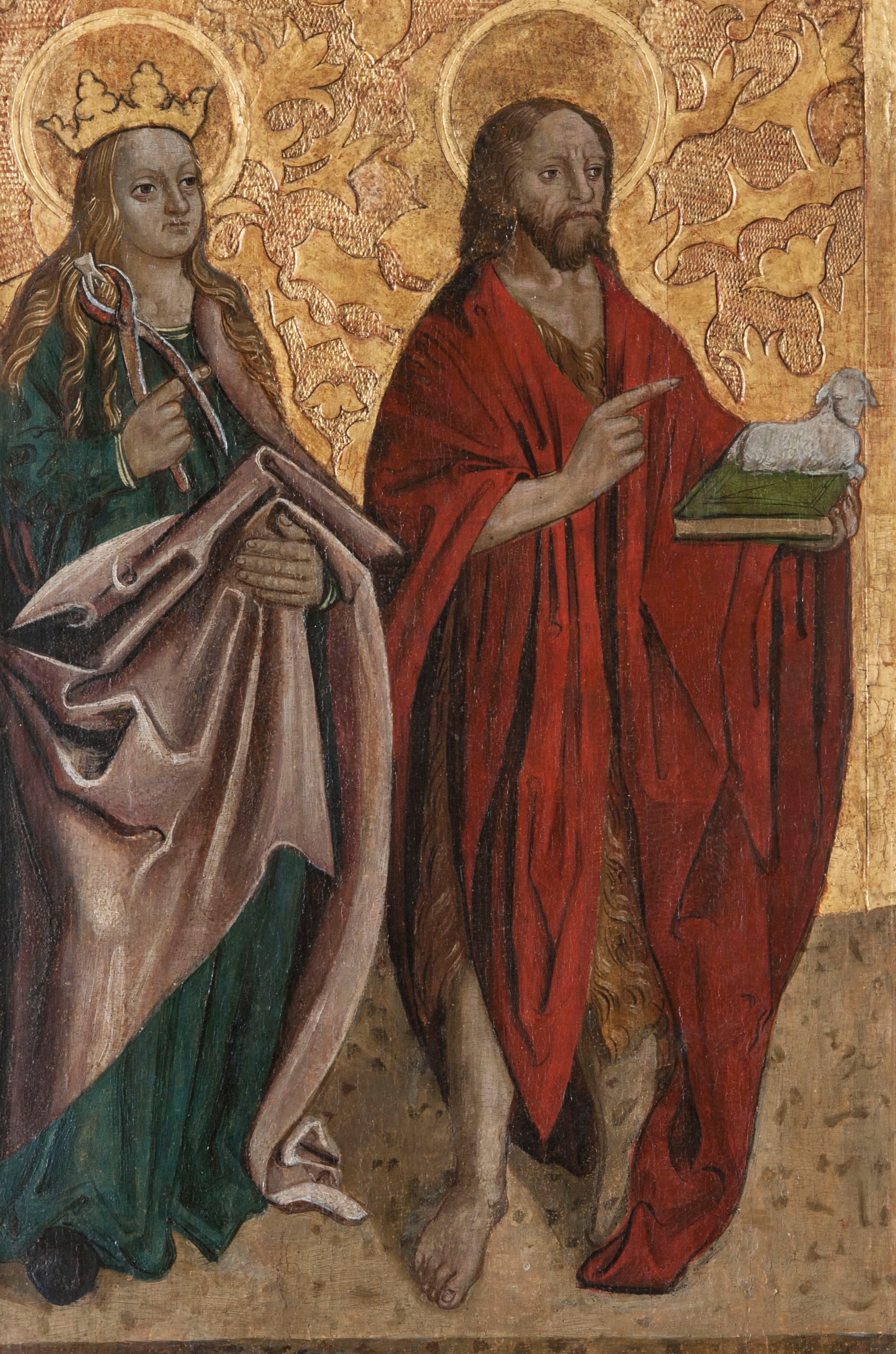 Lewe skrzydło tryptyku w kształcie stojącego prostokąta, podzielone poprzecznie na dwie kwatery. Na awersie w dolnej kwaterze św. Apolonia z obcęgami w prawej dłoni oraz św. Jan Chrzciciel z barankiem na księdze. W górnej kwaterze ukazani św. Sebastian ze strzałami w dłoniach oraz św. Wojciech przeszyty włócznią. Na rewersie w dolnej kwaterze scena Upadku pod krzyżem oraz data „1516”, w górnej kwaterze Chrystus przed Annaszem lub Kajfaszem. Na awersie rama profilowana, ozdobiona dekoracją imitującą skręcony sznur, od zewnątrz malowana na czerwono. Na rewersie rama prosta, srebrzona.