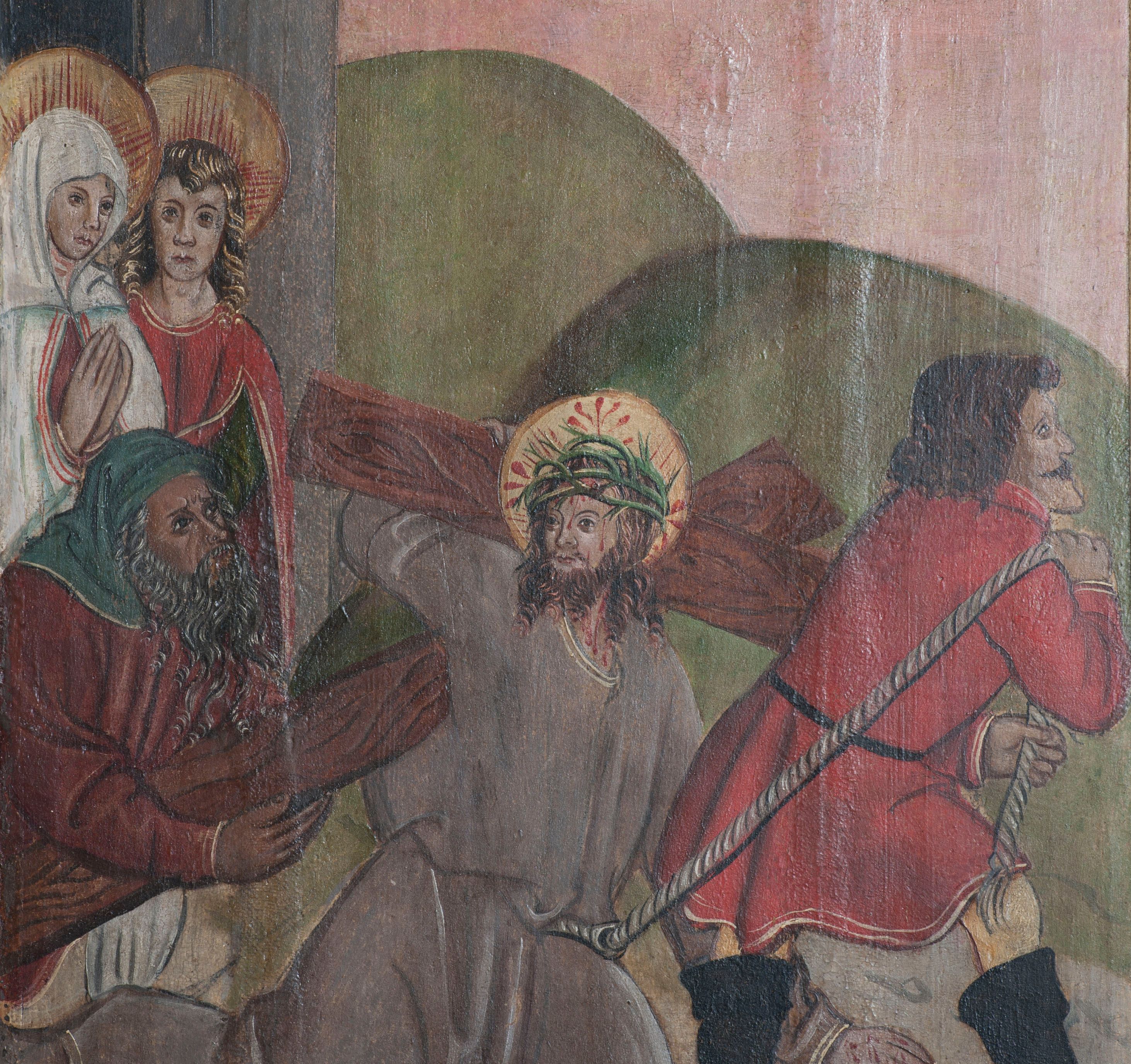 Umieszczona na kwaterze scena Upadku pod krzyżem oraz scena Biczowania z drugiego skrzydła zostały wykonane na podstawie rycin Hansa Schäufeleina z dzieła „Speculum passionis” Ulricha Pindera, które było wydane w Norymberdze w 1507 roku. Autor dzieła w kościele w Krempachach znacznie uprościł tło oraz zmniejszył liczbę postaci. Sceny te nasuwają skojarzenie z malarstwem ludowym. Podobne zabiegi upraszczania, wręcz wyraźnej prowincjonalizacji grafiki były często spotykane w pierwszej połowie XVI wieku.