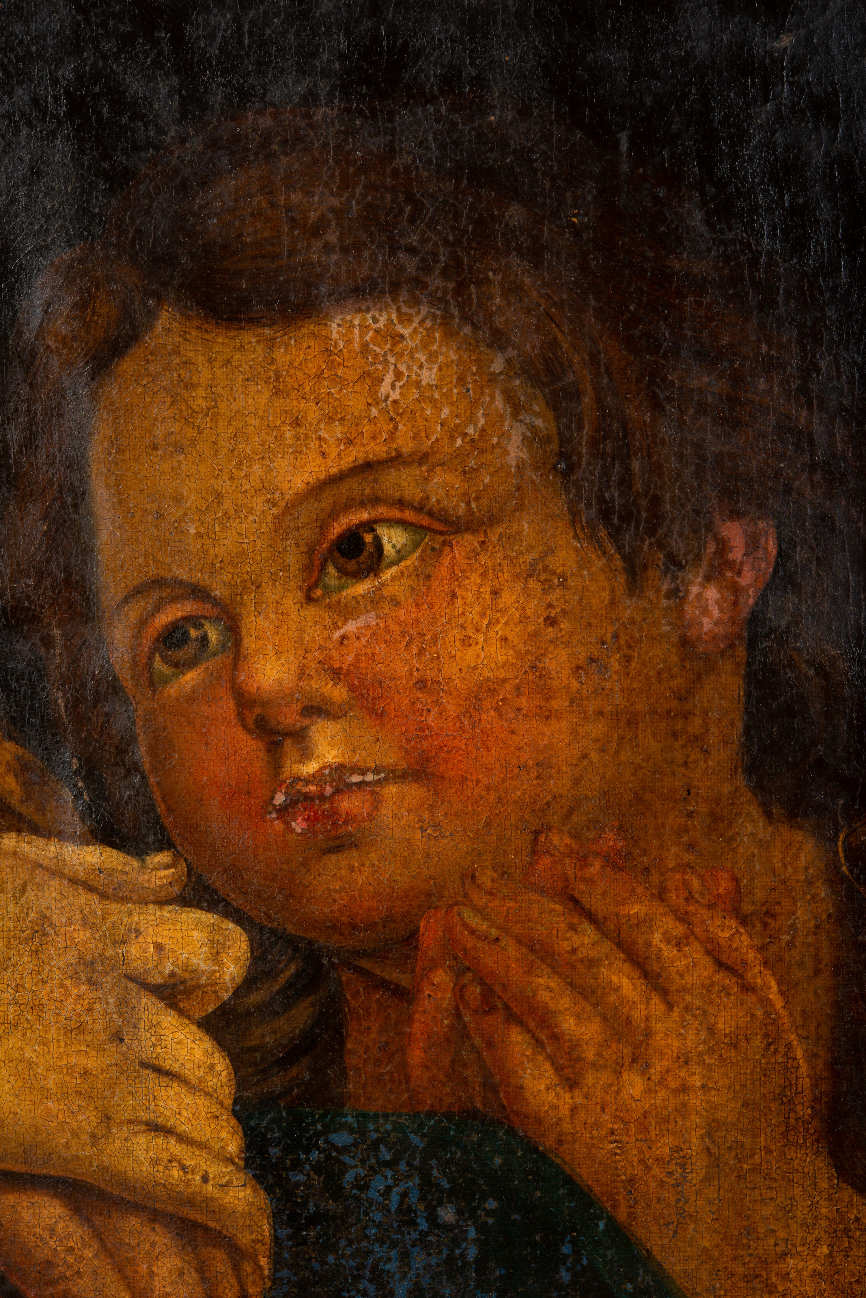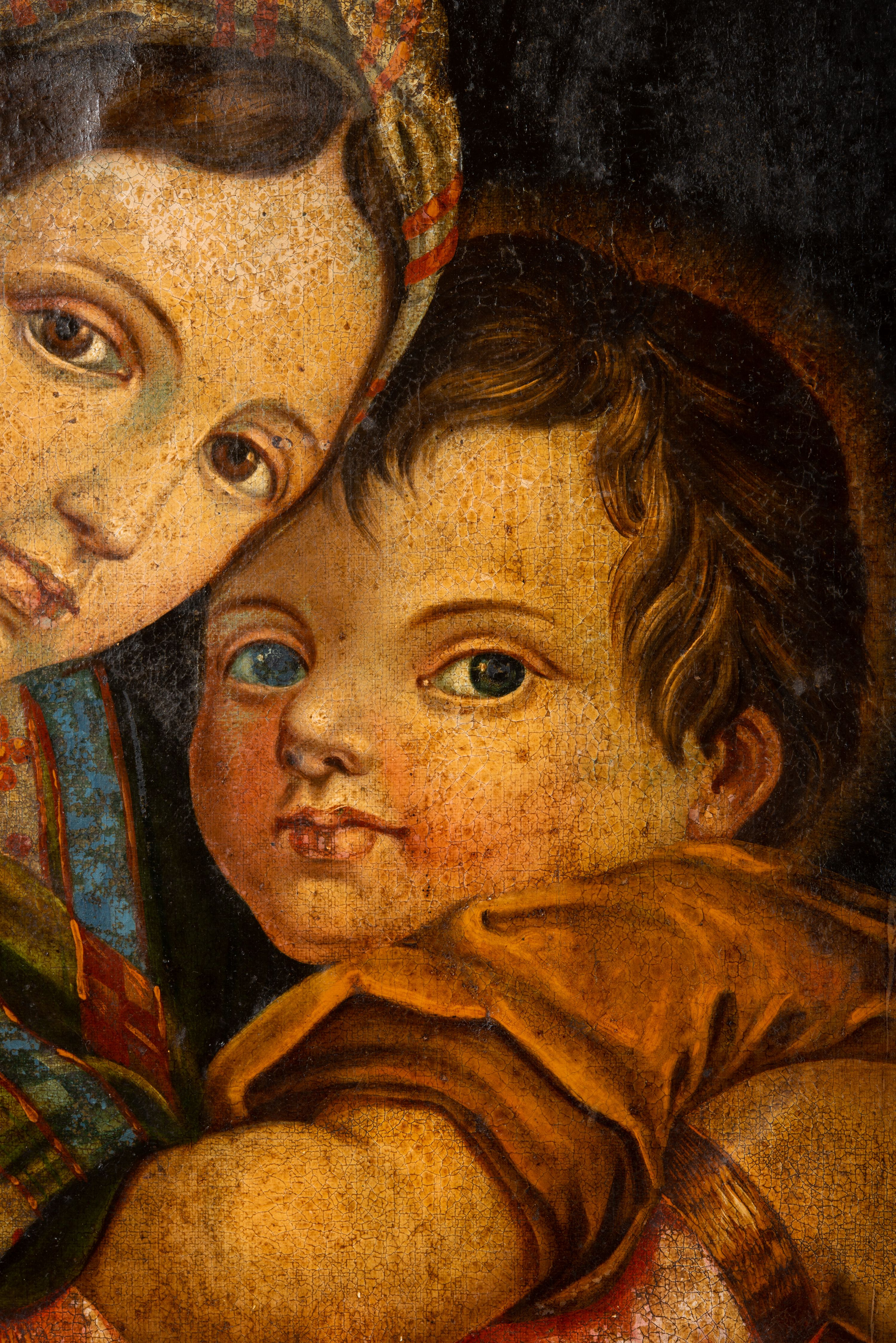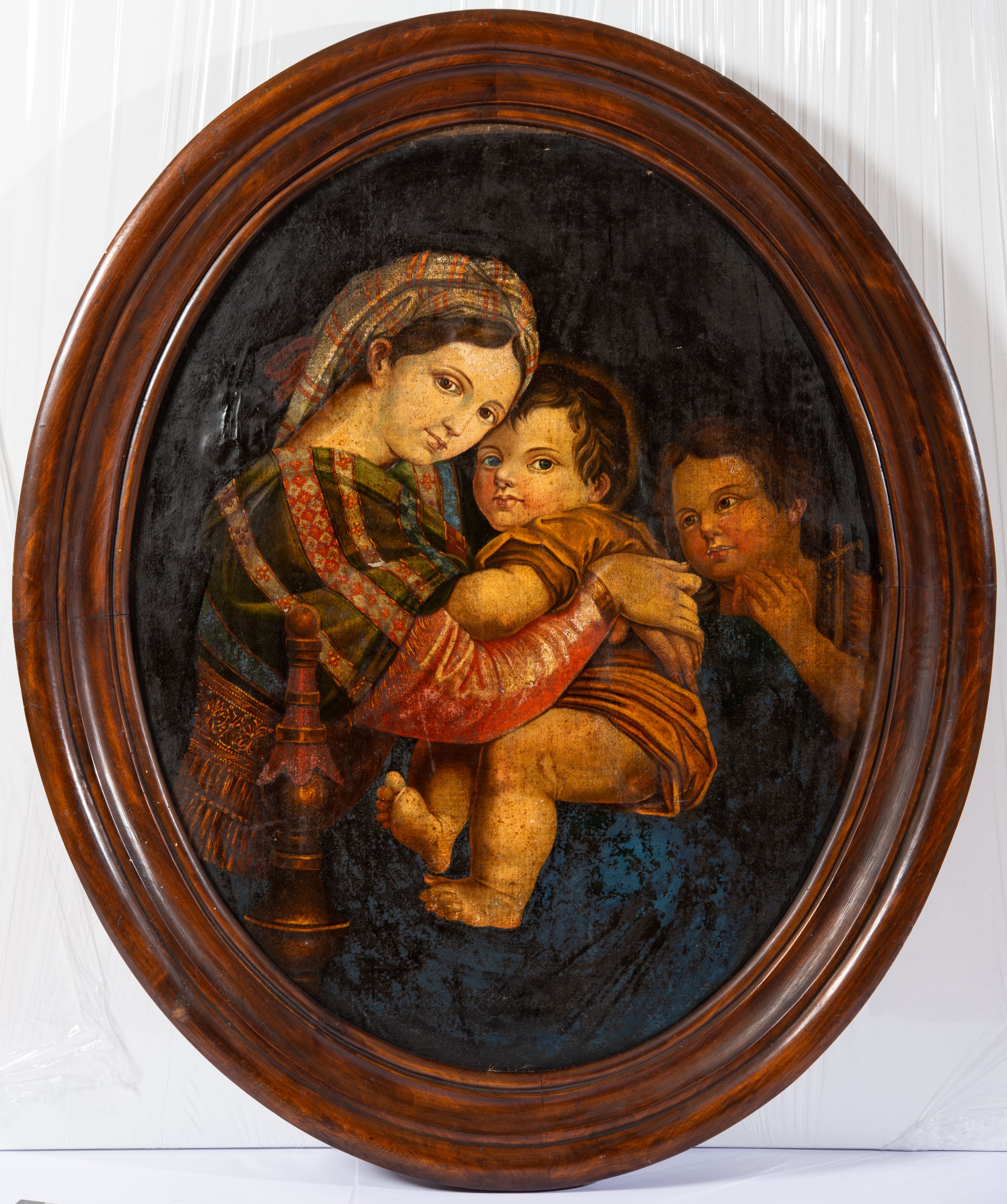 Obraz jest słabej jakości kopią dzieła Rafaela Santi pod tytułem „Madonna della seggiola”, czyli Madonny siedzącej na krześle, przechowywanego w Palazzo Pitti we Florencji i należącego do zbiorów rodziny Medyceuszy. Dzieło, które datuje się na lata 1513-1514, zostało pomyślane jako tondo, czyli zakomponowane w kształt koła. Malarz próbując odtworzyć jedno z najlepiej znanych dzieł Rafaela zdecydował się na skopiowanie go na owalne płótno, w wyniku czego zagubił intymność sceny. Nie poradził sobie z powtórzeniem skomplikowanych skrótów ciał, ani relacji między postaciami. Zachował w większości kolorystykę i ułożenie szat. Patrząc na obraz można jednoznacznie przywołać jego pierwowzór, jednak jest to tylko jego słaba imitacja.