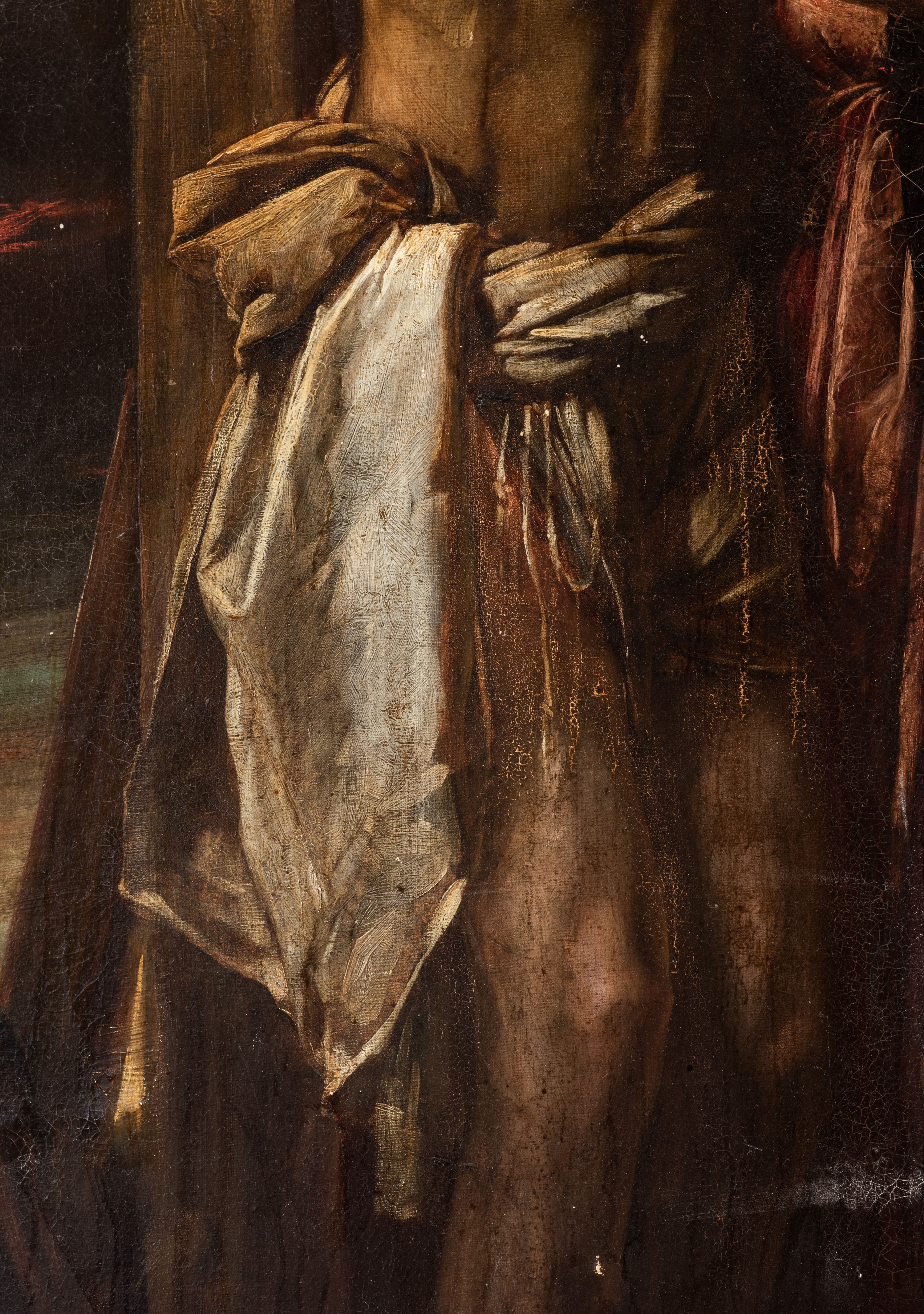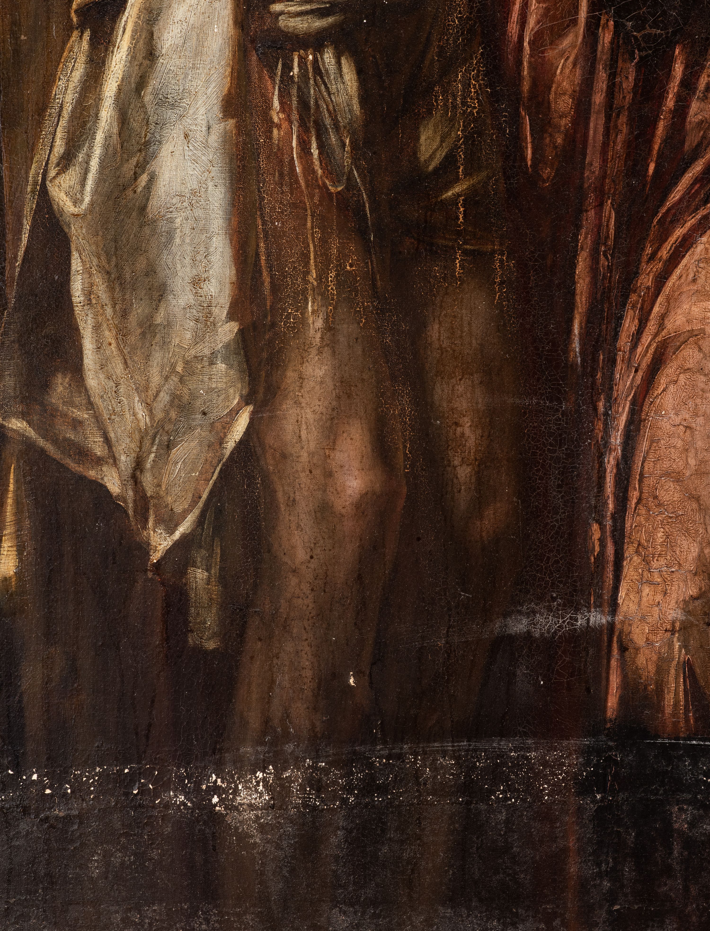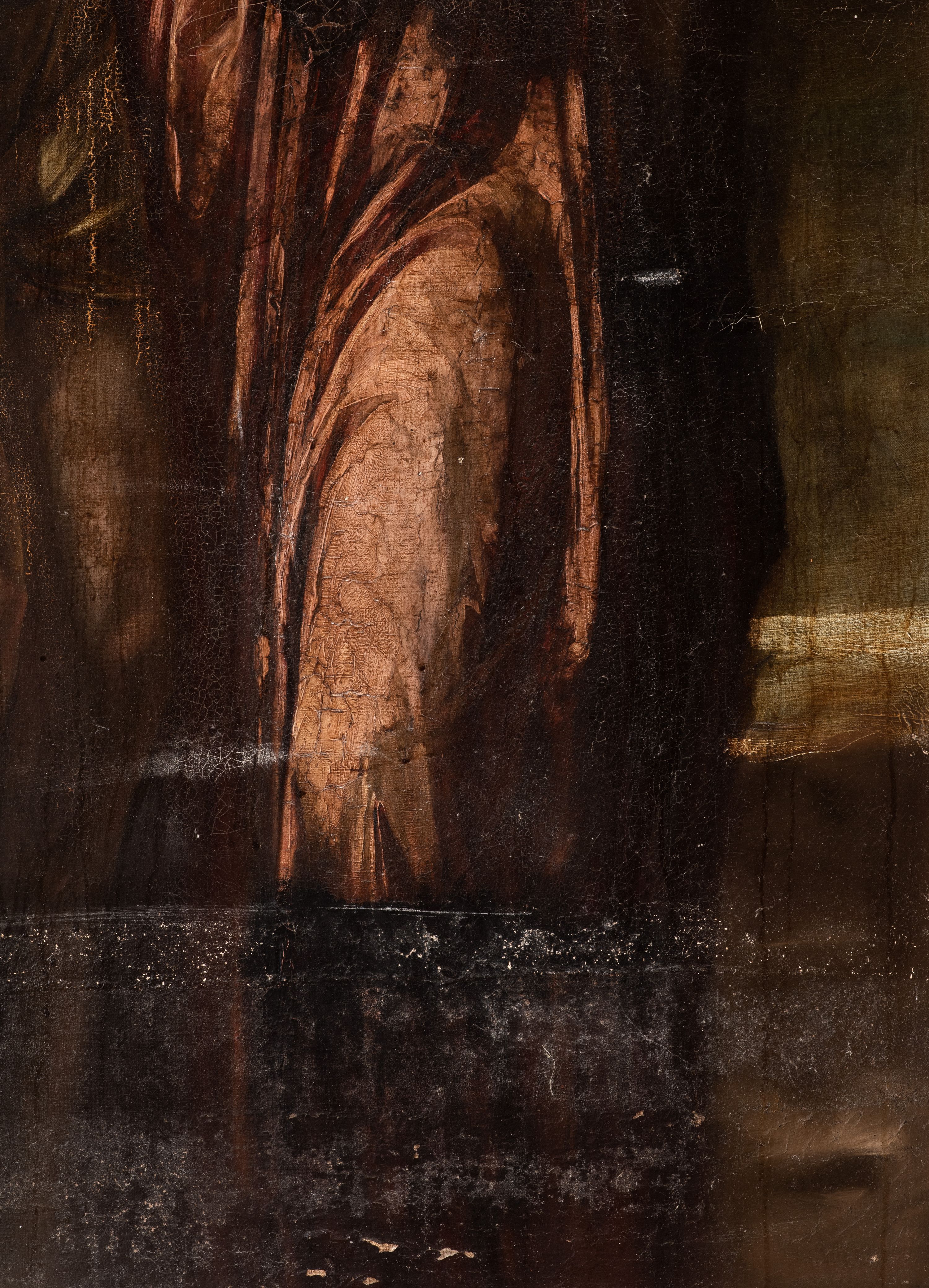 Pociemnienie warstwy malarskiej, odkształcenia i przedarcia płótna.