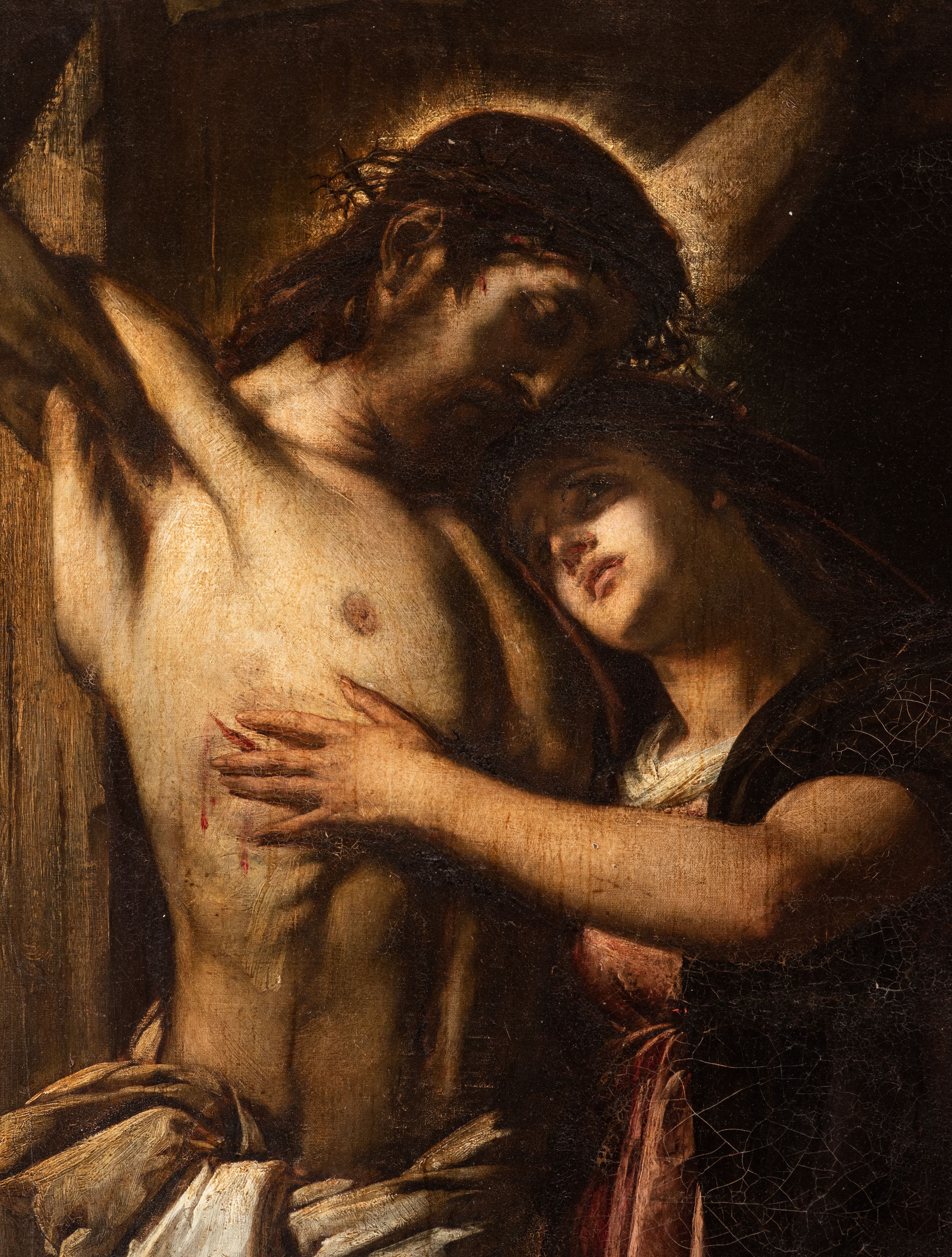 Obraz w kształcie stojącego prostokąta ujęty w drewnianą, złoconą ramę. W centralnej części kompozycji przedstawienie Chrystusa Ukrzyżowanego, do którego piersi przytula się Maria Magdalena. Chrystus ukazany w trzech czwartych z ciałem zwróconym w lewą stronę. Głowa odziana w cierniową koronę pochylona do dołu. Wokół niej świetlisty nimb. Tors muskularny, wypukły z widoczną raną w boku. Ramiona wyprężone, tworzące kształt litery „V”. Perizonium krótkie, białe udrapowane na prawym boku postaci. Maria Magdalena ukazana jako młoda kobieta w jasnoróżowej sukni i ciemniejszym płaszczu. Twarz o regularnych rysach, oczy uniesione do góry. Głowę pochyla w dół, składając ją na piersi Chrystusa. Swoją prawą ręką dotyka rany w jego boku. Na drugim planie, w oddali widoczny pejzaż z widokiem Jerozolimy i ciemnym, ciężkim niebem. Kolorystyka obrazu ciemna, utrzymana w odcieniach brązu.