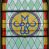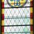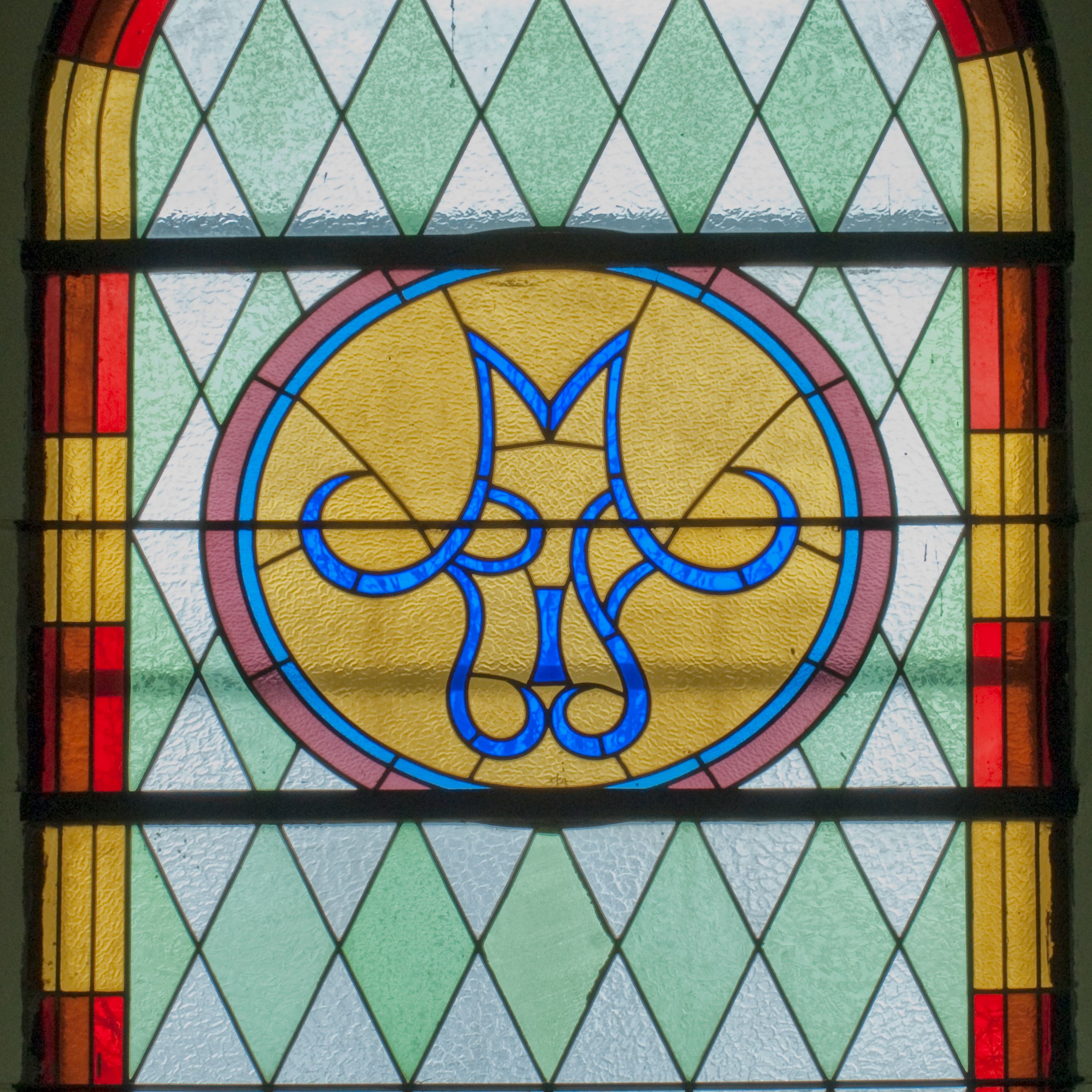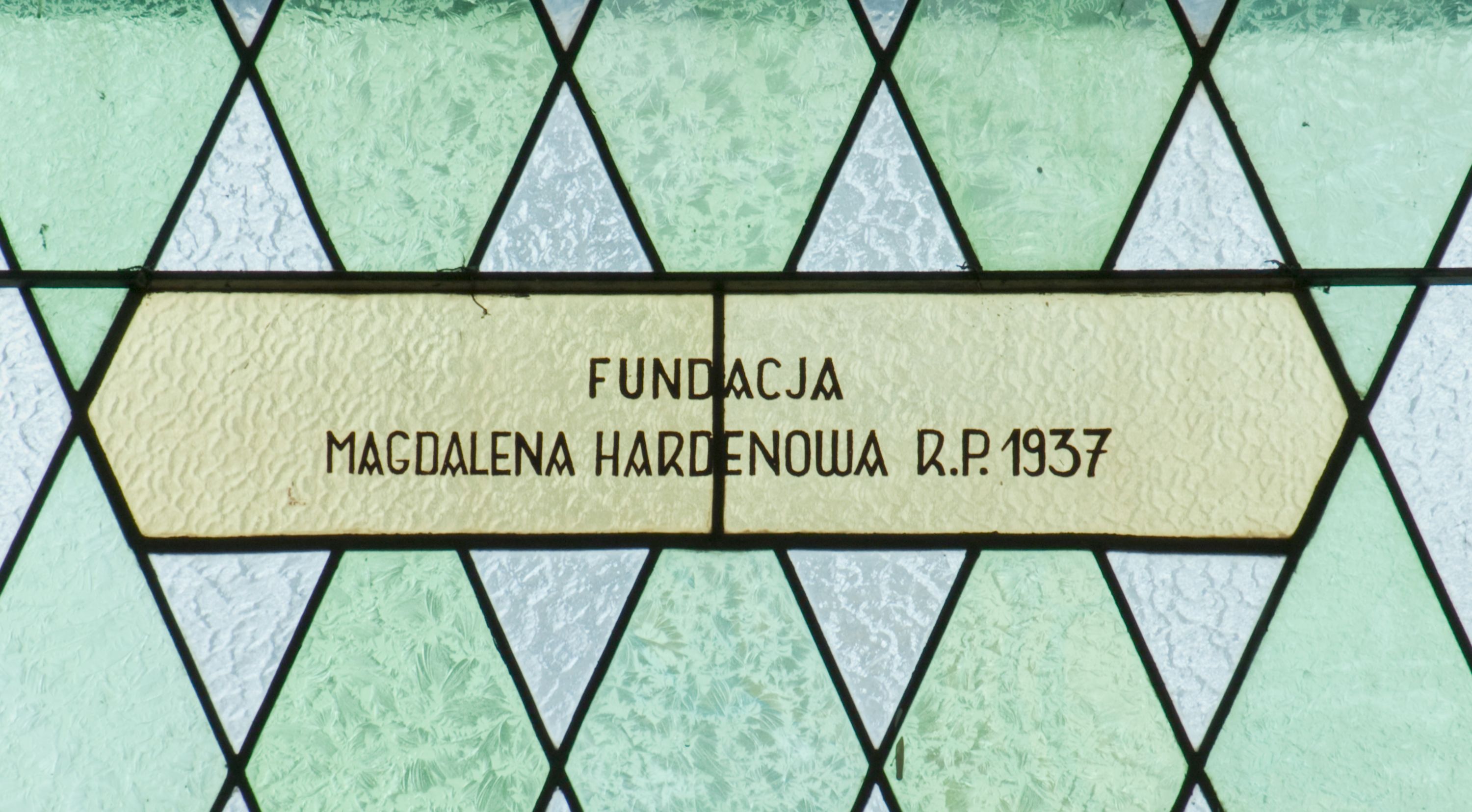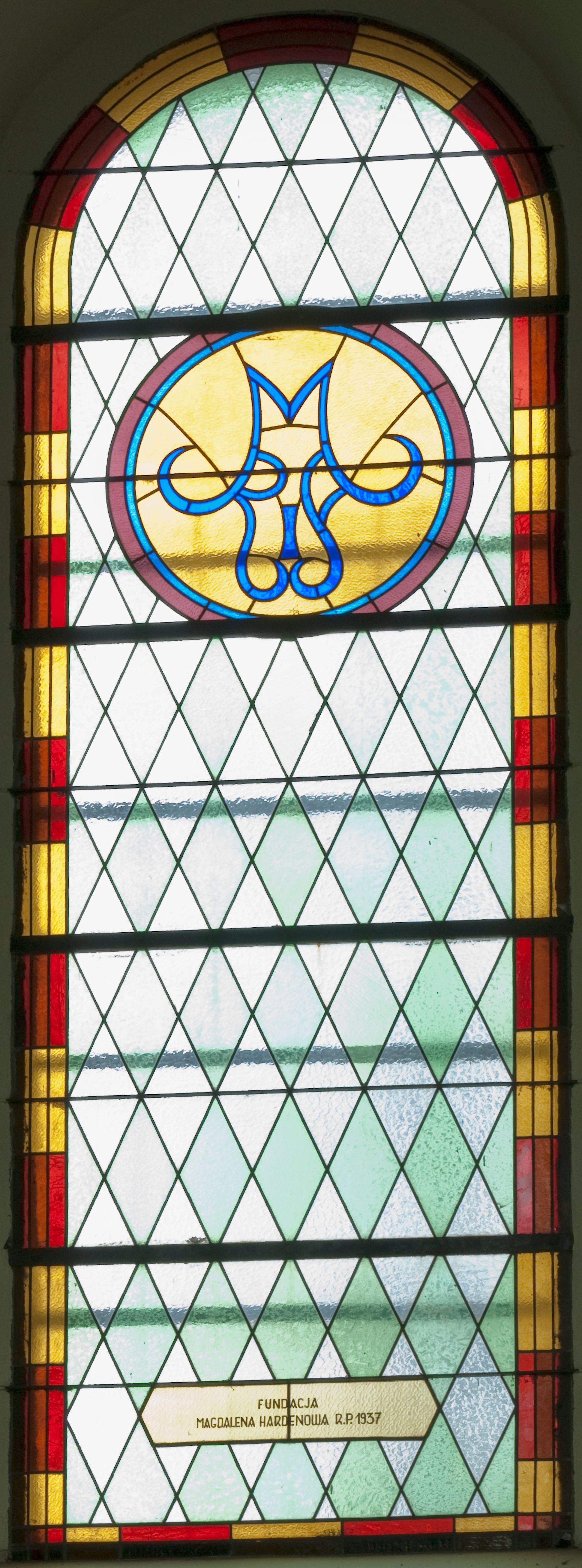 Witraż w kształcie stojącego prostokąta zamkniętego półkoliście ujęty geometryczną bordiurą dekorowaną czerwonymi i żółtymi prostokątami. W polu ukośna kratka wypełniona białymi i jasnozielonymi rombami. W górnej części witraża okrągły medalion z niebieskim monogamem maryjnym umieszczonym na żółtym tle. W dolej kwaterze prostokątne pole z napisem: „FUNDACJA / MAGDALENA HARDENOWA R[OKU] P[AŃSKIEGO] 1937.”