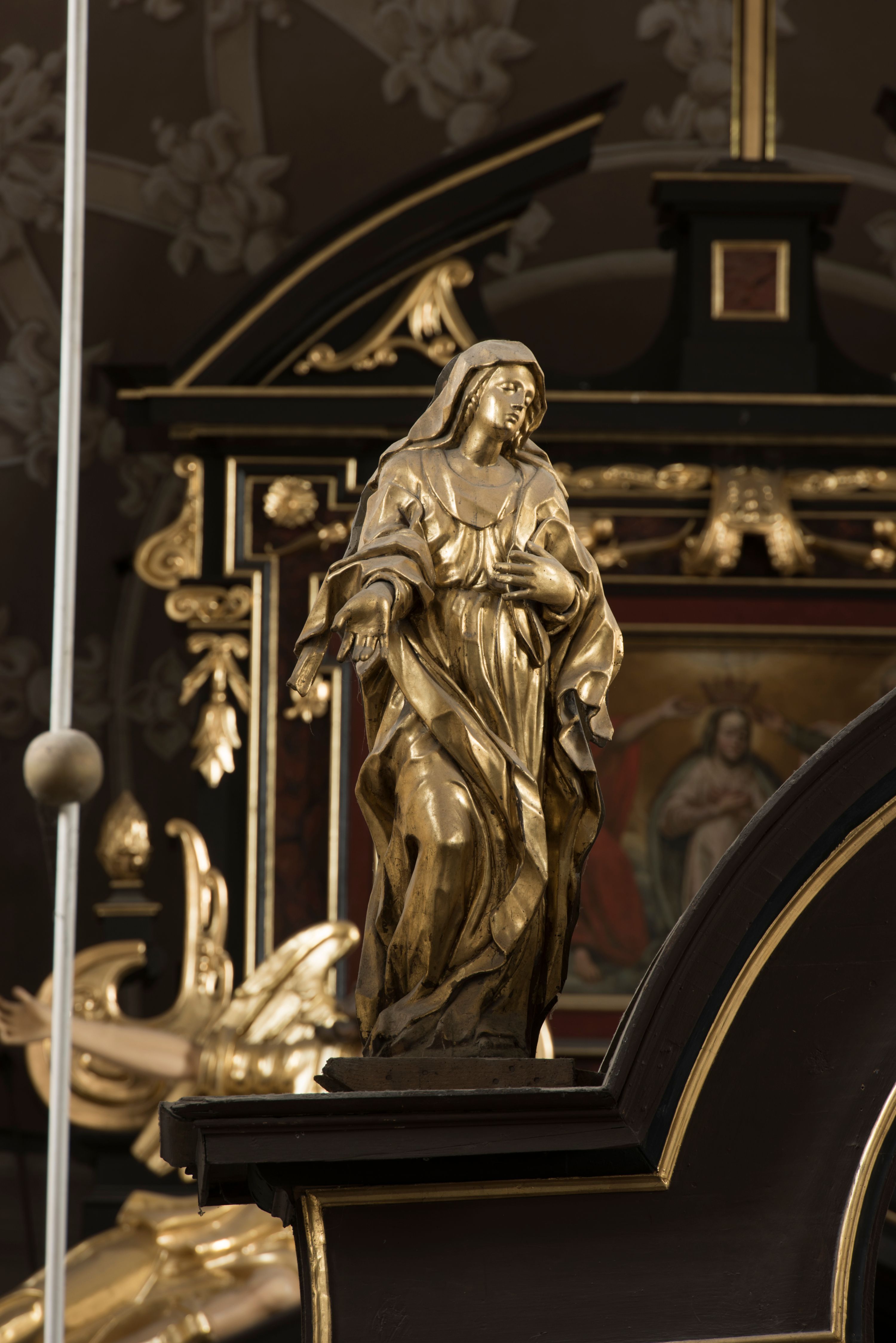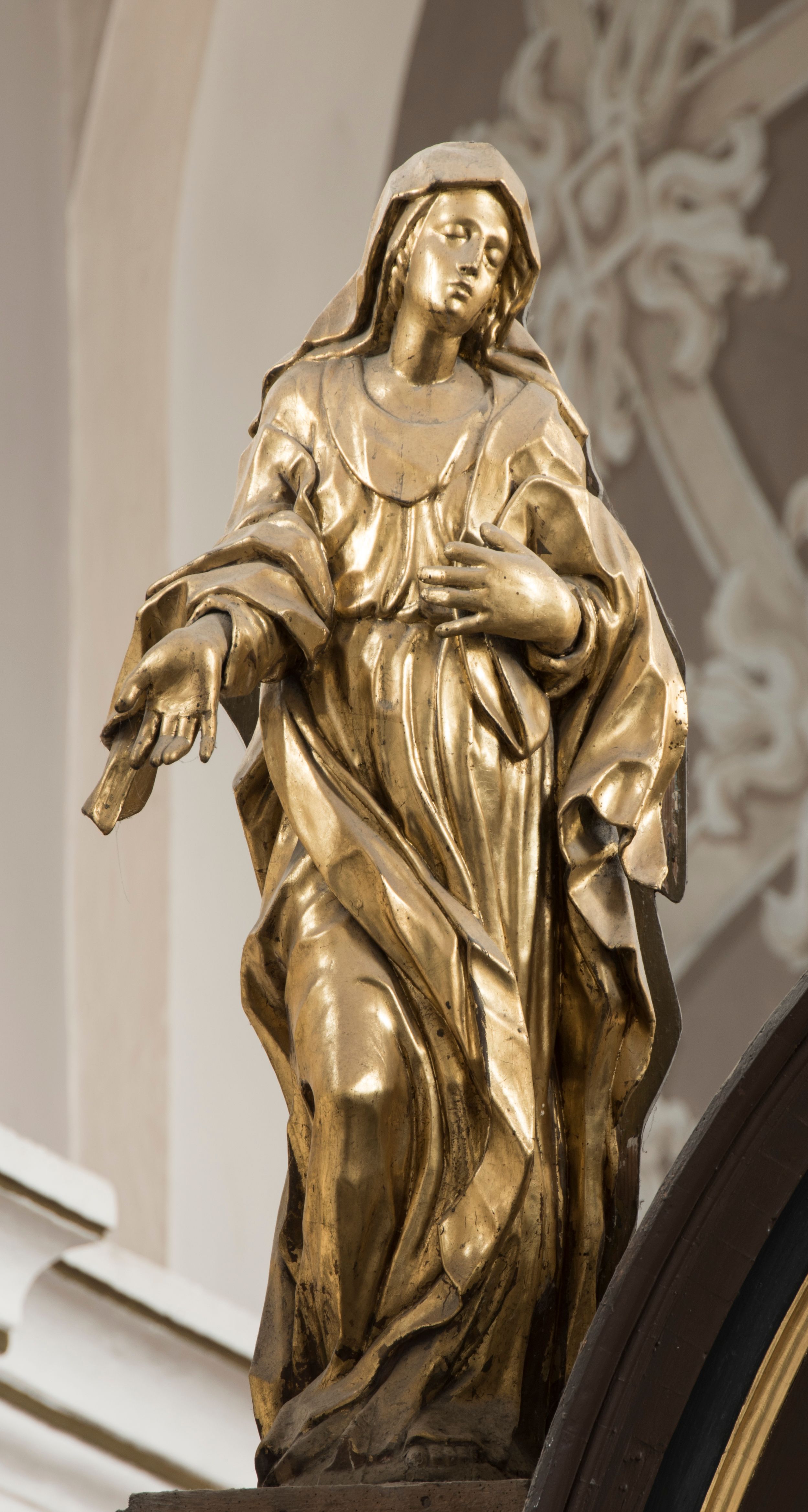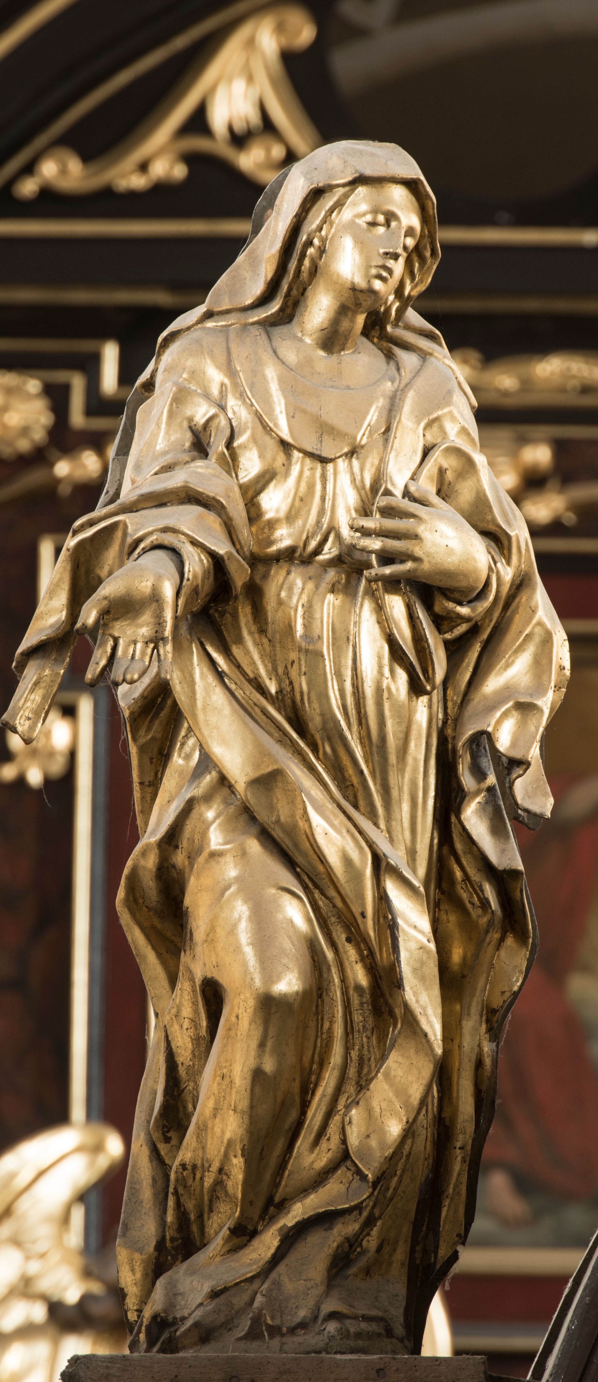 Matka Boska ukazana jest w pozycji stojącej, zwrócona lekko w stronę krzyża, w kontrapoście, ze zgiętą prawą nogą. Głowa delikatnie pochylona w lewo. Twarz Marii owalna, z pełnymi policzkami, zamkniętymi, wąskimi ale pełnymi wargami, prostym, szerokim i małym nosem. Oczy o lekko opadających zewnętrznych końcach zamknięte, nad nimi rysują się delikatne brwi. Na głowę i ramiona Marii narzucony jest płaszcz, spod którego wystają pukle pofalowanych włosów. Prawą rękę z otwartą dłonią wyciąga ku przodowi, lewą zaś zgiętą dotyka piersi. Maria jest ubrana w obficie pofałdowaną suknię, przewiązaną w pasie, sięgającą do ziemi. Poły szaty oraz płaszcza układają się w drobne, ale gęste i głębokie fałdy, swobodnie opinające jej sylwetkę. Rzeźba w całości złocona. Na jej plecach wtórnie dodana deska o obrysie postaci z malowanym wizerunkiem Marii widoczną od strony ołtarza głównego.