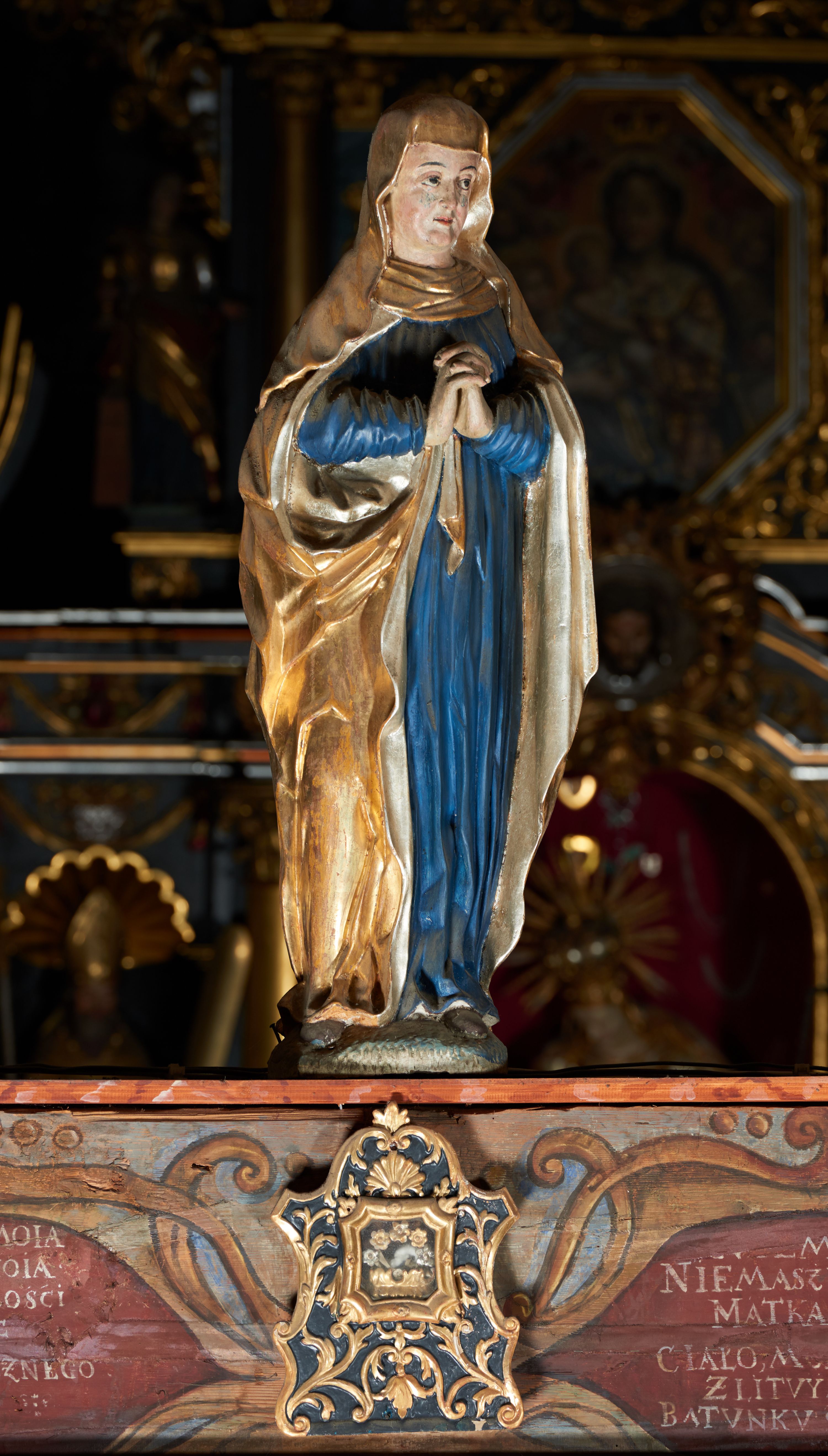 Rzeźba pełna, Matka Boska w pozie stojącej na półkolistym cokole, ukazana frontalnie ze splecionymi na wysokości piersi dłońmi. Twarz pociągła, o delikatnie rzeźbionych rysach, dużych oczach ze wzrokiem skierowanym przed siebie, wyraźnie podkreślonym podbródku. Ubrana jest w niebieską, długą suknię drapowaną w równolegle, rurkowate fałdy i złoty płaszcz przerzucony przez ramiona ze srebrzonym podbiciem. Na głowie ma złoty welon opadający na ramiona. Polichromia w odsłoniętych partiach ciała naturalistyczna.