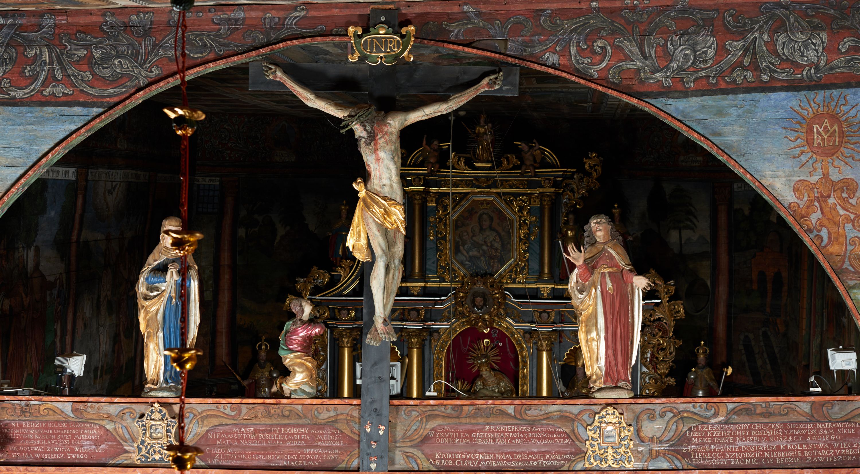 Tradycja umieszczania rzeźb w łuku tęczowym kościoła sięga jeszcze średniowiecza. Wizerunek Chrystusa Ukrzyżowanego z towarzyszącymi mu figurami Matki Boskiej, św. Marii Magdaleny i św. Jana Ewangelisty był obowiązkowym elementem wyposażenia właściwie każdego kościoła łacińskiego. Oznaczał zwycięstwo, był również symbolem dobrowolnej ofiary Chrystusa i zapowiedzią Odkupienia. Rzeźba nosi cechy formalne charakterystyczne dla dzieł z XVII wieku. Cechuje ją sztywny układ sylwetki i delikatnie zaznaczony kontrapost (prawa noga nieznacznie ugięta w kolanie). Również drapowanie szat jest statyczne i pozbawione ekspresji, składa się z prostych, głębokich fałd opadających wzdłuż ciała. Rzeźba Matki Boskiej wraz z figurą św. Jana Ewangelisty zostały wykonane w tym samym warsztacie rzeźbiarskim.