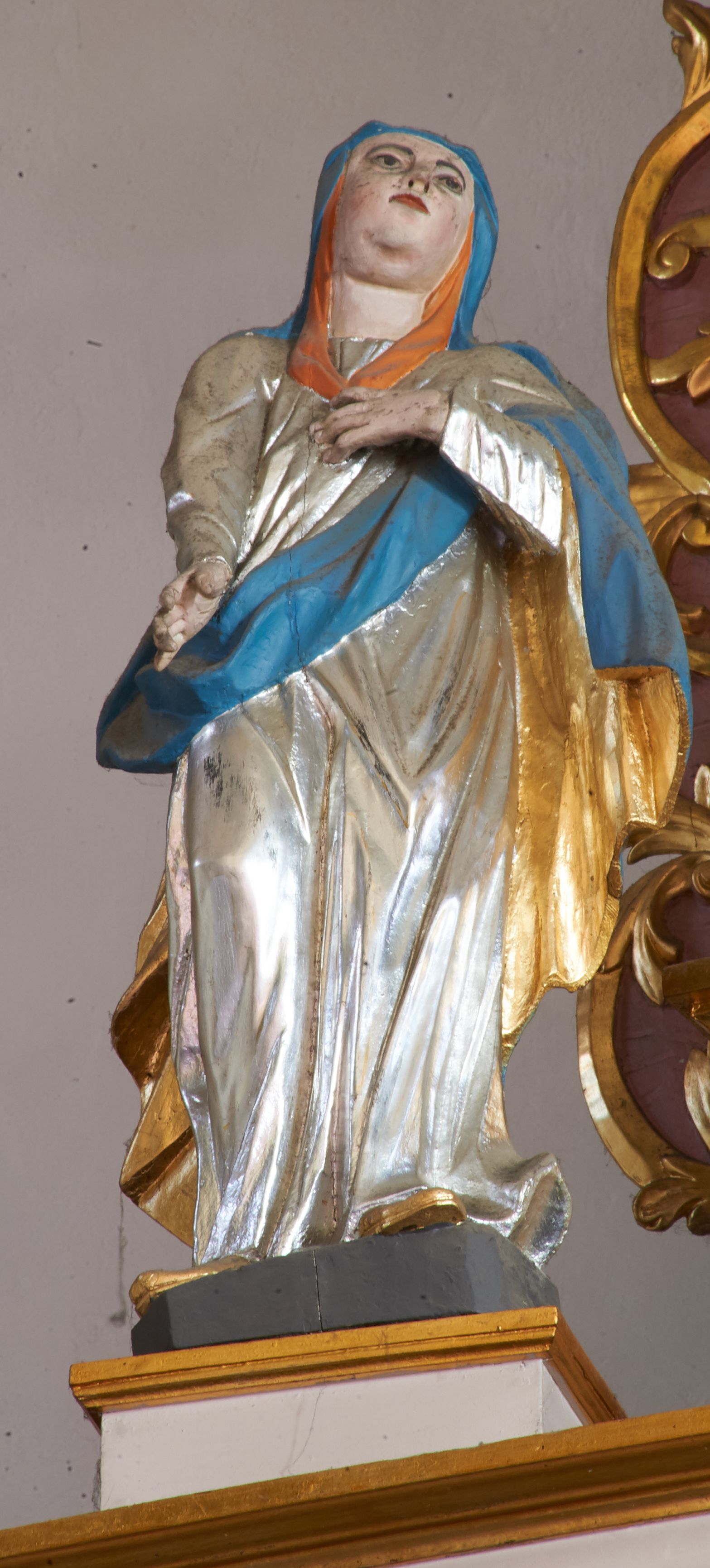 Figura Matki Boskiej powstała w drugiej połowie XVIII wieku. W nowo wybudowanym kościele została wtórnie wprawiona do powstałego wówczas ołtarza głównego, gdzie znajduje się do dziś. Jej ikonografia wskazuje na to, że pierwotnie należała do grupy Ukrzyżowania, być może znajdującej się w ołtarzu lub na belce tęczowej.
