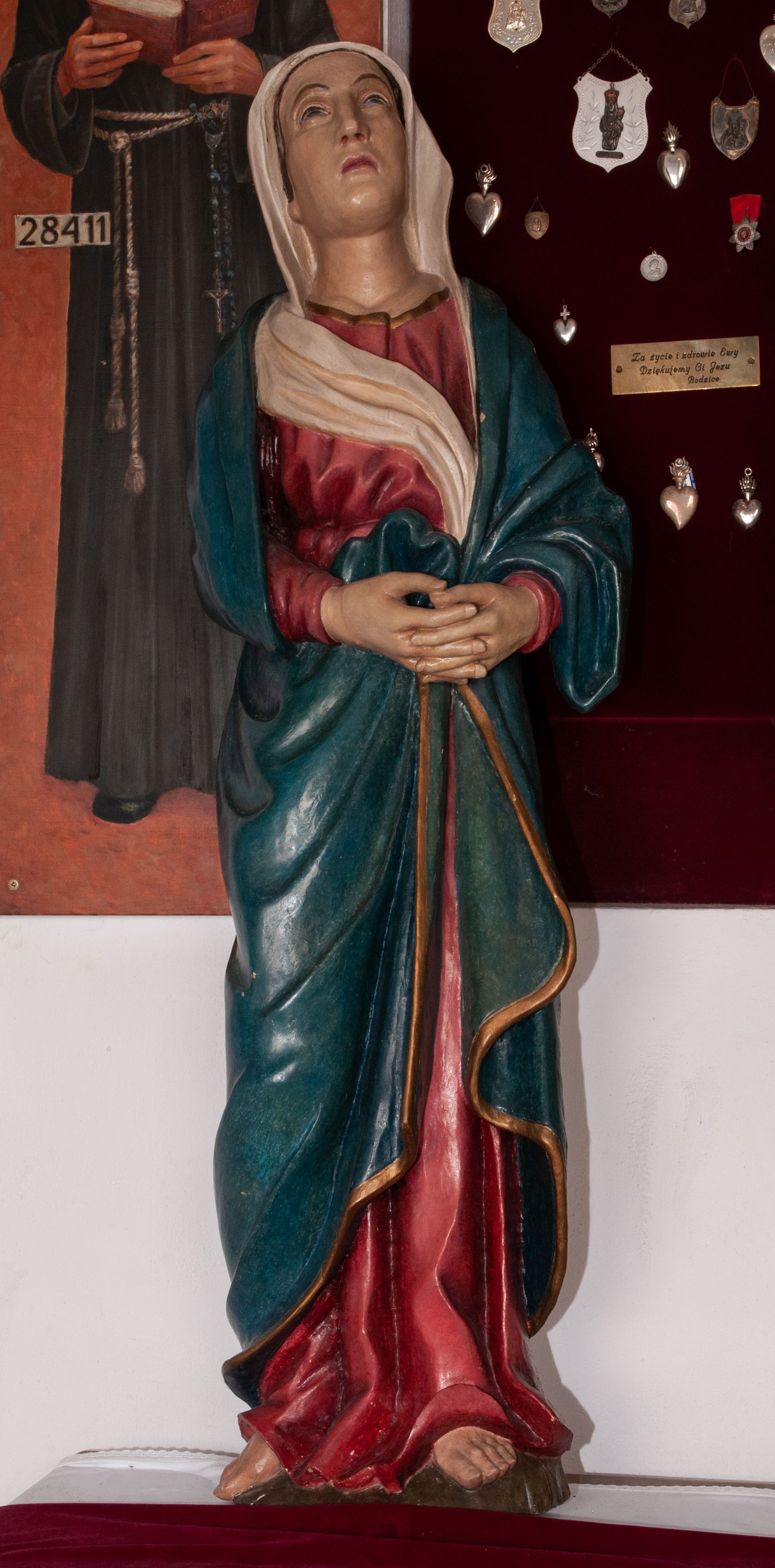 Rzeźba pełnoplastyczna, ustawiona na niskim cokole. Matka Boska stojąca w nieznacznym kontrapoście z dłońmi splecionymi na wysokości pasa oraz głową uniesioną ku górze. Twarz pociągła, nos długi i prosty, małe usta, wzrok skierowany ku górze. Ubrana jest w czerwoną suknię z długimi rękawami, ze złotą lamówką u szyi oraz swobodnie narzucony na ramiona błękitny płaszcz ozdobiony na brzegach analogicznym wykończeniem jak w sukni. Na głowie ma założony biały welon, którego jeden koniec spływa z przodu postaci. Spod szat wystają bose stopy. Polichromia w odsłoniętych partiach ciała naturalistyczna, delikatnie jasna.
