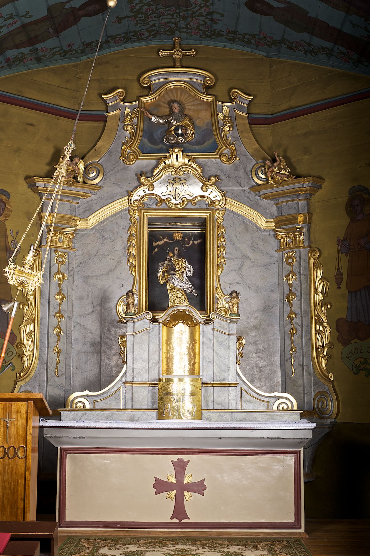 Obraz w kształcie stojącego prostokąta z przedstawieniem Matki Boskiej z Dzieciątkiem. W centrum kompozycji Matka Boska ujęta w całej postaci, frontalnie, podtrzymująca obiema rękami Dzieciątko. Maria na owalną twarz, wzrok kieruje w górę, ma wąski nos i pełne usta, długie włosy zaczesane do tyłu. Partie ubrań przykrywa rzeźbiona sukienka, złocona w obrębie sukni i srebrzona w części płaszcza. Na obu ornament floralny. Dzieciątko siedzi w ramionach Marii, jest pulchne, rączki rozkłada do boków, spogląda lekko w górę, na głowie ma zamkniętą, złotą koronę. Ponad głową Marii unoszą się symetrycznie dwa putta, z których każde w jednej ręce trzyma gałązkę kwitnącego kwiatu a drugą podtrzymuje koronę nad głową Niewiasty. Tak, jak w przypadku Dzieciątka, jest to korona zamknięta nałożona na obraz i wykonana z trybowanej, złoconej blachy. Tło obrazu jednolite, ciemne.
