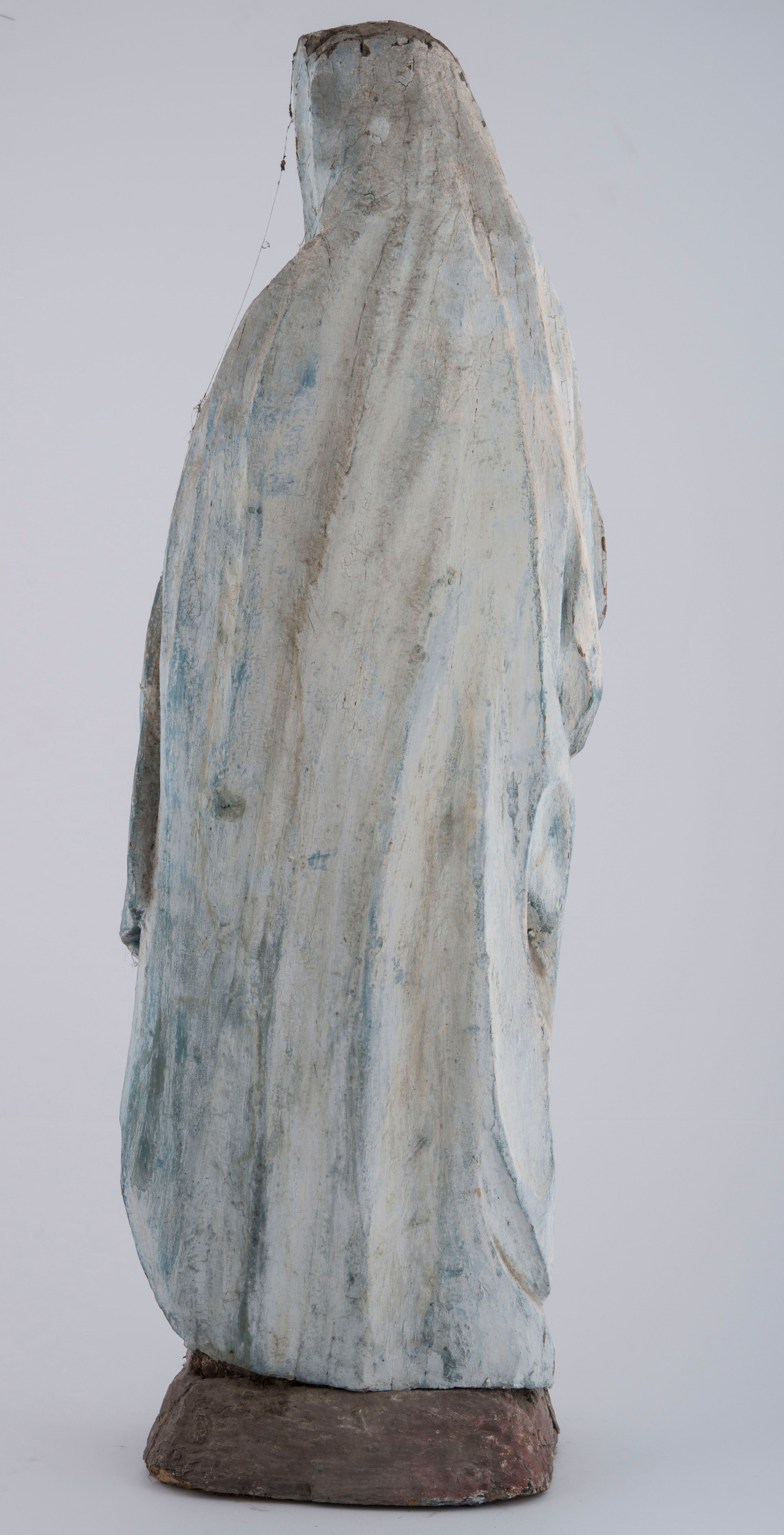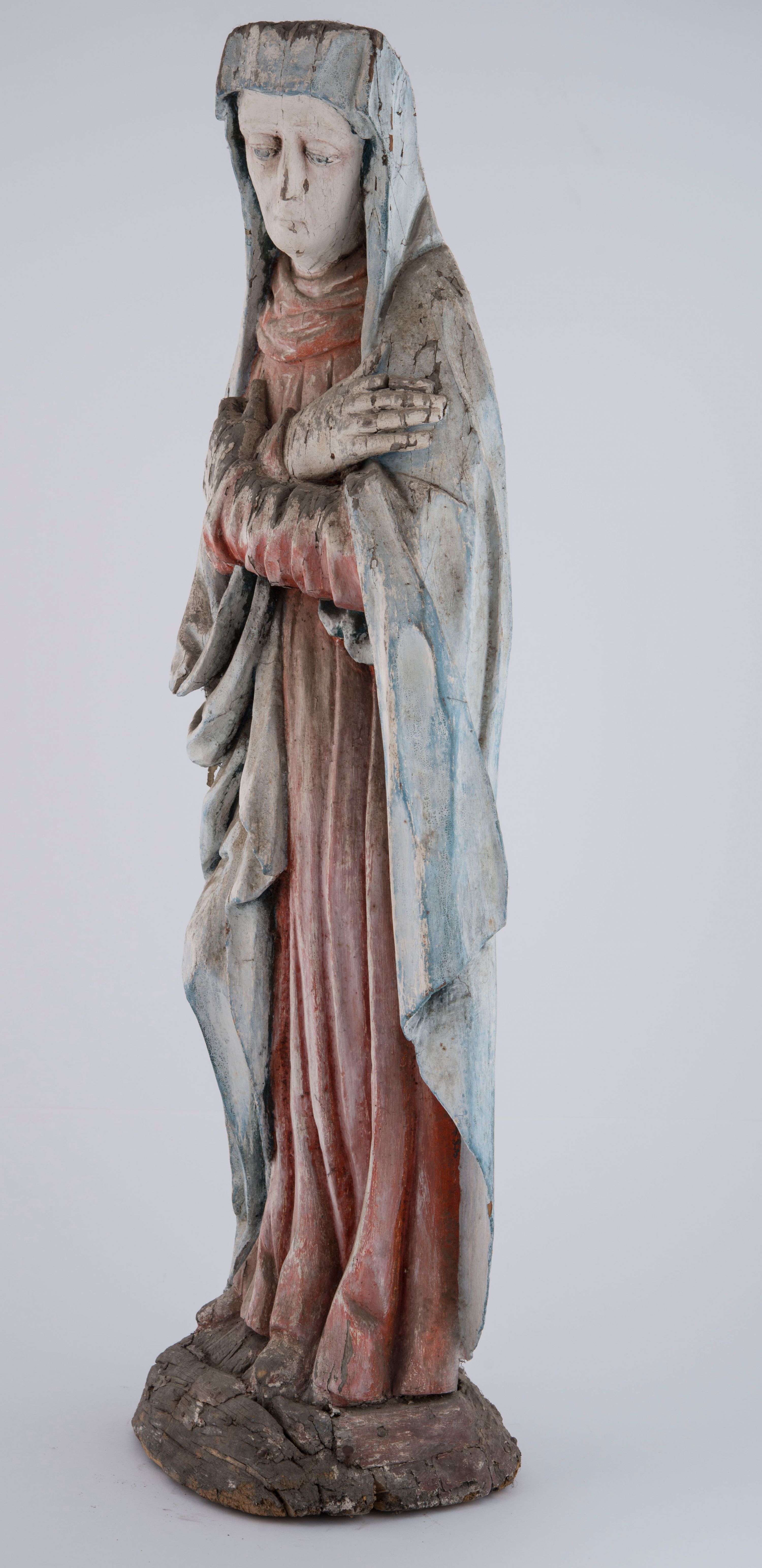 Drewno spękane, zwietrzałe, zabrudzone, ubytki polichromii.