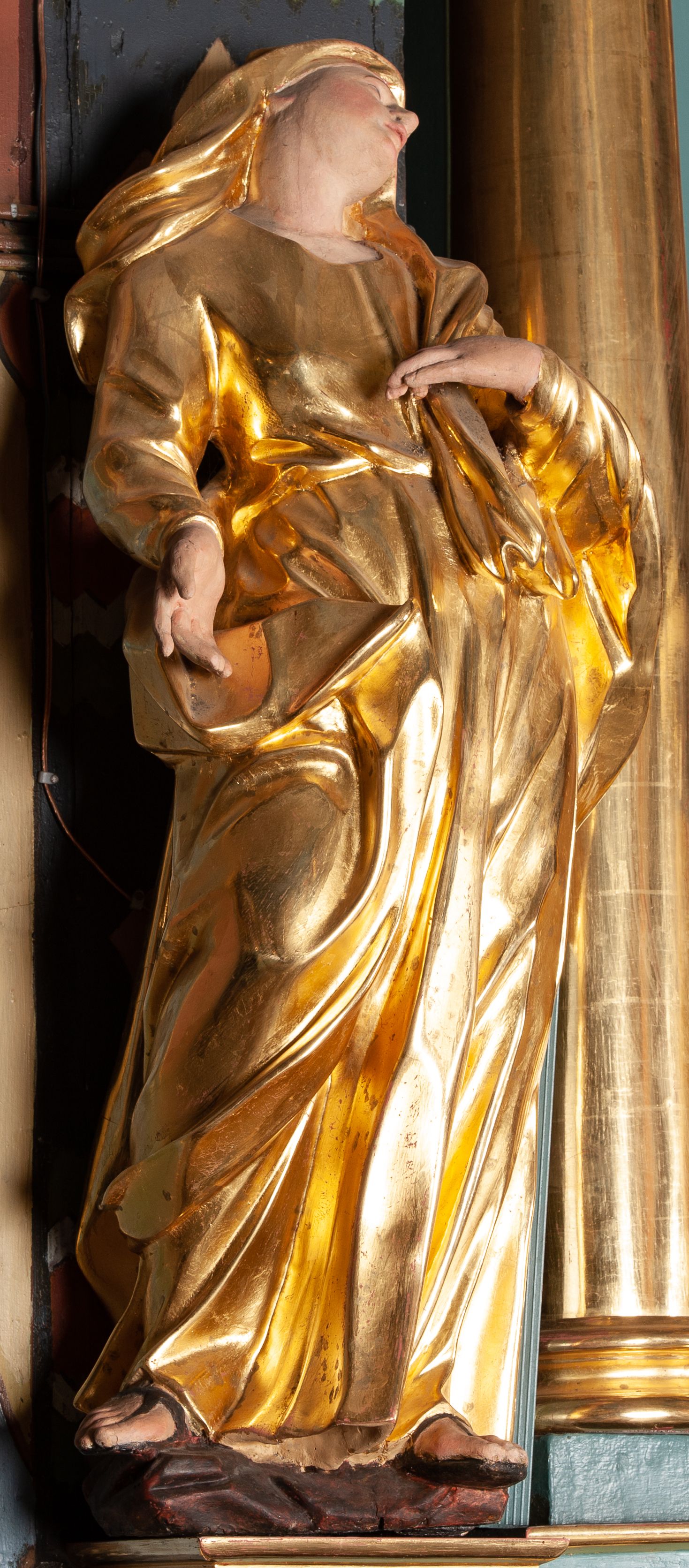 Całopostaciowa, lekko ścięta z tyłu figura Matki Boskiej Bolesnej zwróconej na wprost i stojącej w wydatnym kontrapoście. Sylwetka ciała esowato wygięta, tułów i głowa odchylone do tyłu. Głowa uniesiona, mocno zwrócona w lewą stronę. Owalna twarz o łagodnych rysach, oczy niewielkie, usta rozchylone. Maria ubrana w długą, złoconą suknię oraz złocony płaszcz okrywający głowę, zawinięty wokół lewego ramienia. Prawa ręka lekko uniesiona, lewa podtrzymująca na piersi połę płaszcza. Karnacja ciała w jasnokremowym odcieniu.