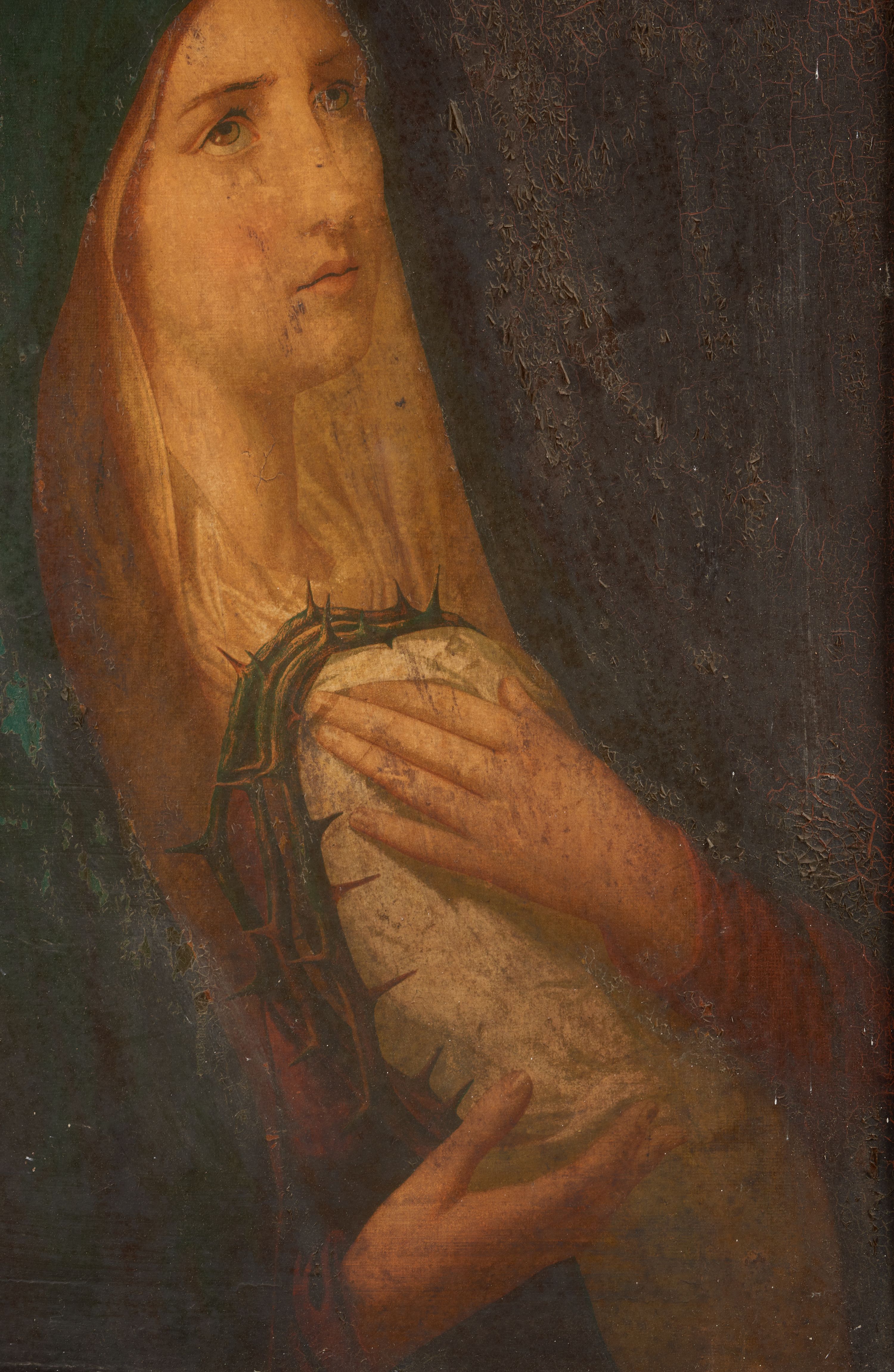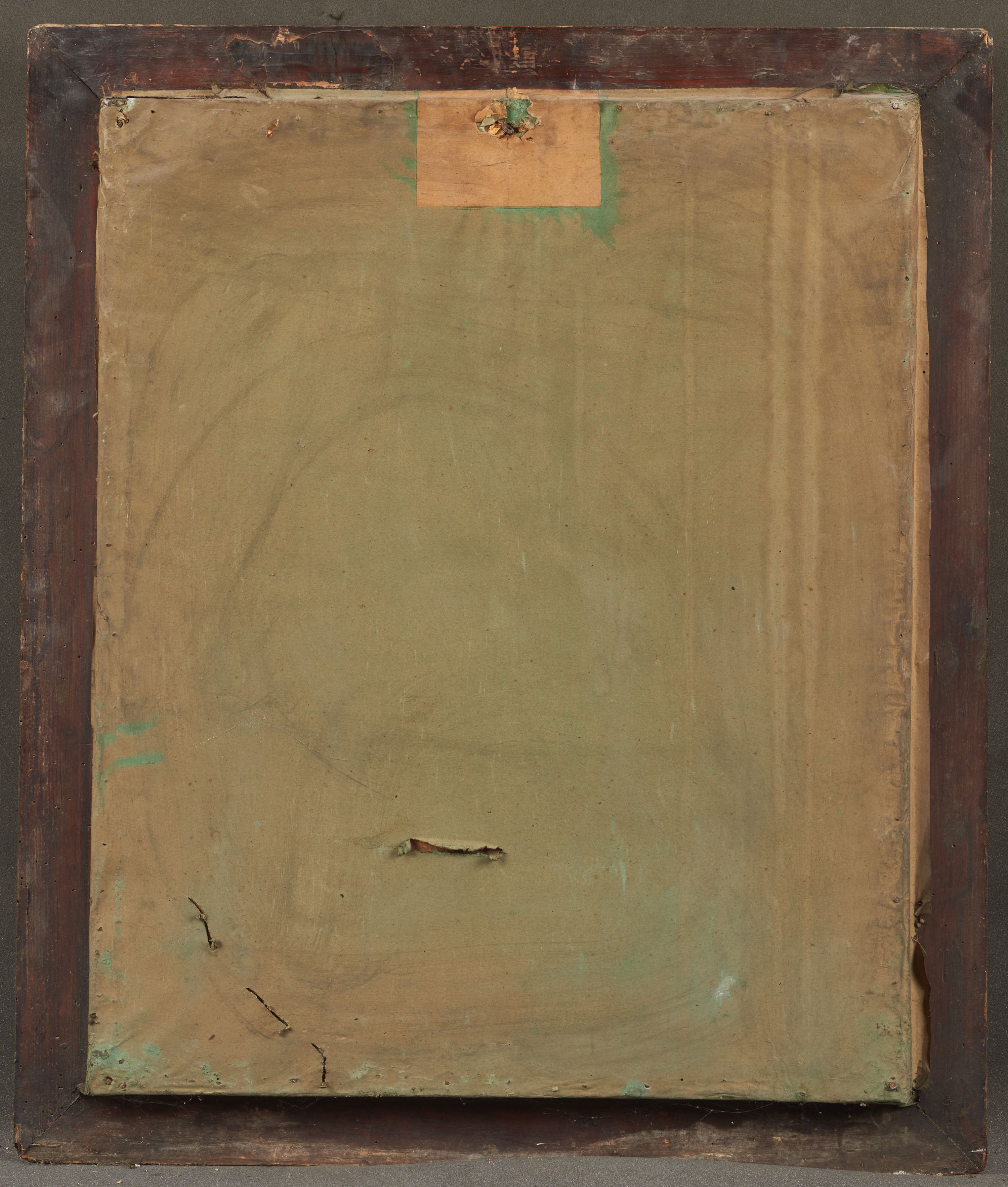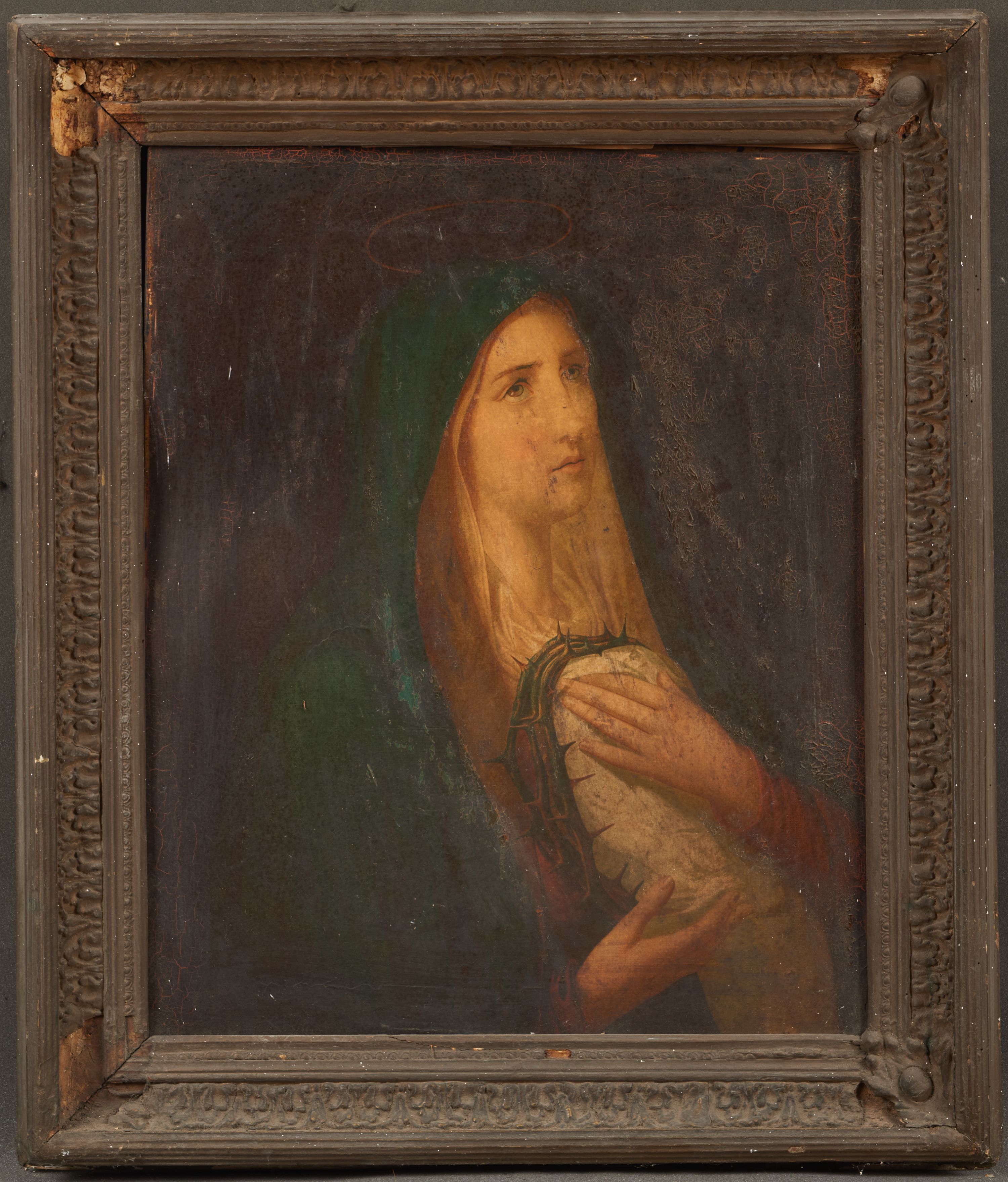 Obraz o kształcie stojącego prostokąta nadrukowany na kartonie i pokryty werniksem. Na całej powierzchni werniks łuszczy się, szczególnie w prawej, górnej części i wzdłuż prawej krawędzi. Widać rozstąpienia / spękania warstwy druku, najprawdopodobniej wywołane celowo. Od odwrocia obraz zaklejony kartonem. Tektura podobrazia pofalowana, całość silnie zabrudzona. Rama o ornamencie wyciskanym z licznymi ubytkami, bardzo silnie zabrudzona. Od odwrocia rozdarcie papieru przy górnej listwie ramy, w środkowej części oraz kilka drobnych uszkodzeń w dolnej części, na środku i po lewej.