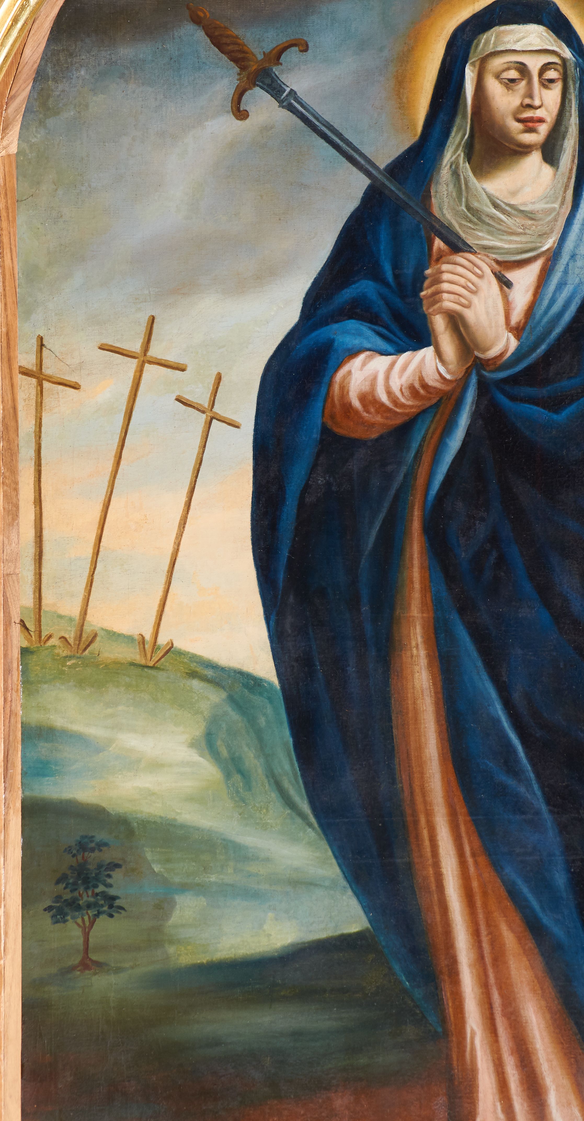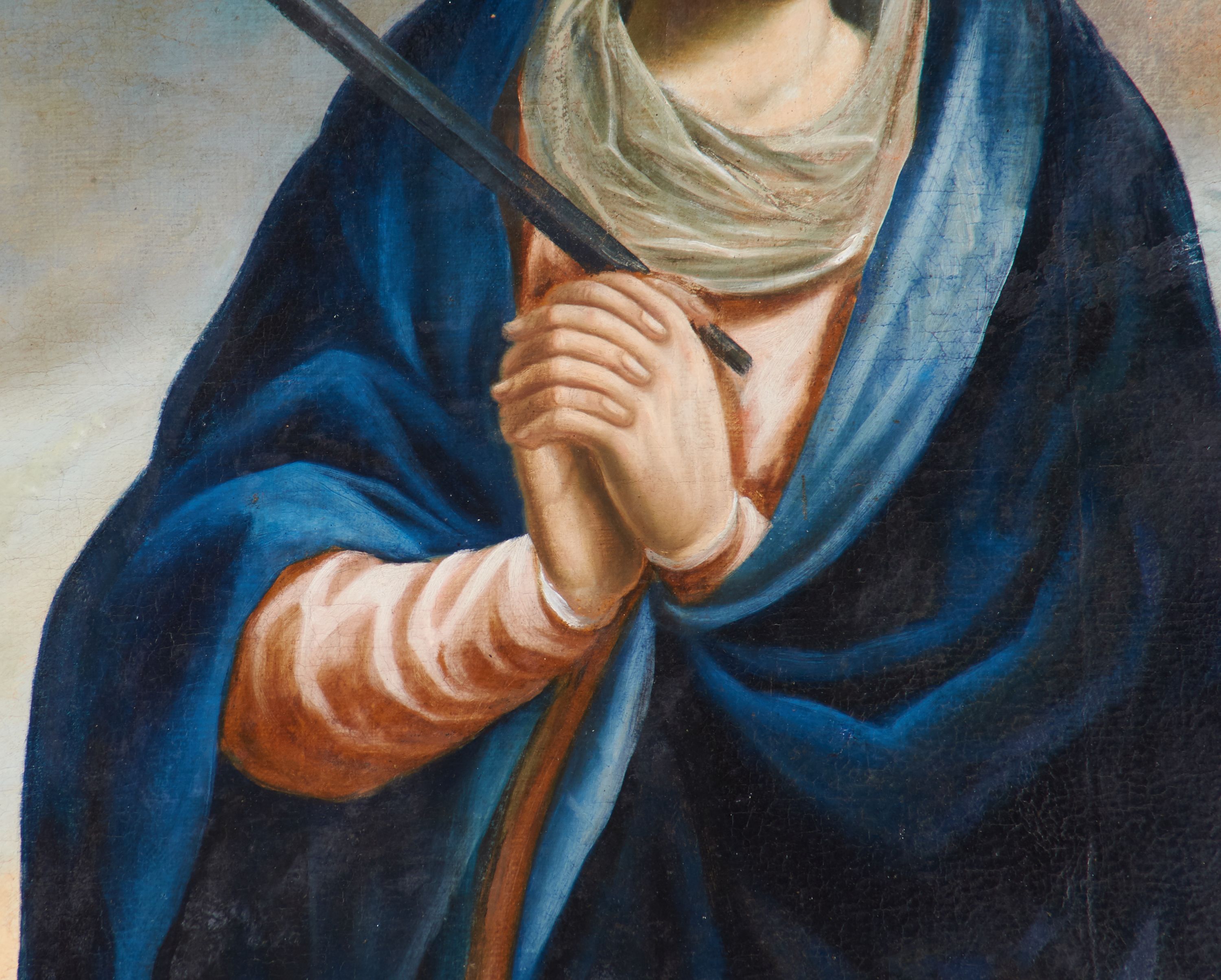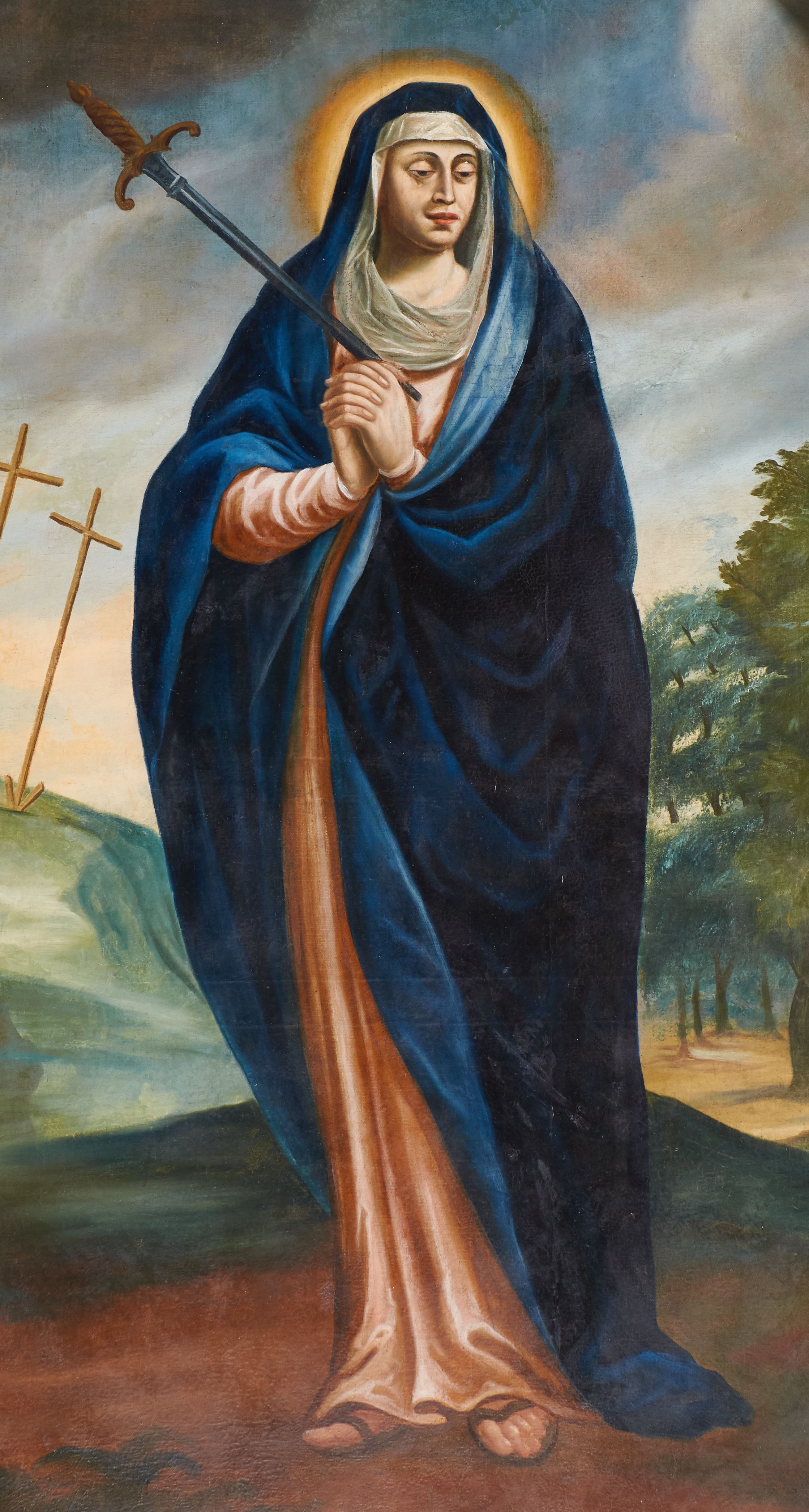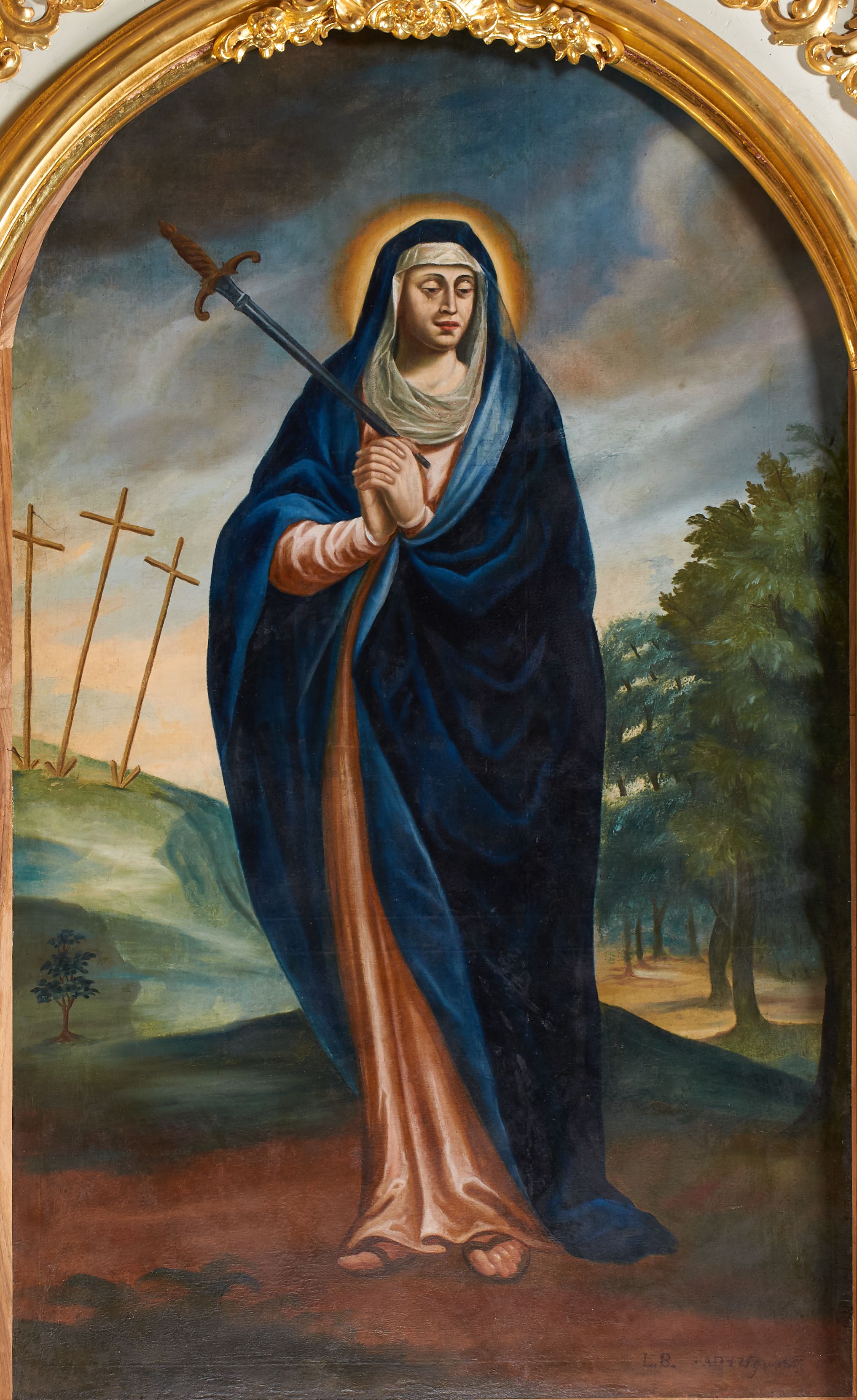 Niestety źródła archiwalne nie ujawniły autora dzieła. Jedynie sygnatura znajdująca się w prawym, dolnym narożu obrazu wskazuje na artystę o inicjałach „L. B.” oraz czas powstania dzieła – 1759 rok. Obraz przedstawia Matkę Boską Bolesną i jest ilustracją fragmentu Ewangelii św. Łukasza: „Symeon zaś błogosławił Ich i rzekł do Maryi, Matki Jego: «Oto Ten przeznaczony jest na upadek i na powstanie wielu w Izraelu, i na znak, któremu sprzeciwiać się będą. A Twoją duszę miecz przeniknie, aby na jaw wyszły zamysły serc wielu»” (Łk 2, 34-35). Przedstawienia Matki Boskiej Bolesnej przeszytej mieczem pojawiły się już w średniowieczu. Jednak wizerunek usamodzielnił się dopiero pod koniec XV i na początku XVI wieku, zyskując dużą popularność w XVII i XVIII wieku. W omawianym dziele oprócz miecza przeszywającego serce Matki Boskiej ból został wyrażony poprzez charakterystyczny układ dłoni Marii zwany „affectus doloris”. Franz Lang (1654-1727), bawarski jezuita, autor wielu prac, w których opisał jakie możliwości daje gra aktora w procesie edukacji religijnej, gest ten omówił w następujący sposób: „Cierpimy i smucimy się, splatając dłonie na kształt grzebienia i unosząc je do serca albo opuszczając do pasa”. Podobnie jak aktor na scenie ma wzbudzać u widza poruszenie, tak i dzieło (obraz lub rzeźba) miały wywołać to samo uczucie u modlących się wiernych.