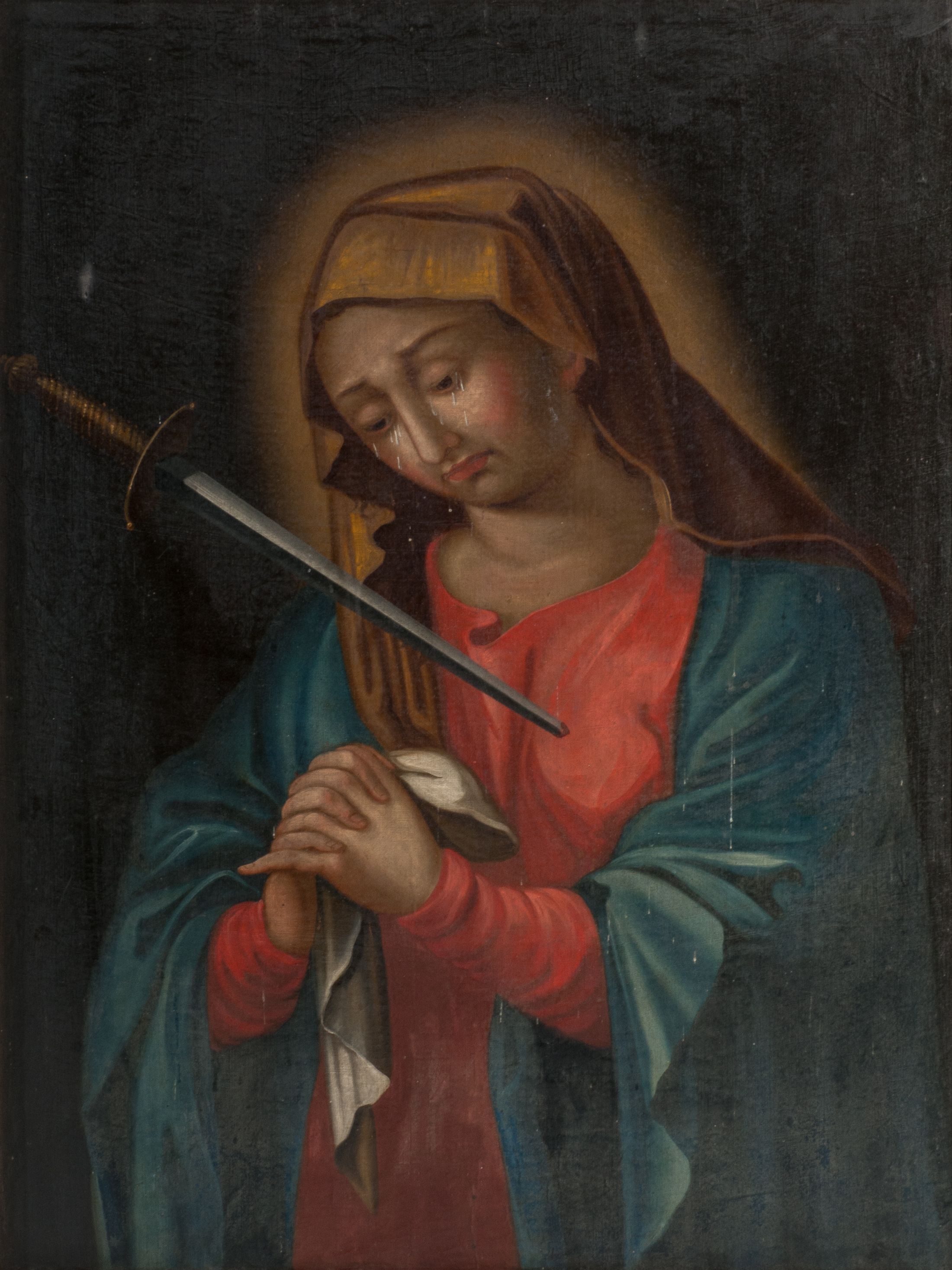 Obraz w formie stojącego prostokąta z przedstawieniem Matki Boskiej ukazanej w półpostaci, zwróconej w trzech czwartych w prawo, z pochyloną głową oraz z uniesionymi na wysokości piersi, splecionymi dłońmi, w których trzyma białą chustkę. Jej twarz jest okrągła, o pełnych, zaróżowionych policzkach, oczach skierowanych w dół, z których płyną łzy, uniesionych brwiach, prostym, długim nosie oraz pełnych ustach. Ubrana jest w czerwoną suknię oraz niebieski płaszcz narzucony na ramiona, jej głowę przykrywa ciemnożółty welon. W jej pierś skierowany jest ukośnie ustawiony miecz. Maria jest ukazana na jednolitym ciemnobrązowym tle, rozjaśnionym wokół jej głowy. Obraz w profilowanej, złoconej ramie.