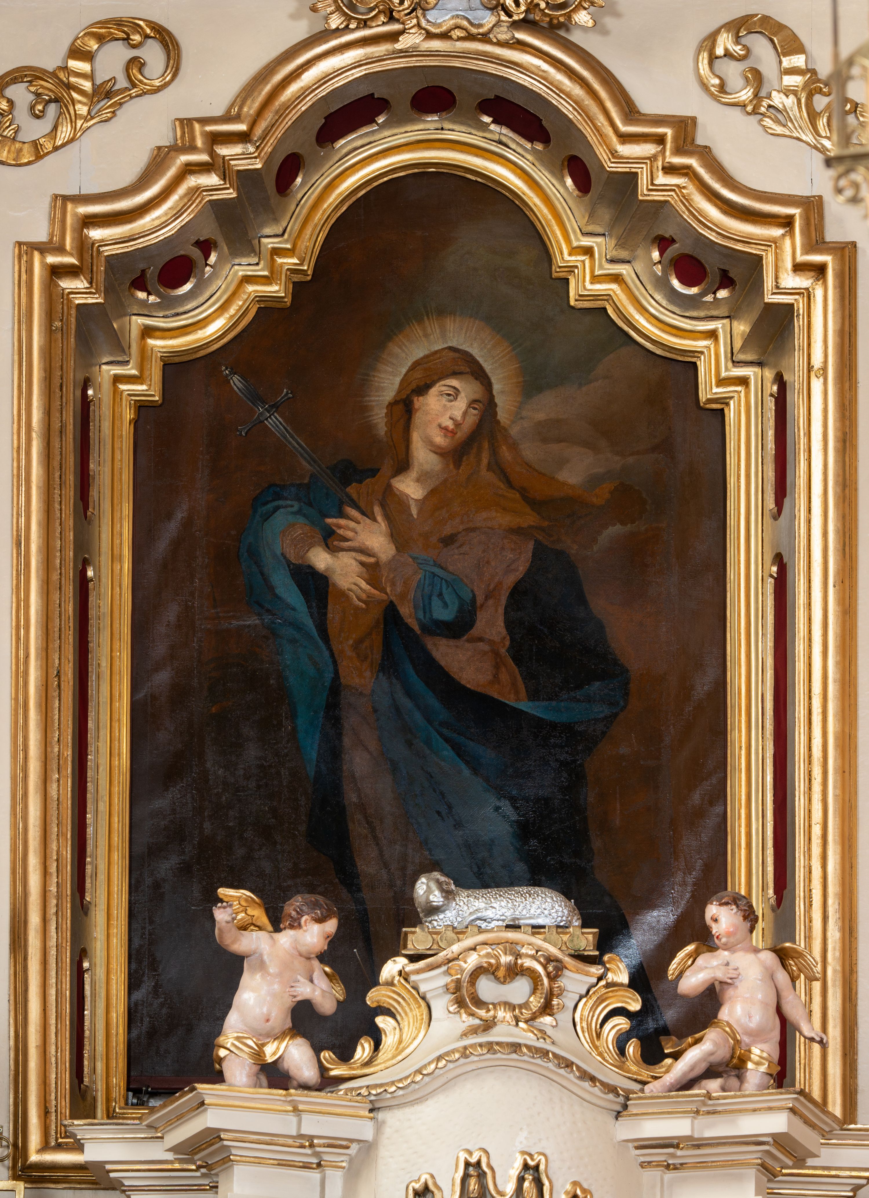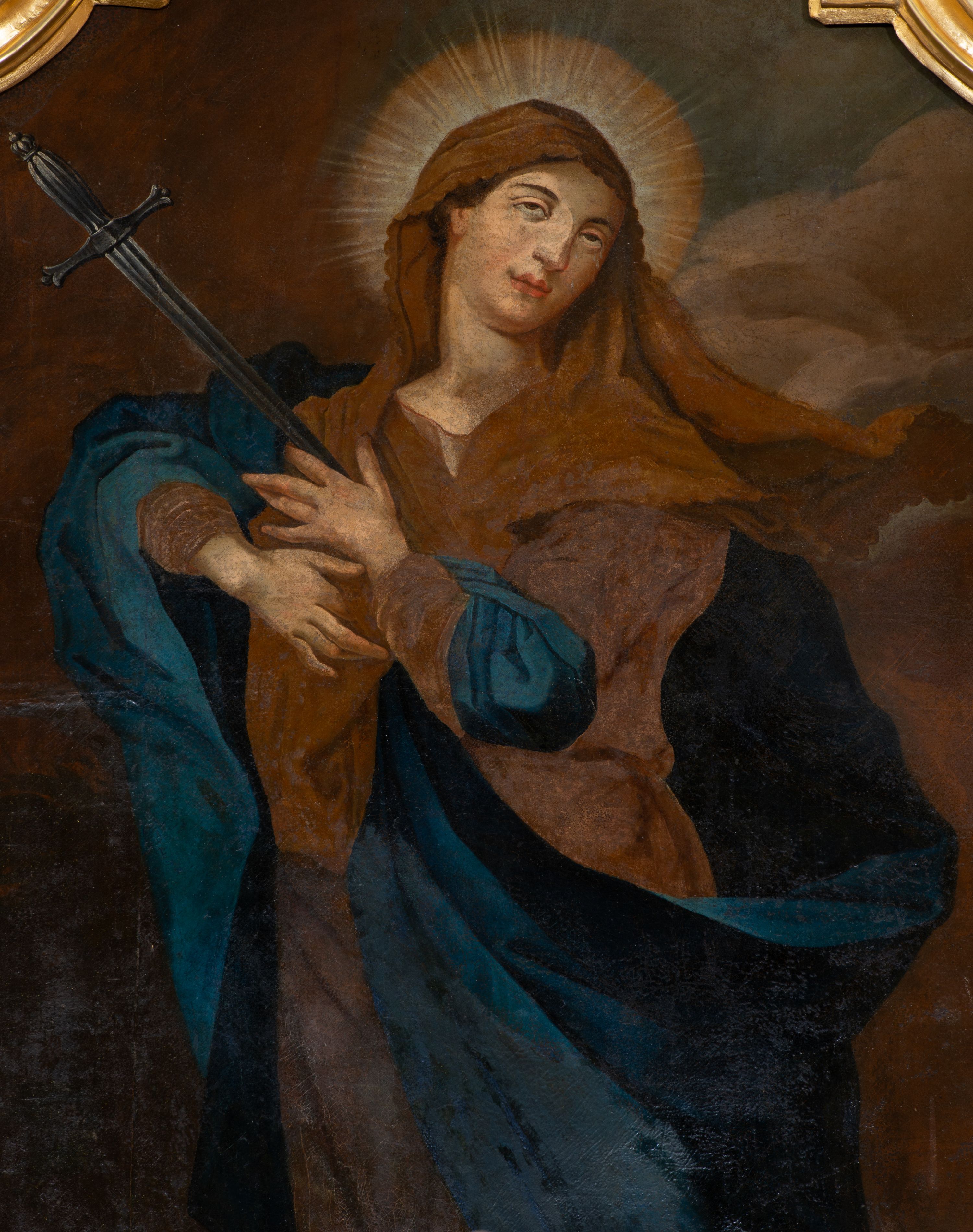 Obraz w formie stojącego prostokąta zamkniętego łukiem półkolistym z podwójnym nadwieszeniem i uskokiem. W centrum ukazana Matka Boska, zwrócona w trzech czwartych w prawo, z głową skierowaną w przeciwną stronę, w kontrapoście, z dłońmi złożonymi na piersi, w którą skierowany jest miecz. Twarz ma owalną, o małych, migdałowatych oczach, skierowanych w górę, dużym nosie i pełnych ustach. Wokół głowy ma nimb promienisty. Ubrana w brązowo-fioletową suknię, przepasaną w talii oraz niebieski płaszcz zarzucony na prawe ramię i zawinięty na lewym boku, na głowę ma narzucony jasnobrązowy welon rozwiany i opadający na ramiona. Maria ukazana na tle zachmurzonego brązowo-fioletowego nieba.
