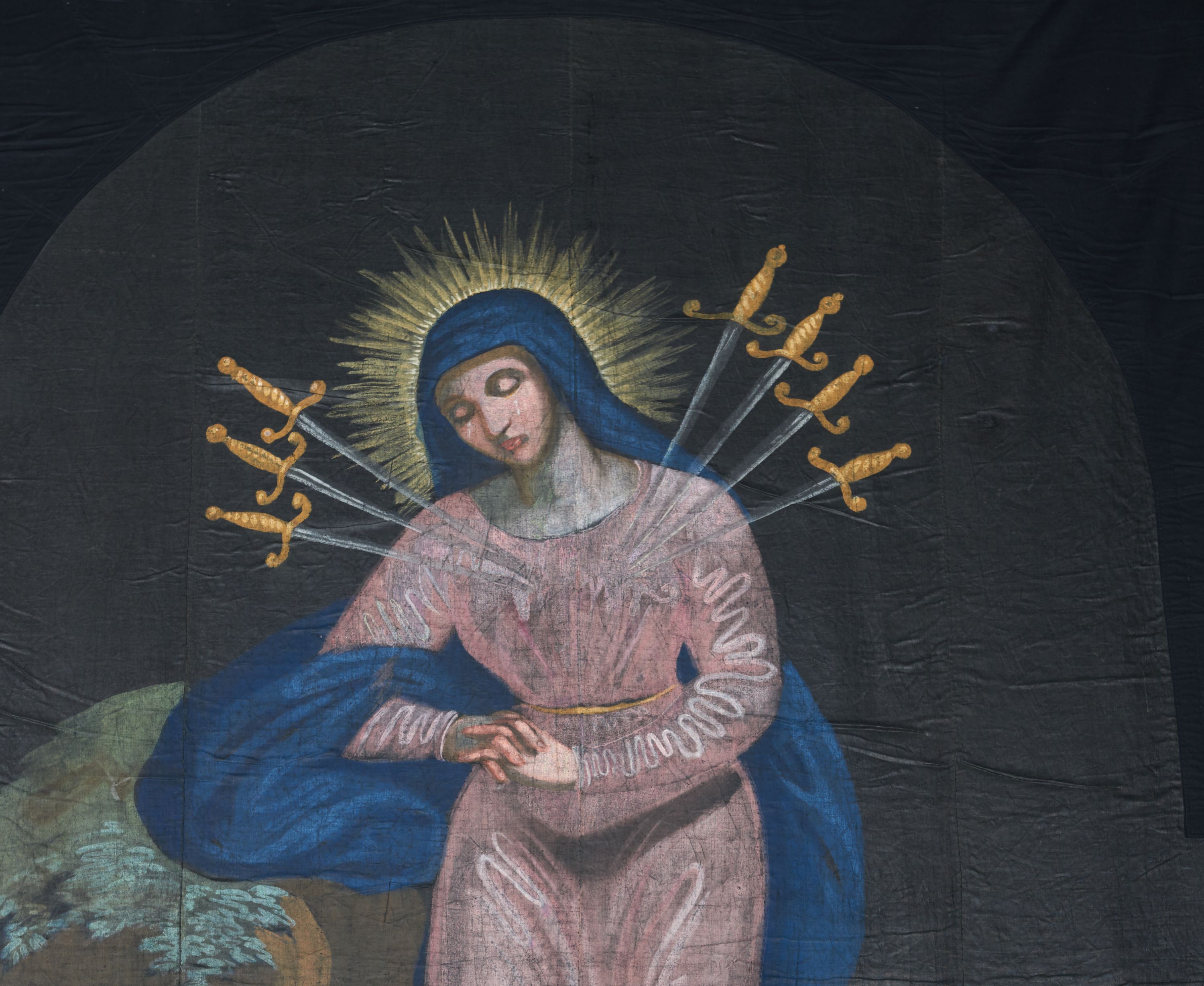Tkanina wielkopostna z przedstawieniem Matki Boskiej Bolesnej powstała w XVIII wieku. Stanowi spójny komplet wraz z tkaninami przedstawiającymi: Biczowanie Chrystusa i św. Marię Magdalenę. Wizerunek jest ilustracją fragmentu Ewangelii św. Łukasza, w którym starzec Symeon przepowiedział Marii, iż jej duszę przebije miecz boleści.