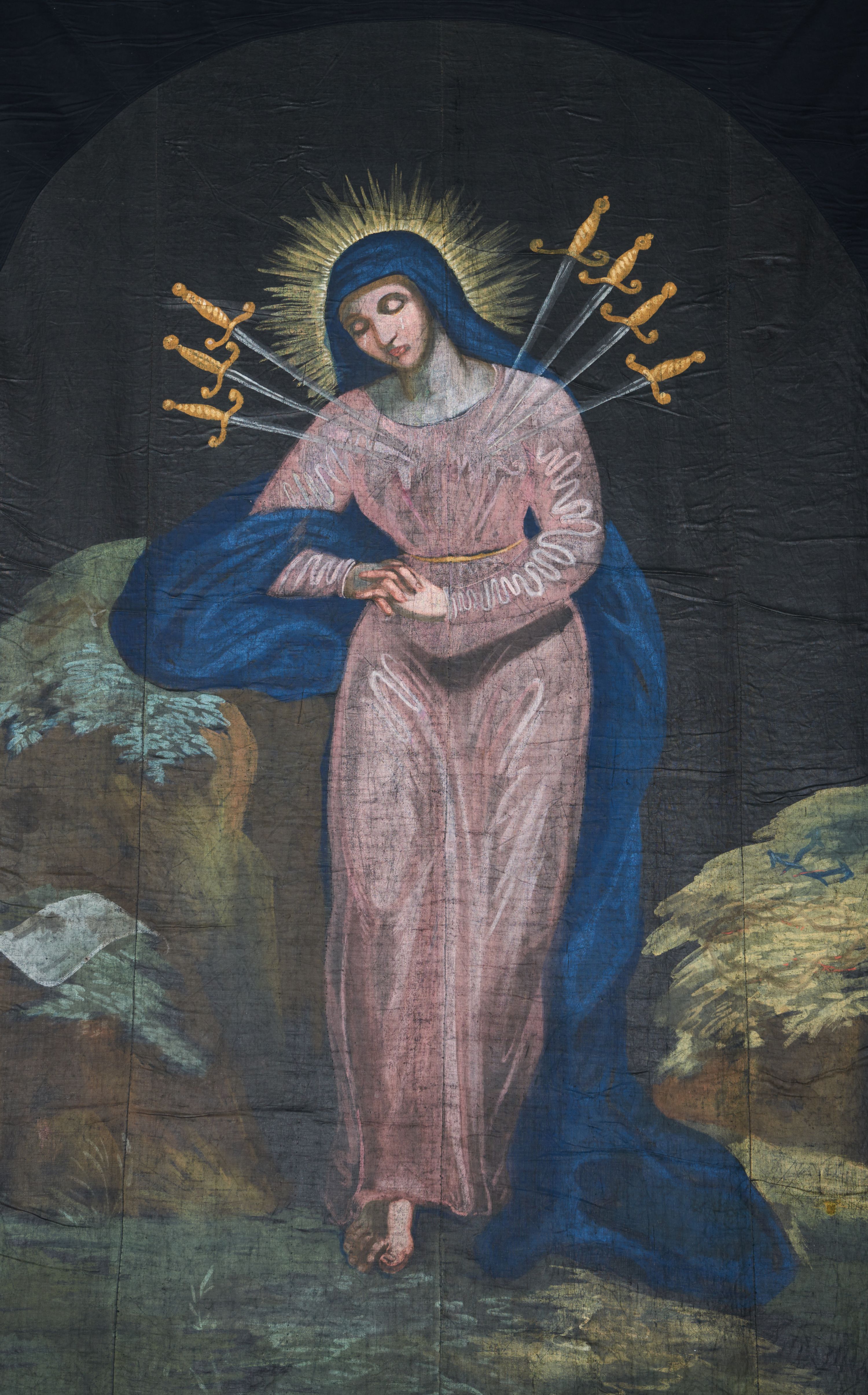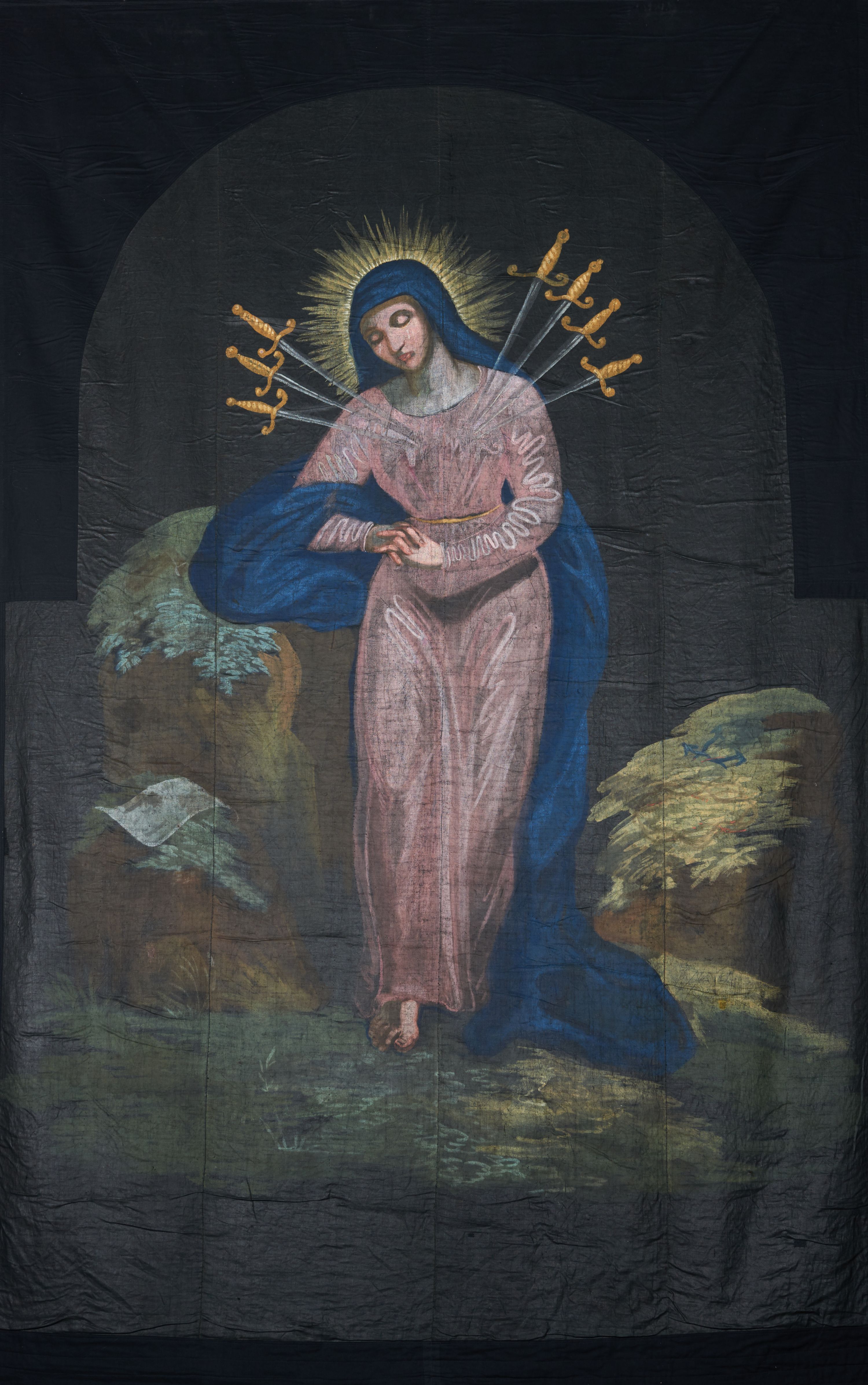 Tkanina w kształcie stojącego prostokąta, zamkniętego łukiem nadwieszonym, dosztukowana do kształtu stojącego prostokąta. W centrum kompozycji stojąca Matka Boska, ukazana frontalnie z dłońmi splecionymi na wysokości bioder z głową przechyloną w prawo i skłonioną delikatnie w dół, prawą ręką opiera się o skałę. W jej serce wbite jest siedem mieczy: trzy z lewej strony i cztery z prawej. Twarz trójkątna o wyraźnych, konturowych rysach, oczy zamknięte, duży nos. Ubrana jest w różową suknię i granatowy płaszcz przerzucony przez prawą rękę i spływający wzdłuż lewego boku; na głowie ma granatowy welon, a wokół głowy złoty i promienisty nimb. Maria ukazana jest na tle skał: na skale po lewej stronie leży biały titulus w formie banderoli z napisem „IN / RI”, a na skale po prawej trzy gwoździe i korona cierniowa. Tło jednolite, czarne. Kolorystyka przytłumiona, wyraźnie podkreślona i rozświetlona jasnymi plamami barwnymi na sukni i twarzy Matki Boskiej.
