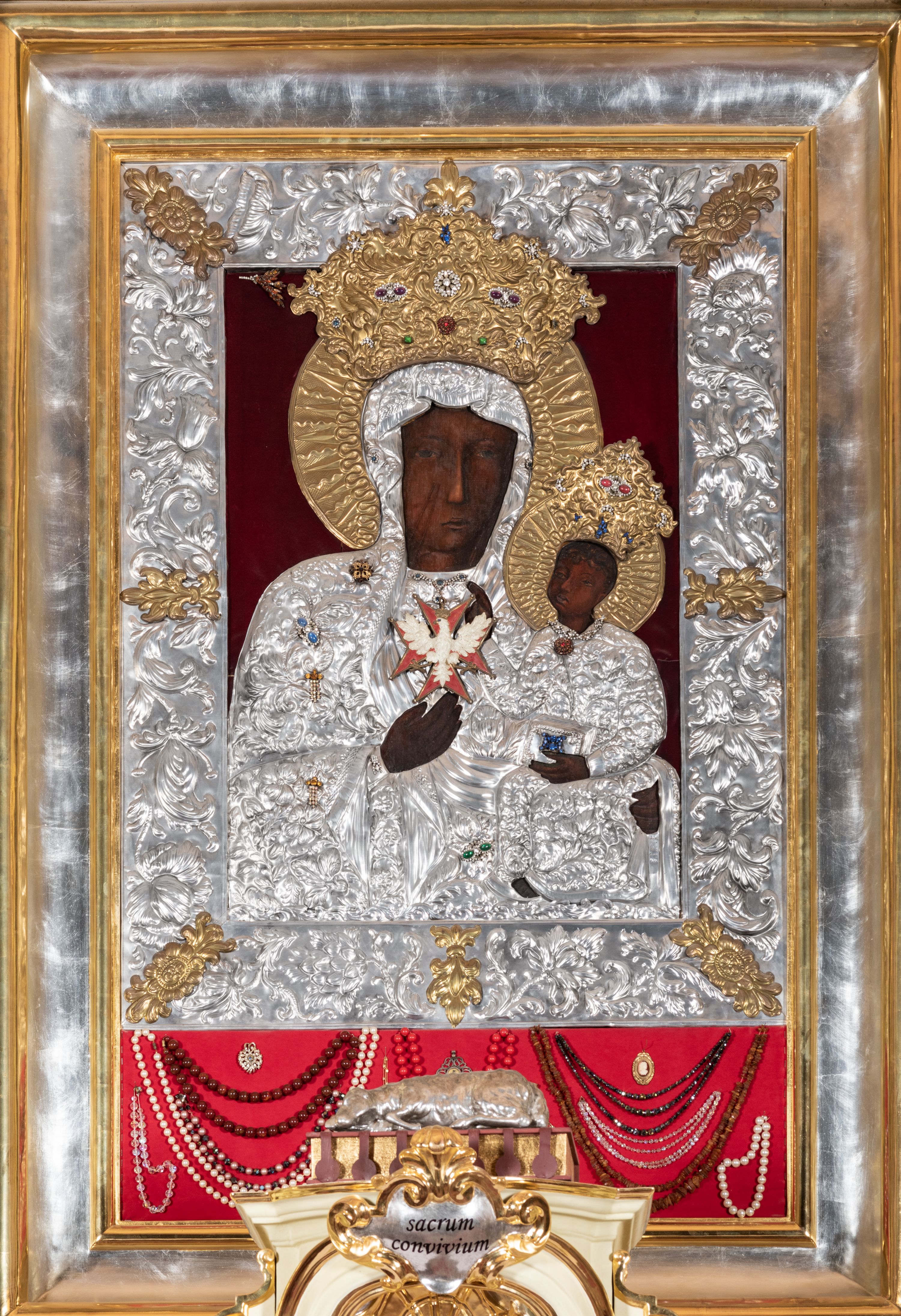 Obraz w kształcie stojącego prostokąta z przedstawieniem Matki Boskiej z Dzieciątkiem w typie Częstochowskiej, w srebrnej sukience odsłaniającej jedynie twarze i dłonie, otoczony szeroką bordiurą z repusowaną dekoracją floralną. Matka Boska ukazana frontalnie z Dzieciątkiem na lewym ręku, prawą rękę ma złożoną na piersi. Twarze o ciemnych karnacjach. Matka Boska delikatnie zwraca głowę w lewo, ma wzrok skierowany w dal, długi i wąski nos, na prawym policzku dwie blizny. Dzieciątko ukazane w pozycji siedzącej, z prawą rączką wzniesioną w geście błogosławieństwa, w lewej trzyma na kolanach zamkniętą księgę. Sukienki drewniane, płaszcz Matki Boskiej bogato dekorowany roślinną dekoracją. Wokół głów obu postaci złote, koliste nimby promieniste z nałożonymi, bardzo ozdobnymi, również złotymi koronami utworzonymi z ornamentu roślinnego dekorowanego kameryzacją. Sukienki obu postaci srebrne, również zdobione ornamentem roślinnym i kameryzacją, na dekolcie Marii aplikowany order Orła Białego. Tło obrazu stanowi ciemnoczerwona tkanina. Przedstawienie obwiedzione szerokim, metalowym pasem srebrnej dekoracji floralnej ze złoconymi plakietami w narożach i połowie wysokości każdego boku ramy. U góry zawieszono rząd orderów, po bokach serca wotywne, na dolnej krawędzi liczne sznury korali.