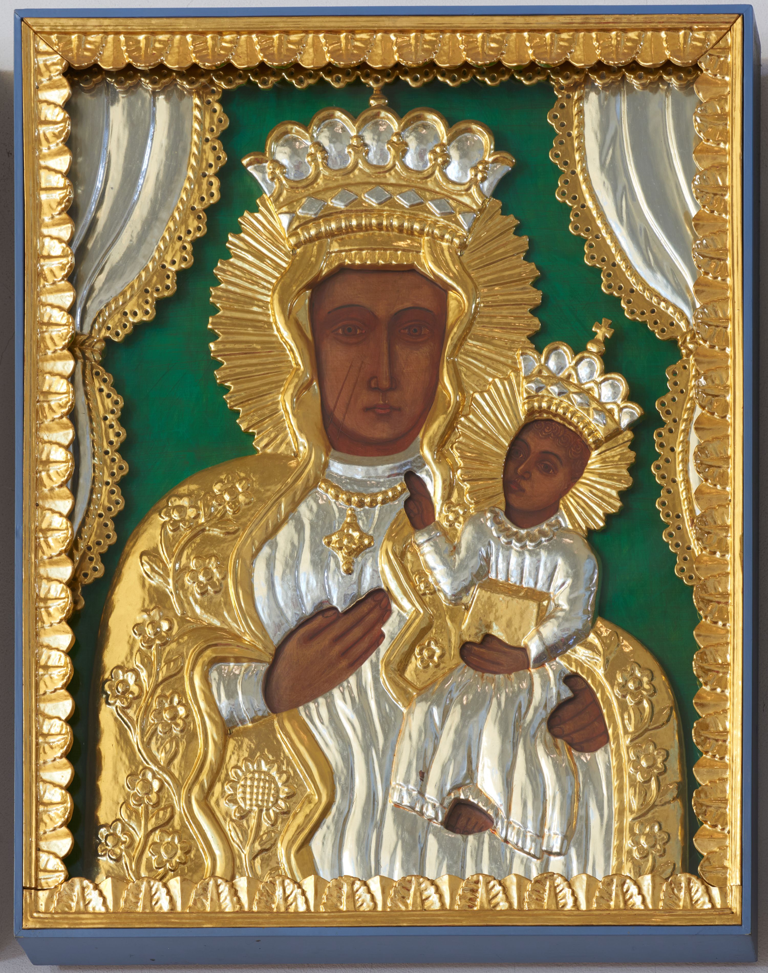 Dzieciątko ubrane jest w srebrzoną sukienkę z kołnierzykiem. Obie postacie wokół głów mają także promieniste nimby, a na głowach korony. Tło jednolite, zielone. W narożach podwieszona jest drewniana, płaskorzeźbiona kotara, obwiedzioną ażurową, płaskorzeźbioną i złocona koronką.