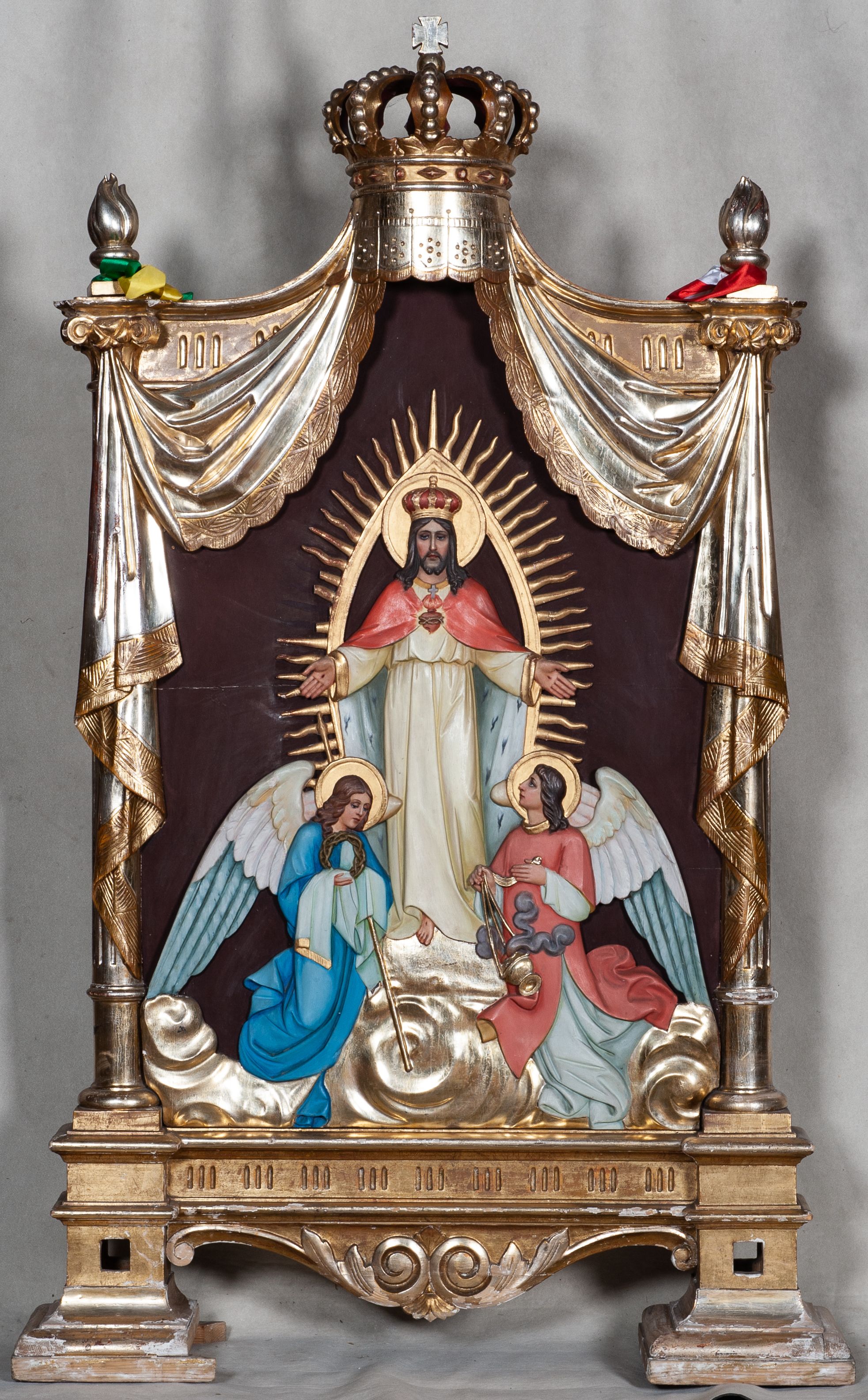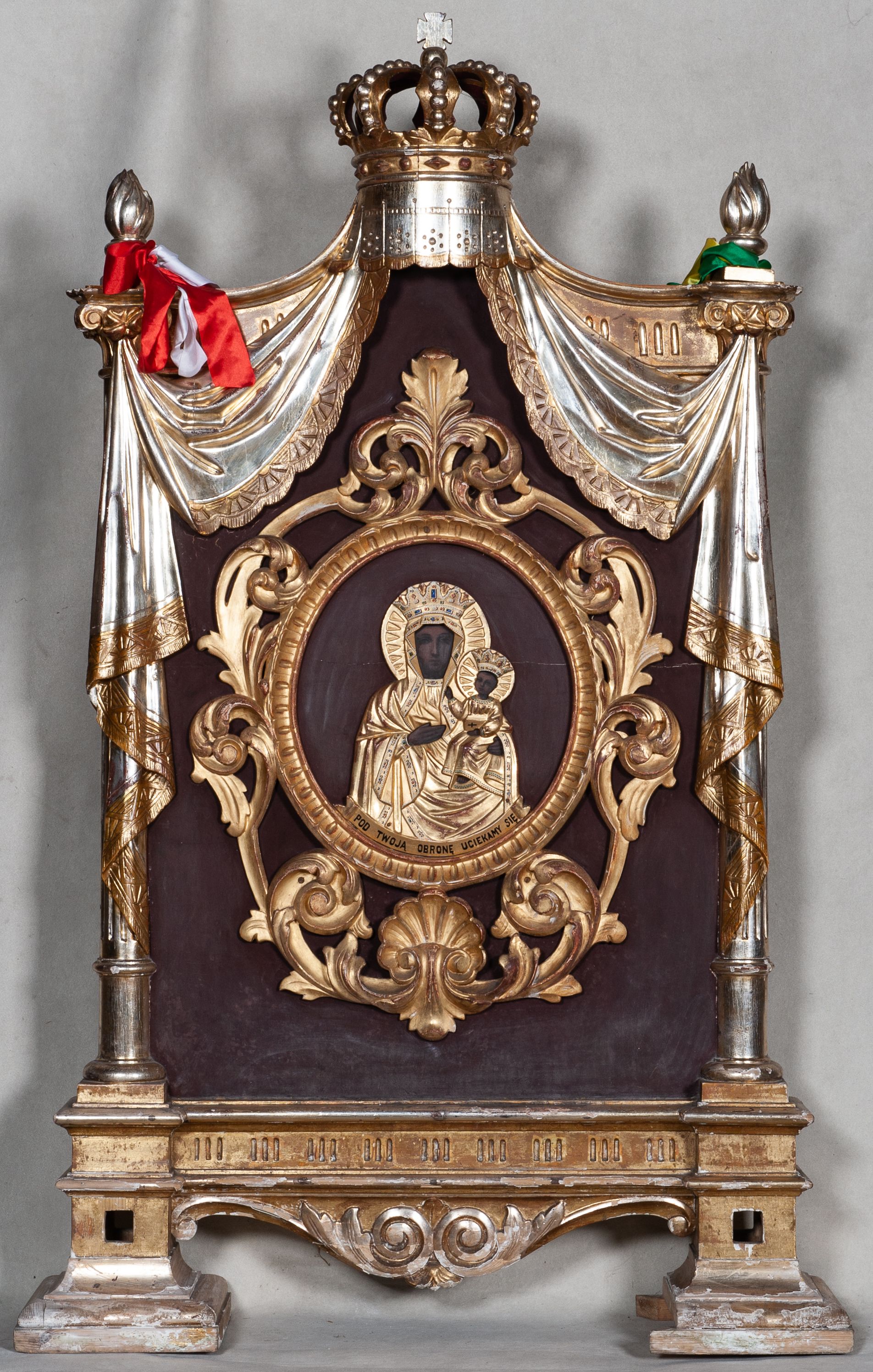 Feretron dwustronny z płaskorzeźbionymi przedstawieniami Matki Boskiej Częstochowskiej i Najświętszego Serca Jezusa, ustawiony na dwóch nóżkach, powstały w XIX wieku.