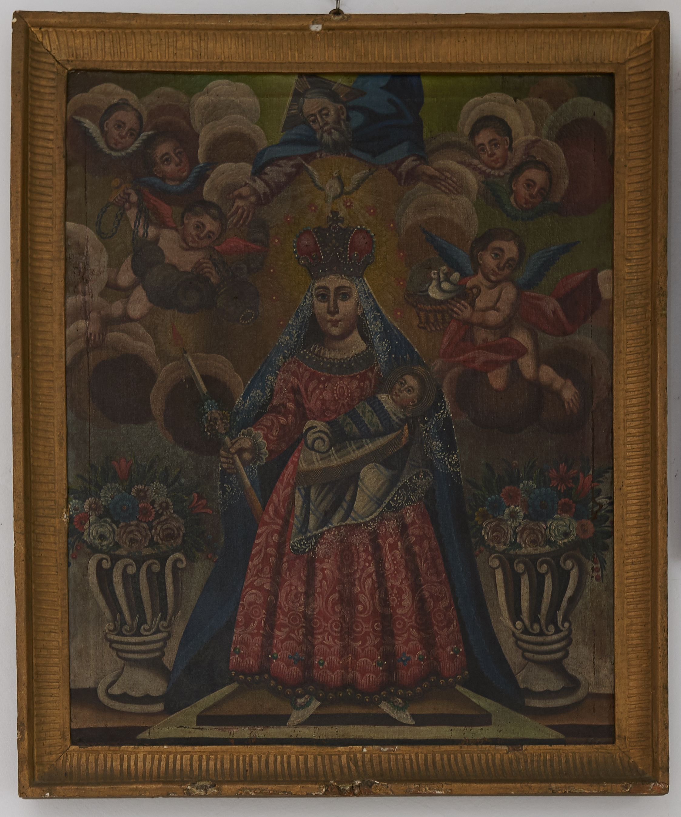 Obraz w formie stojącego prostokąta. W centrum przedstawienie Matki Boskiej w całej postaci, stojącej na dwustopniowej podstawie. Maria ukazana jest frontalnie, lewą ręką podtrzymuje Dzieciątko w powijaku, leżące na poduszce i tkaninie dekorowanej przy brzegu koronką, w prawej, wyciągniętej w bok trzyma zapaloną świecę ozdobioną kwiatami. Maria ma owalną twarz, o dużych migdałowatych oczach, prostym nosie i małych, pełnych ustach. Ubrana jest w czerwoną suknię o białym roślinnym wzorze, dekorowaną przy dekolcie i rękawach koronką. Na głowę i ramiona ma narzucony niebieski płaszcz, opadający po bokach oraz koronkowy, krótszy welon. Na głowie ma koronę zamkniętą, wokół nimb gwieździsty, a na stopach białe buty zdobione kwiatami. W górnej części obrazu, na tle obłoków, nad Marią przedstawione są półpostać Boga Ojca oraz gołębica Ducha Świętego. Bóg ukazany jest jako pochylony starzec, z rozłożonymi na boki rękami, z siwą brodą i włosami. Ubrany jest w różową tunikę i niebieski płaszcz. Wokół głowy ma nimb trójkątny. Ujmują ją dwie pary uskrzydlonych główek anielskich. Poniżej po prawej stronie Marii putto trzymające kadzielnicę, po lewej aniołek trzymający koszyk z dwoma gołąbkami. W dolnej części obrazu, po bokach Marii dwa wazony z bukietami kwiatów. Obraz ujęty złoconą ramą dekorowaną żłobkami.