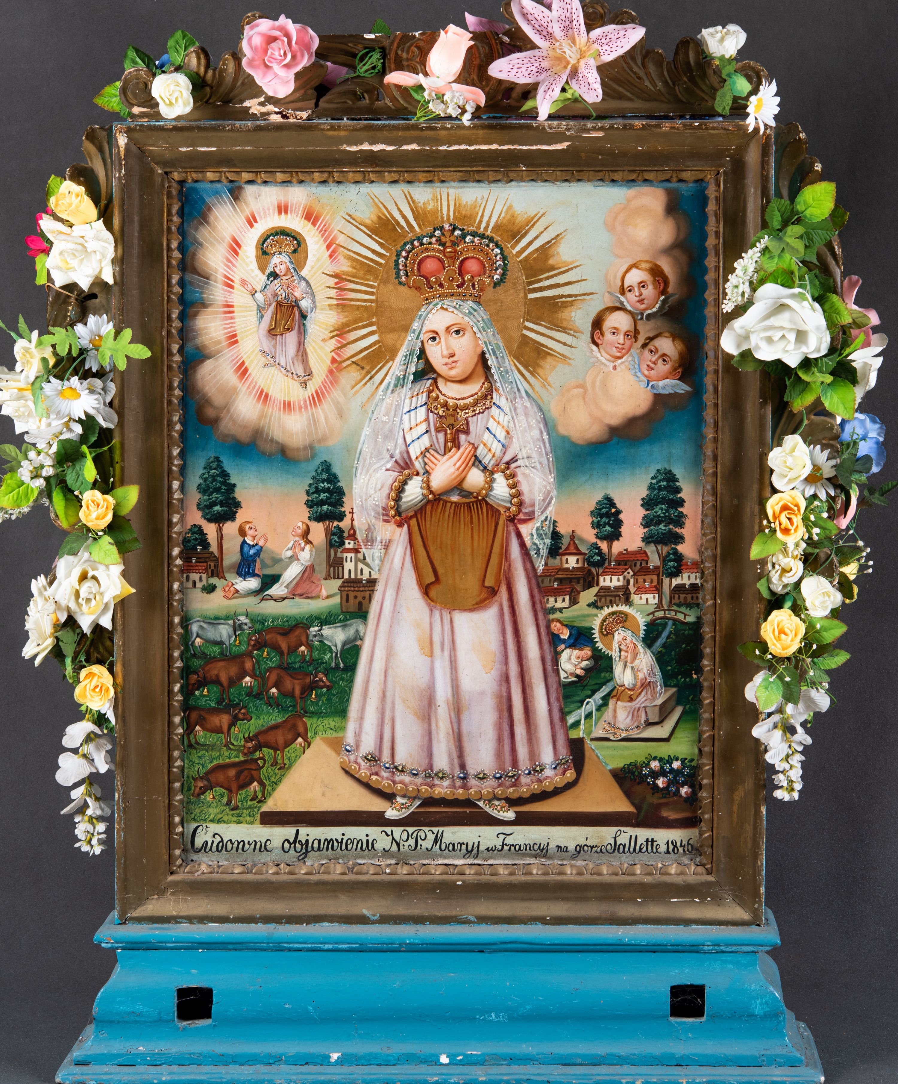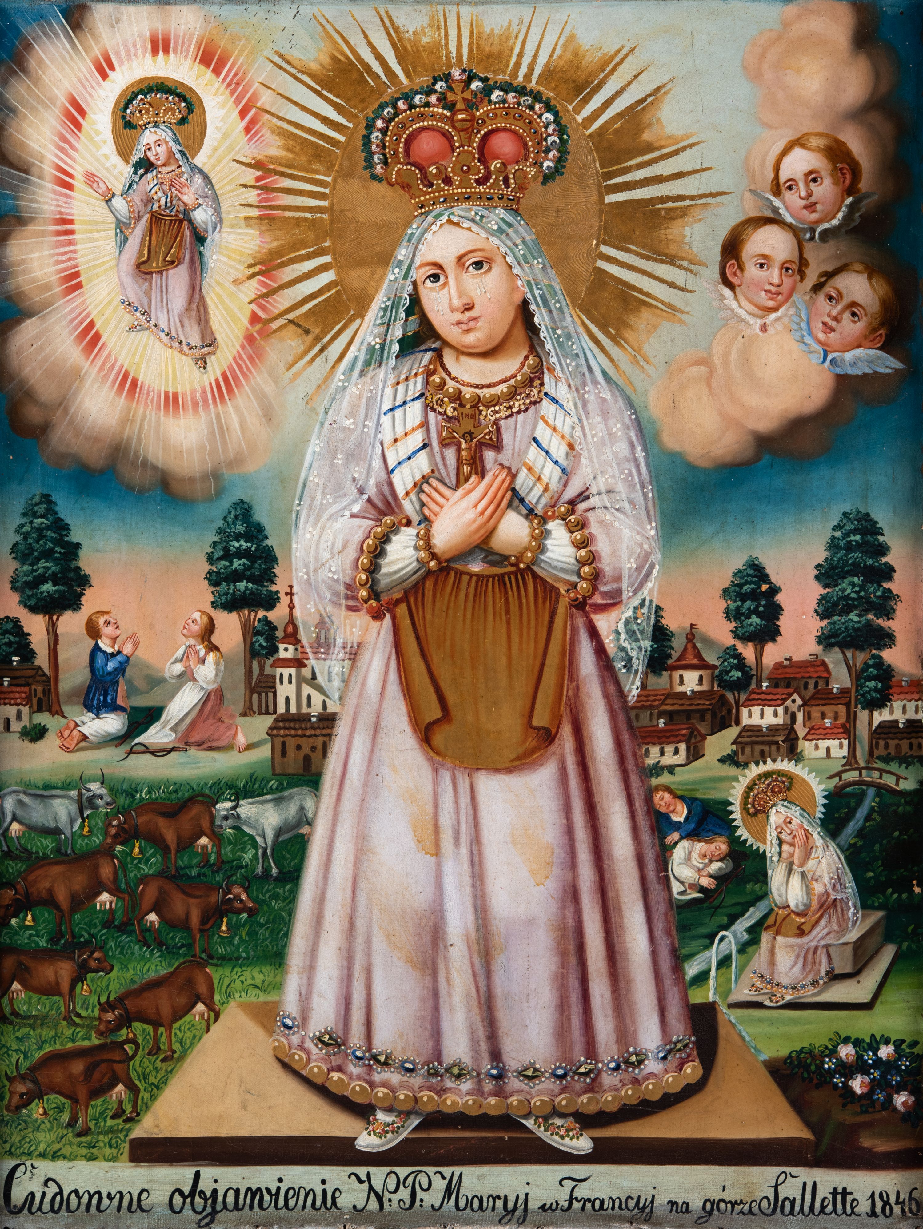 Przy dolnej krawędzi napis „Cudowne Objawienie N(ajświętszej) P(anny) Maryj w Francyj na górze Sállette 1846”.
