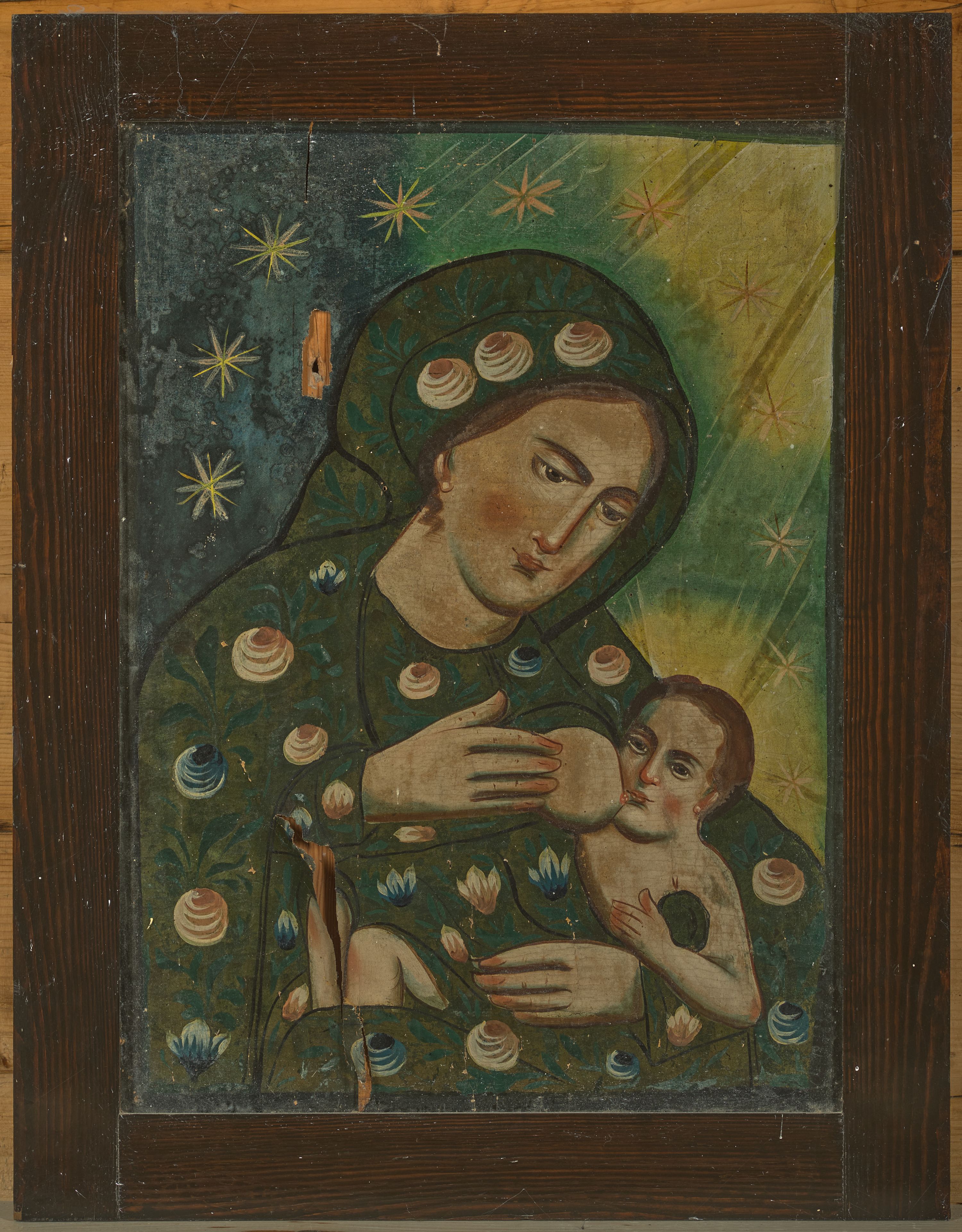 Obraz Matki Boskiej Karmiącej z 1875 roku o cechach typowych dla malarstwa ludowego: silnego konturowania, płaszczyznowości, jednolitej i płaskiej plamie barwnej oraz roślinnej, płasko położonej dekoracji ornamentalnej.