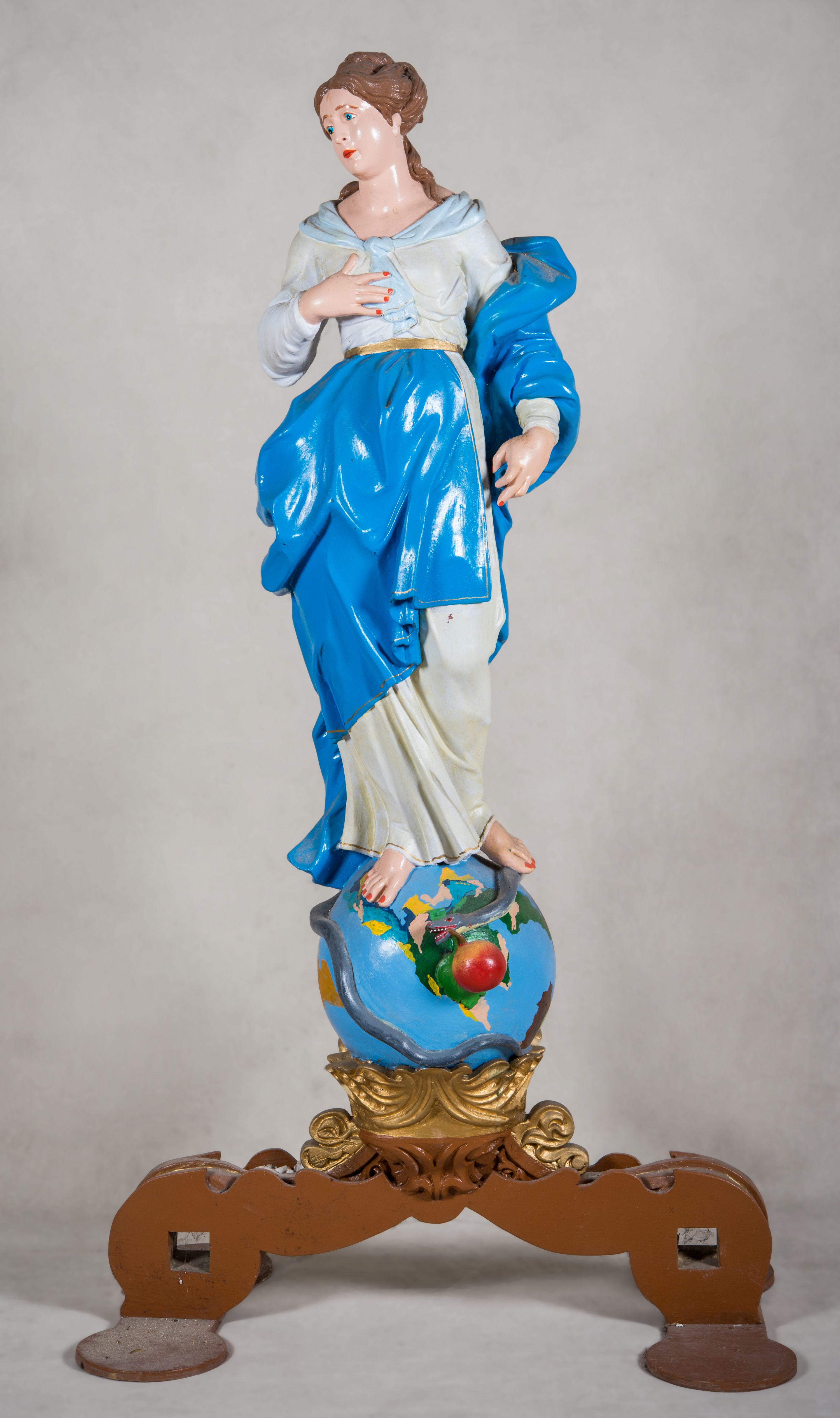 Podstawa feretronu w formie dwóch uproszczonych wolut z otworami na drążki, na płaskich podstawach. Na nich pełnoplastyczna figura Matki Boskiej w typie Niepokalanie Poczętej, stojąca na globie ziemskim, depcząca oplatającego go węża, który trzyma w paszczy jabłko. Maria ukazana w kontrapoście, z prawą nogą wysuniętą do przodu, lewą odwiedzioną, zgiętą w kolanie; prawą rękę składa na piersi, lewą, opuszczoną przytrzymuje płaszcz. Głowa przechylona w prawą stronę; twarz owalna z szeroko otworzonymi, niebieskimi oczami poniżej uniesionych brwi, z prostym nosem i drobnymi, ciemnoczerwonymi ustami, otoczona brązowymi, upiętymi w kok włosami, z wolnymi pasmami spływającymi na lewe ramię i plecy. Madonna ubrana w białą suknię z szerokim jasnoniebieskim kołnierzem wiązanym na dekolcie, przepasaną złotym paskiem oraz błękitny płaszcz, który układając się w grube fałdy otacza jej lewą rękę, przechodzi przez prawe biodro i jest zatknięty z przodu za pasek.