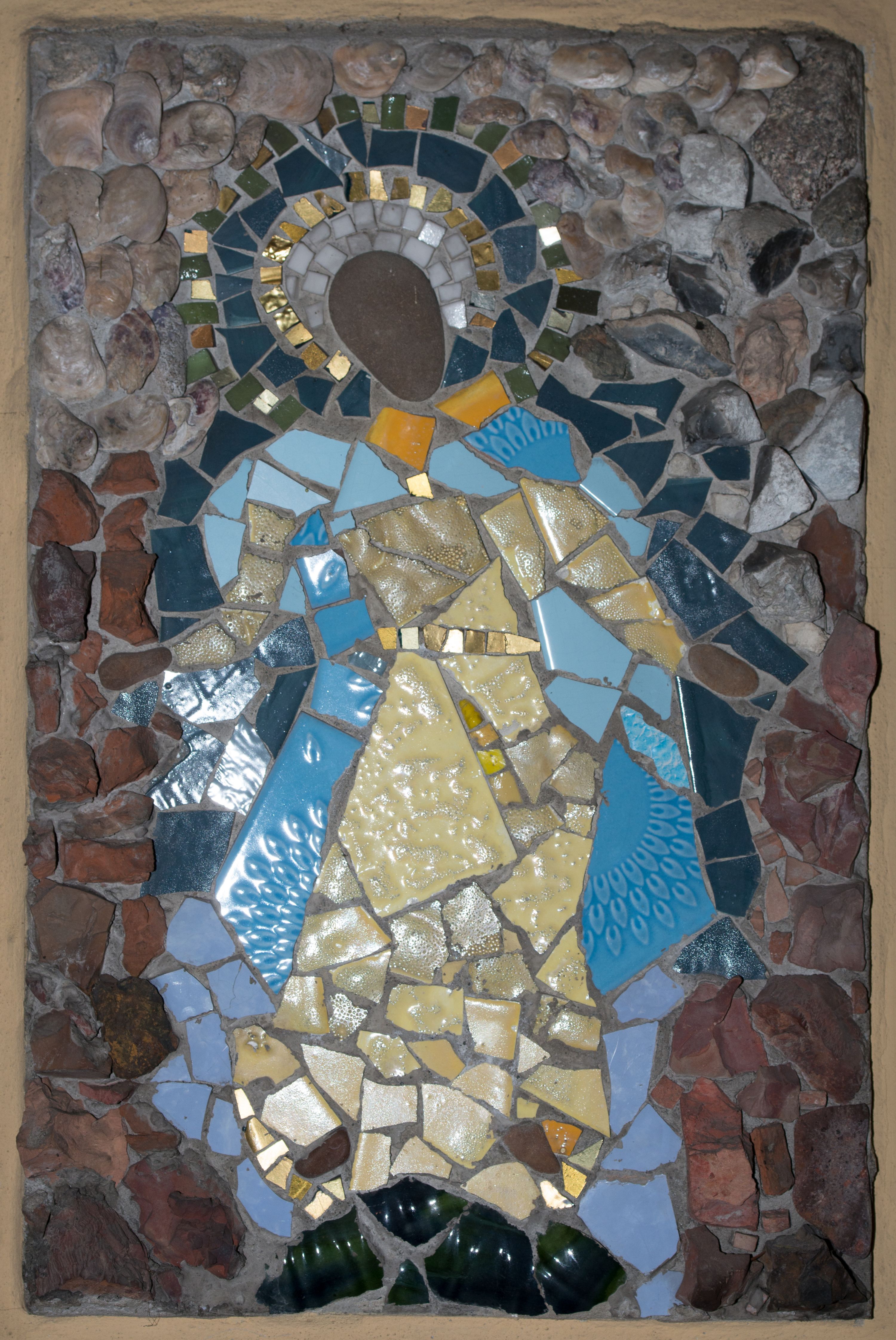 Mozaika w kształcie stojącego prostokąta z umieszczonym centralnie frontalnym przedstawieniem Matki Boskiej w typie Niepokalanie Poczętej. Maria ukazana całopostaciowo, w pozycji stojącej z głową pochyloną nieznacznie w prawo i skierowaną do dołu. Ręce postaci ugięte w łokciach i wyciągnięte na boki. Twarz Marii pozbawiona jest szczegółów fizjonomicznych. Wokół głowy znajduje się nimb w kolorach białym, złotym, ciemnoniebieskim i zielonym. Postać ubrana jest jasnożółtą suknię z długimi rękawami przewiązaną w talii złotym pasem oraz rozwiany płaszcz utrzymany w odcieniach niebieskiego. Spod szat widoczne brązowe buty. Pod stopami postaci widoczny fragment ciemnozielonego owalu nawiązującego do globu, na którym zazwyczaj stoi Maria w przedstawieniach Niepokalanego Poczęcia. Tło jednolite utrzymane w odcieniach brązu i szarości.