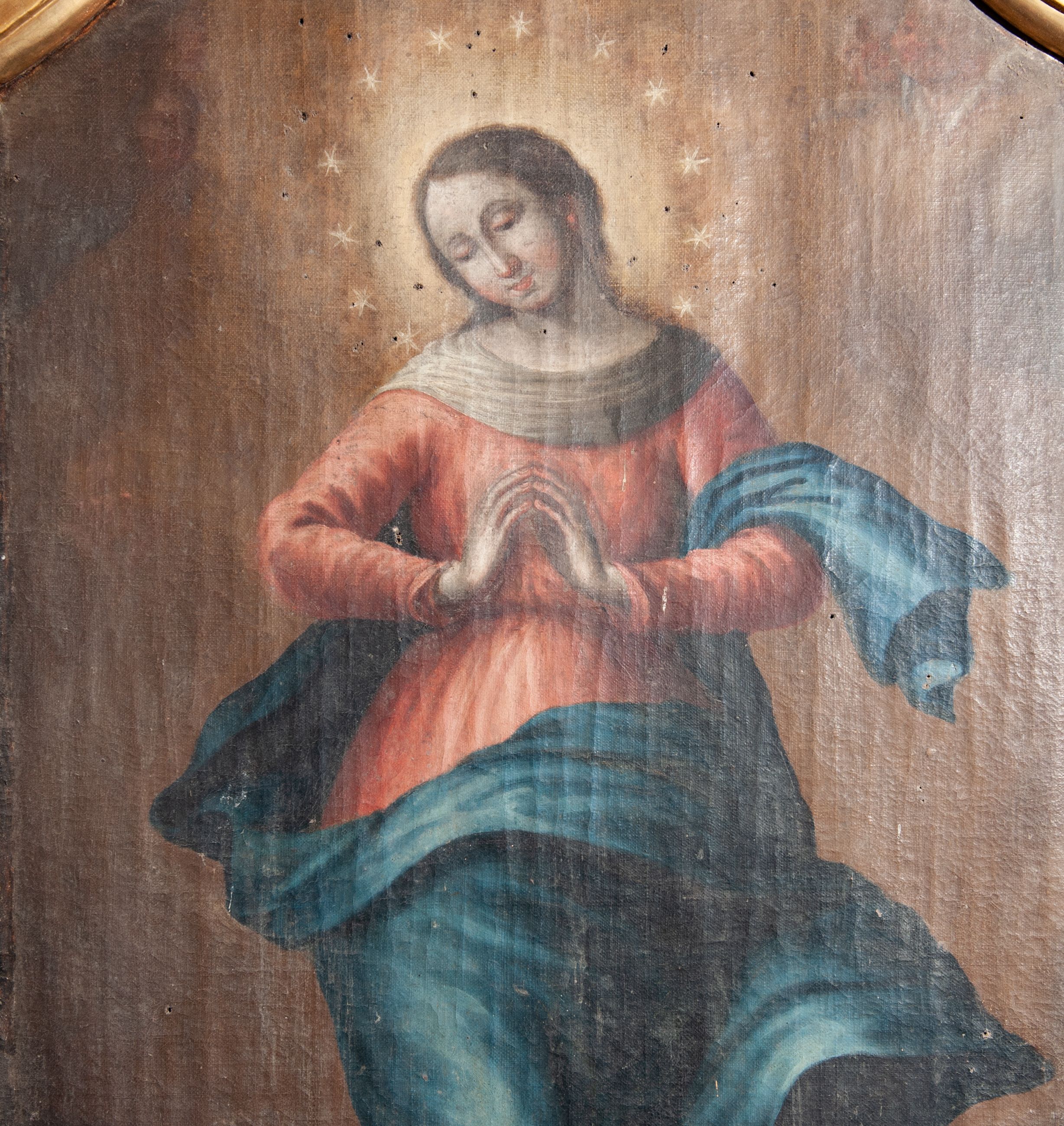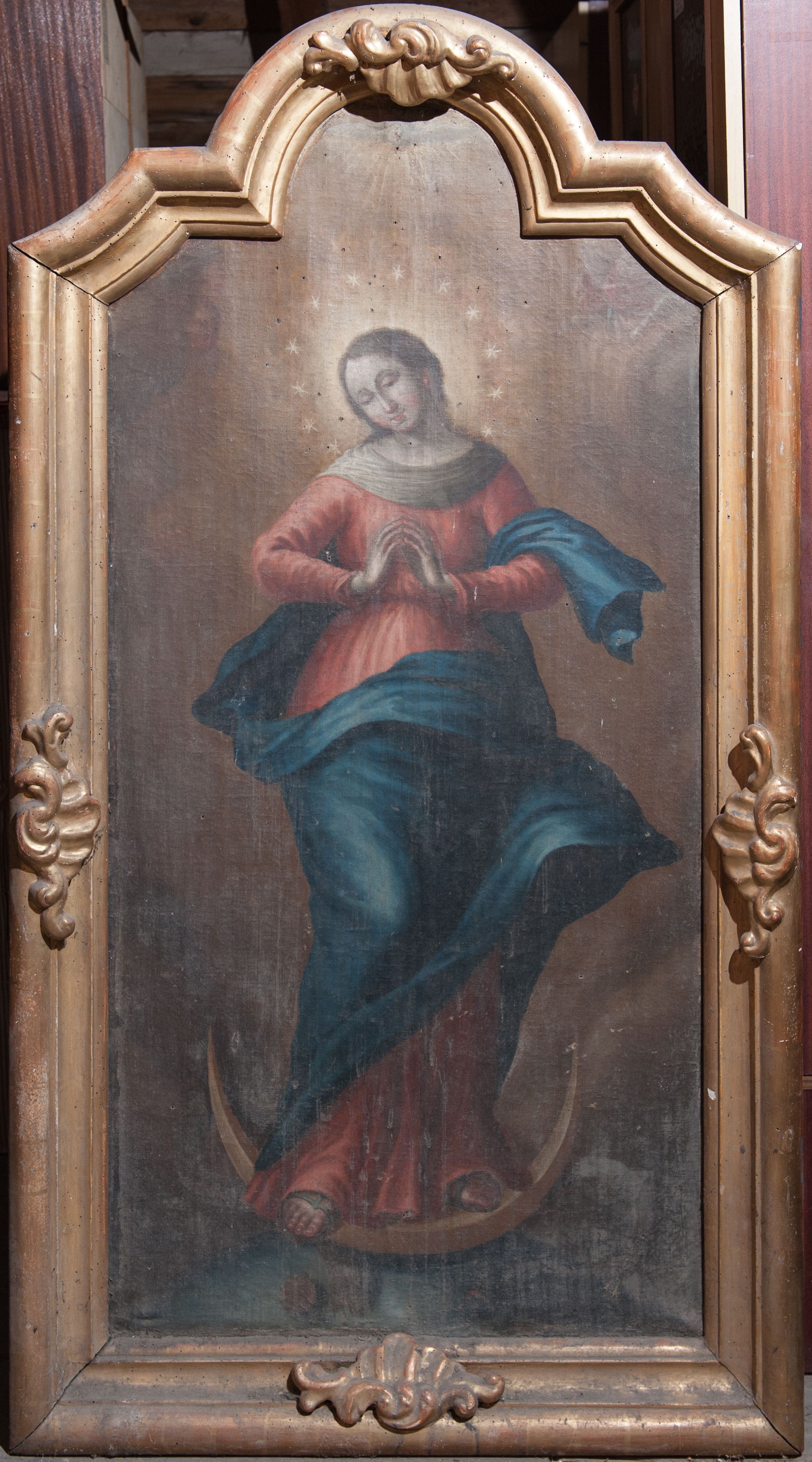 Obraz Matki Boskiej Niepokalanie Poczętej w kształcie stojącgo prostokąta, zamkniętego łukiem wklęsło-wypukłym z uskokami. W centrum kompozycji stoi na półksiężycu Matka Boska w delikatnym kontrapoście, z prawą nogą ugiętą w kolanie, z dłońmi złączonymi na wysokości piersi i z głową przechyloną na prawe ramię. Ma owalną twarz, z długim i prostem nosem, z małymi ustami i przymkniętymi oczami oraz zarumienione policzki. Jej głowę okalają brązowe włosy, spływające na plecy. Maria ubrana jest w długą, czerwoną suknię z długimi rękawami, przewiązaną w pasie, białą chustę przy szyi i błękitny płaszcz przerzucony jednym końcem przez lewą rękę, rozwiany w pozostałych fragmentach podmuchami wiatru. Na stopach ma założone sandały, a jej głowę okala wieniec z 12 gwiazd. Księżyc pod stopami Marii zwrócony jest rogami ku górze, oparty na niebieskim globie ziemskim, na którym znajduje się wąż z jabłkiem w pysku. W górnej części kompozycji znajduje się gołębica Ducha Świętego, od której odchodzą promienie. Poniżej, po bokach obrazu są uskrzydlone główki aniołków. Tło jednolite, jasnobrązowe. Rama drewniana, profilowana, złocona, zdobiona na bokach pojedynczymi rocaille'ami.