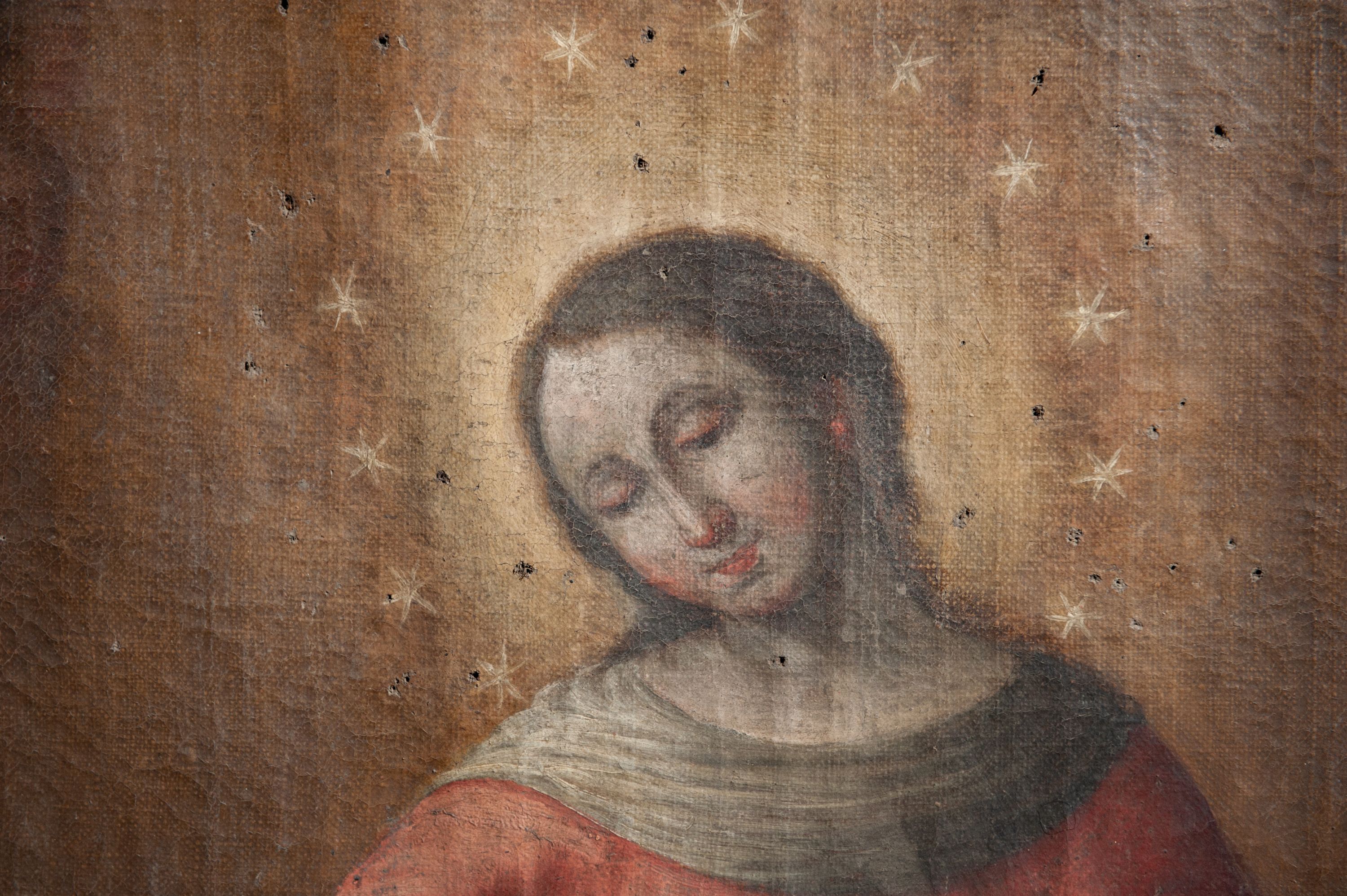 Dostateczny, widoczne przybrudzenia oraz liczne dziury w płótnie; ubytki warstwy malarskiej, spłowiały werniks, rama spróchniała, ślady po drewnojadach.