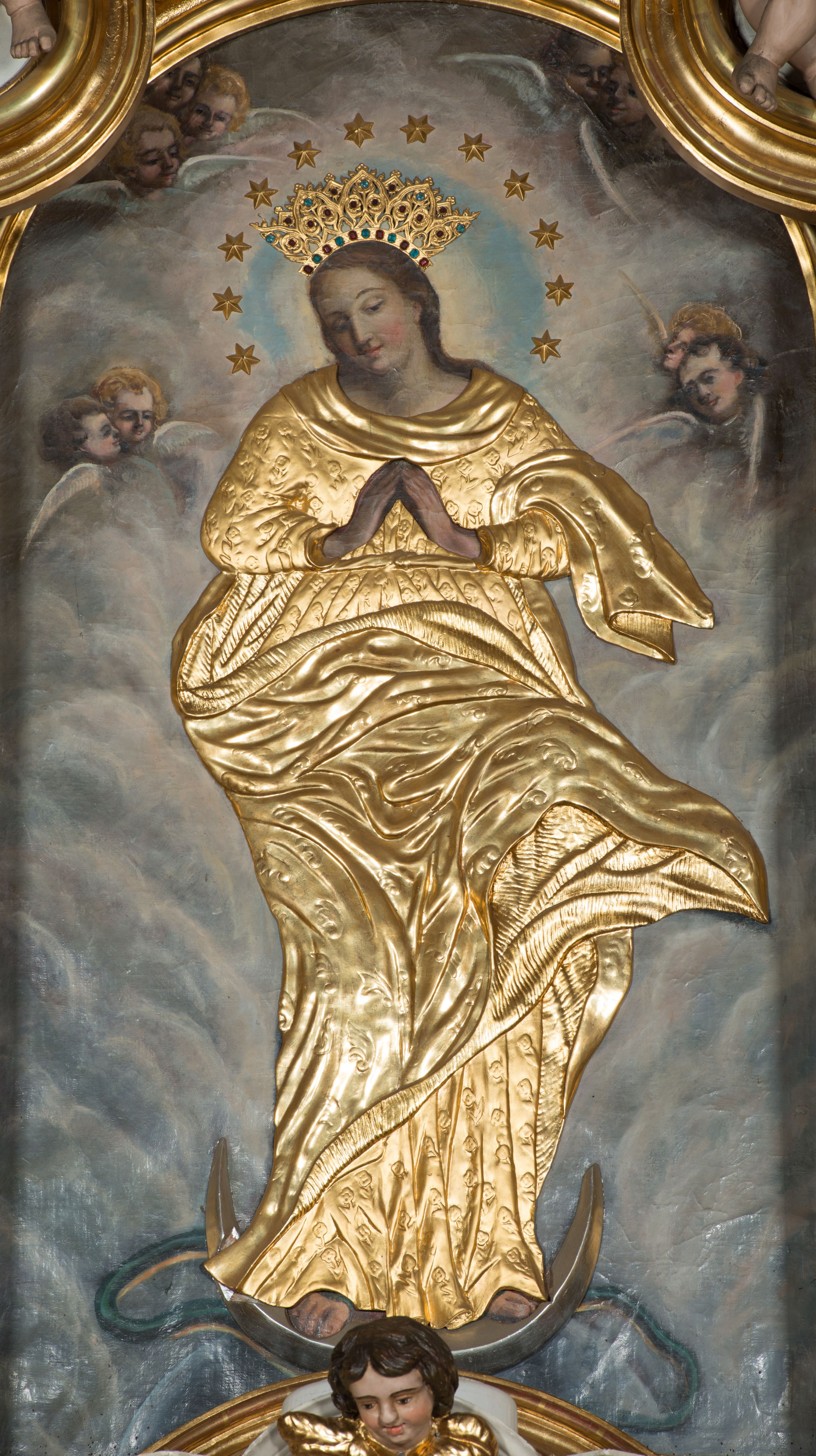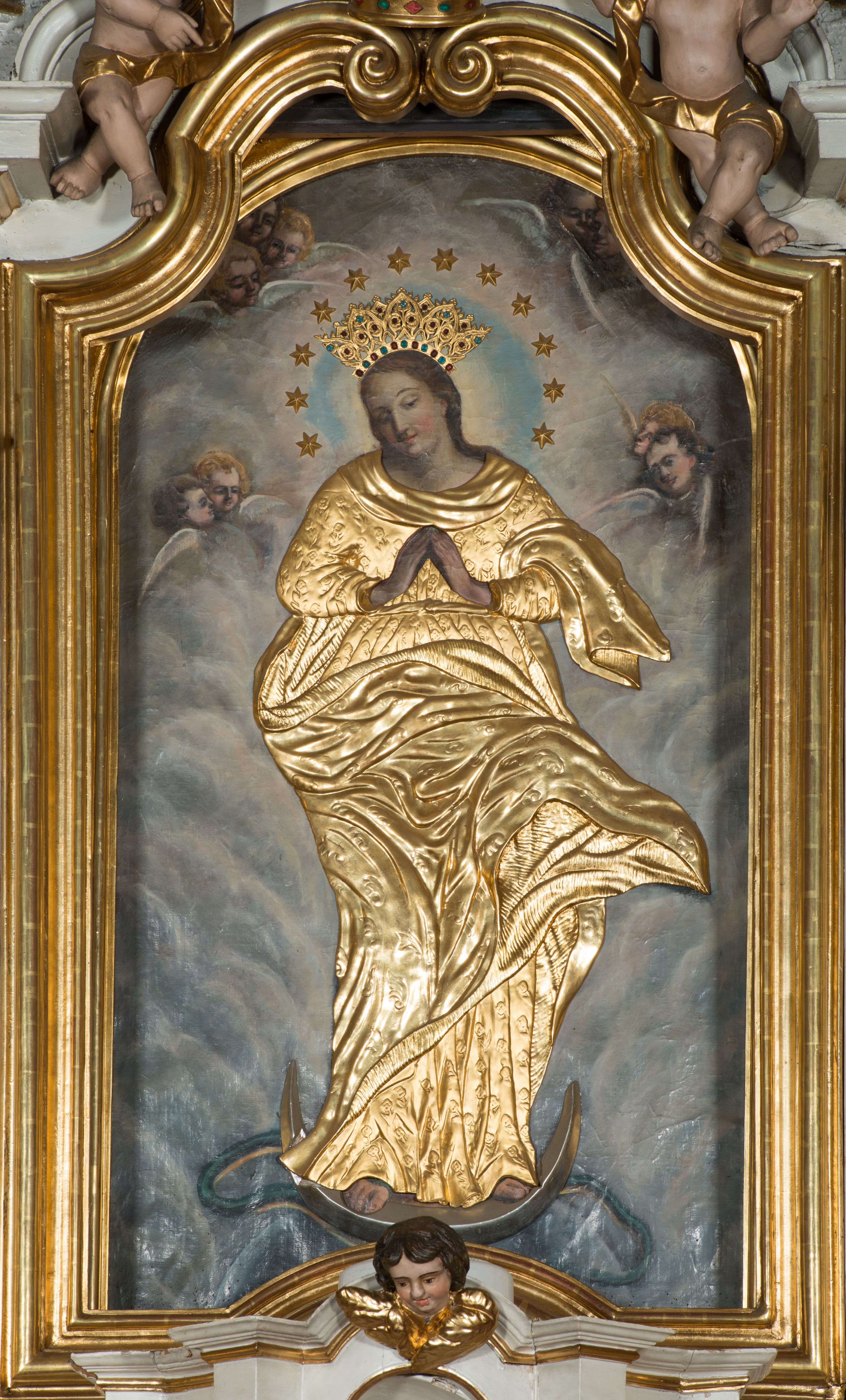 Obraz w formie stojącego prostokąta zamkniętego łukiem półkolistym. W centrum Maria ukazana w całej postaci, stoi na sierpie księżyca i globie, na którym wije się wąż. Przedstawiona jest frontalnie, w kontrapoście, z pochyloną głową skierowaną w prawo oraz dłońmi złożonymi w geście modlitwy. Twarz ma owalną, o migdałowatych, półprzymkniętych oczach, prostym nosie i małych ustach, okoloną długimi włosami, opadającymi na plecy. Ciało zakrywa metalowa, złocona sukienka, w postaci sukni, dekorowanej motywem kwiatowym, przepasanej w talii oraz płaszcz zawieszony na lewym przedramieniu i rozwiany z przodu, w partii nóg. Na głowie aplikowana, złocona, kameryzowana korona otwarta, a wokół niej wieniec z 12 aplikowanych gwiazd. Matka Boska ukazana jest na tle gęstych obłoków; w górnej części obrazu cztery grupy uskrzydlonych główek anielskich.