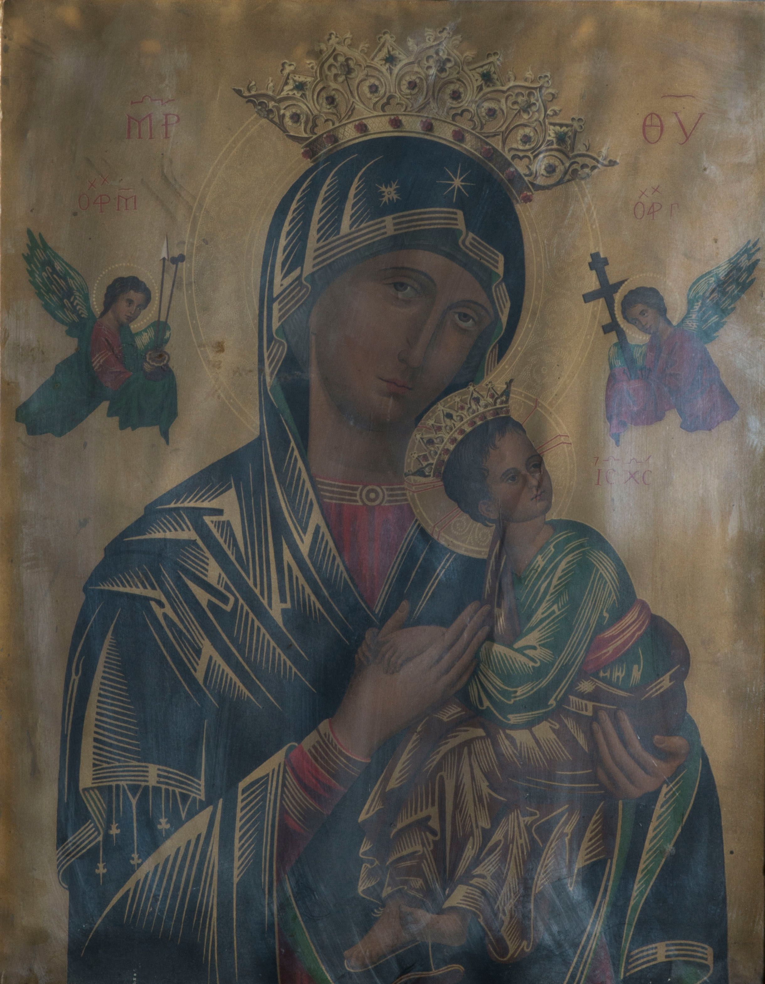 Obraz w kształcie stojącego prostokąta z przedstawieniem Matki Boskiej Nieustającej Pomocy. Maria ukazana w półpostaci, frontalnie, z Dzieciątkiem na lewym ręku. Jezus widoczny z prawego profilu, z głową odwróconą do tyłu, oburącz ujmuje dłoń Marii. Owalne twarze postaci charakteryzują linearnie opracowane rysy, z długimi, wąskimi nosami oraz drobnymi ustami. Oczy Marii mają migdałowy kształt, wzrok skierowany jest na wprost. Matka Boska ubrana jest w czerwoną suknię z długimi rękawami ze złotymi obszyciami oraz zielony płaszcz nałożony na głowę. Dzieciątko ubrane jest w zieloną, przepasaną sukienkę i czerwony płaszcz, z jego stopy zsuwa się sandał. Obie postacie mają na głowach otwarte, zdobione kamieniami szlachetnymi korony oraz nimby. Jezus spogląda w kierunku niewielkiej sylwetki jednego z dwóch aniołów znajdujących się po bokach głowy Marii, trzymających w dłoniach narzędzia męki Pańskiej. Anioł po lewej stronie ma w dłoniach włócznię i gąbkę, ten po prawej krzyż prawosławny. W tle, powyżej aniołów napisy: po lewej stronie „MP” i „ΟΡМ”, a po prawej „ΘΥ” oraz „OΡГ”. Poniżej anioła po prawej stronie „IC-XC”. Tło jednolite, ciemnożółte. Obraz ujęty jest prostokątną, złoconą ramą zdobioną płaskorzeźbieniami.
