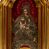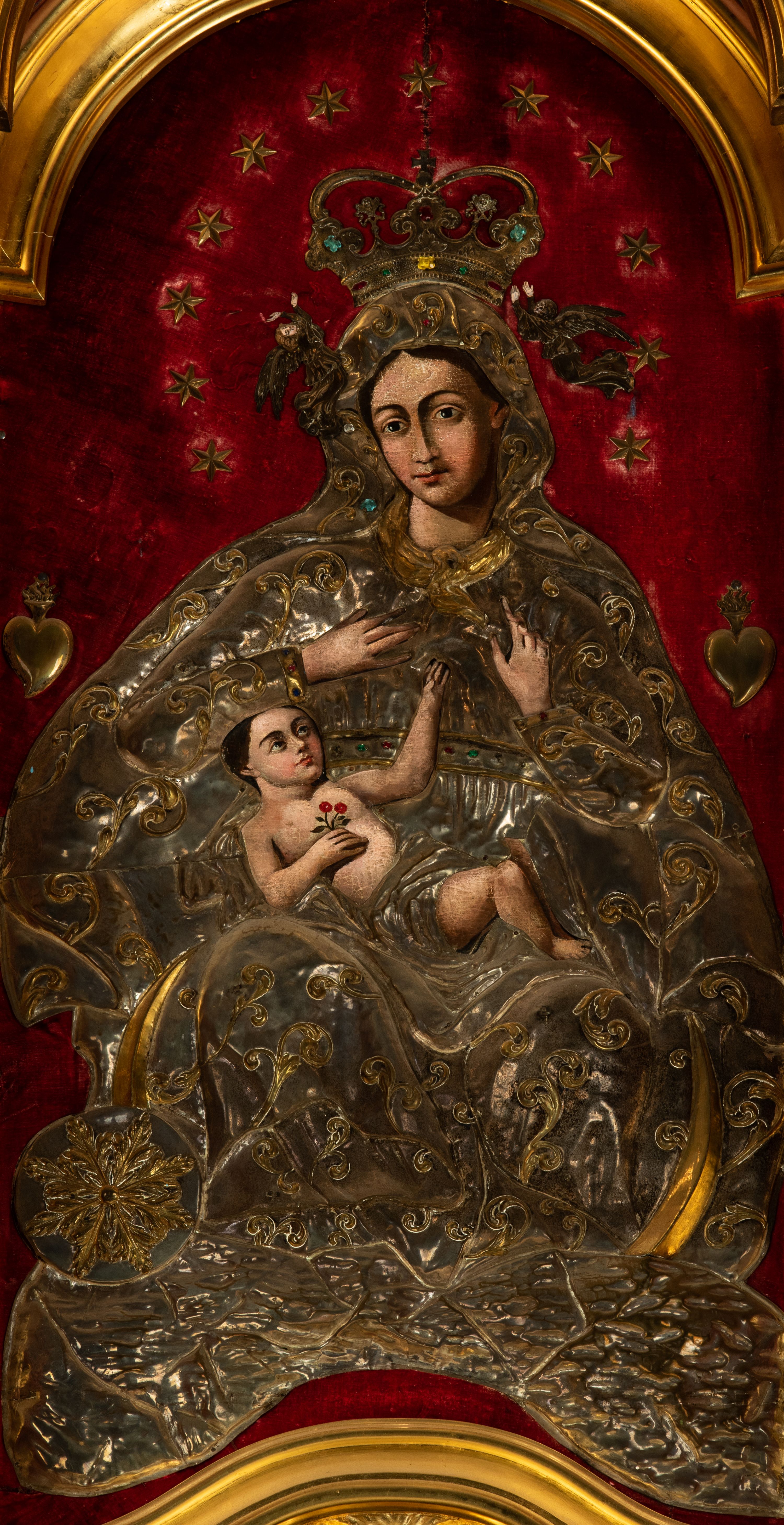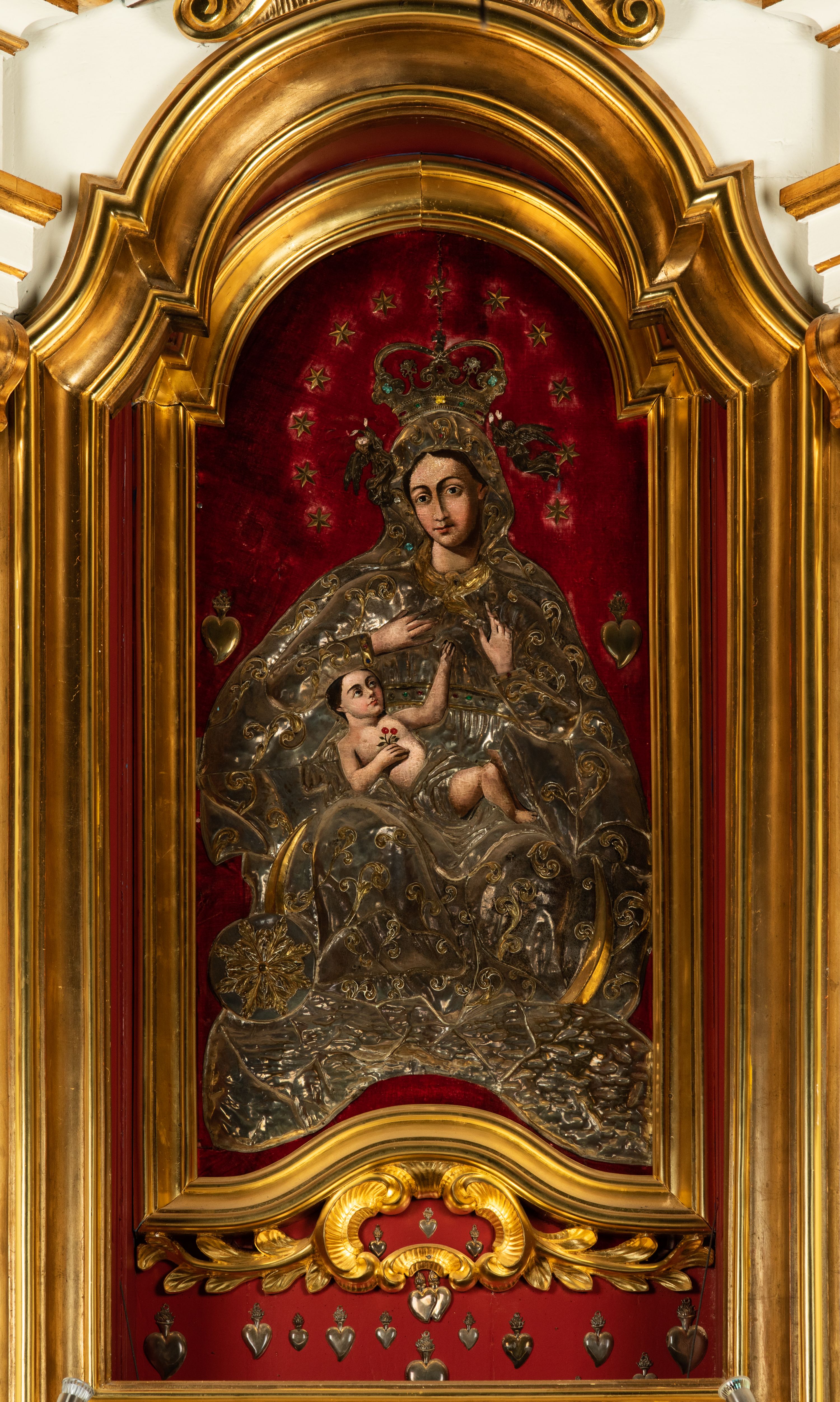 Obraz w kształcie stojącego prostokąta o wklęsło-wypukłej podstawie, zamkniętego nadwieszonym łukiem półkolistym, ujęty profilowaną, złoconą ramą przedstawia tronującą Madonnę z Dzieciątkiem. Maria zwrócona jest na wprost o nieznacznie przechylonej w lewo sylwetce. Skierowaną w trzech czwartych w prawo, lekko przechyloną głowę charakteryzuje owalna twarz o silnym modelunku światłocieniowym, wyrazistych łukach brwiowych, dużych oczach, długim, prostym nosie i wąskiej linii ust w odcieniu koralowym. Ciemne włosy rozdzielone są pośrodku głowy przedziałkiem. Partie szat Marii pokrywa metalowa osłona. Matka Boska ma na sobie srebrzoną suknię spiętą kameryzowanym paskiem, pod szyją jest zawiązana złocona chusta, a głowę, ramiona i nogi osłania srebrzony płaszcz zdobiony złoconym motywem wici roślinnej. Głowę Marii wieńczy zamknięta, kameryzowana korona podtrzymywana przez parę unoszących się po bokach aniołów. Prawą rękę składa na piersi, lewą unosi z wyprostowanym palcem wskazującym. Na kolanach Matki Boskiej leży zwrócone w lewo i spoglądające na nią Dzieciątko. Zaokrągloną twarz charakteryzują wyraziste łuki brwi, duże, ciemne oczy, lekko zadarty nos, kształtne usta i wyraźnie zaznaczony podbródek. Nagą sylwetkę Jezusa okrywa w partii bioder pokryte metalową osłoną, srebrzone perizonium. W prawej, złożonej na piersi dłoni trzyma gałązkę z dwoma kwiatkami czerwonej róży, lewą rękę wyciąga do góry, w kierunku dłoni Marii. Pod stopami Matki Boskiej jest złocony sierp półksiężyca, z tarczą słoneczną w formie rozety po lewej stronie kompozycji, poniżej srebrzone obłoki. Głowę Madonny okala krąg 12 gwiazd, po bokach, na wysokości ramion jest para wotów w kształcie serca. Tło wyłożone jest czerwonym aksamitem.