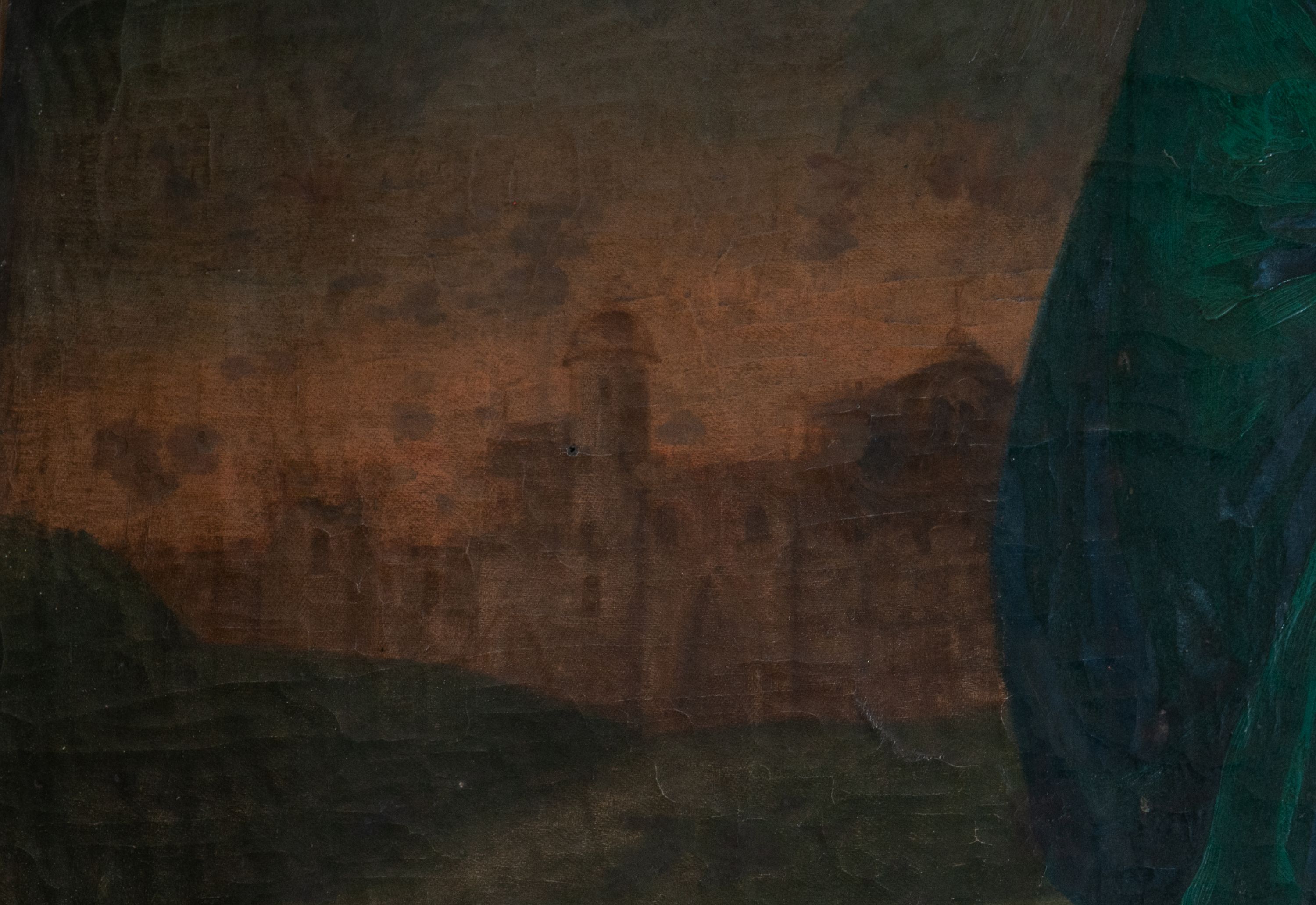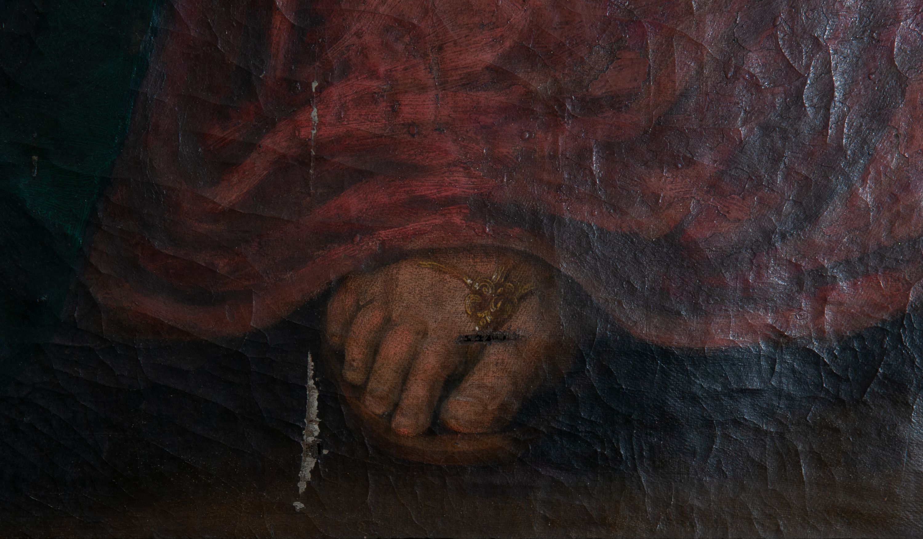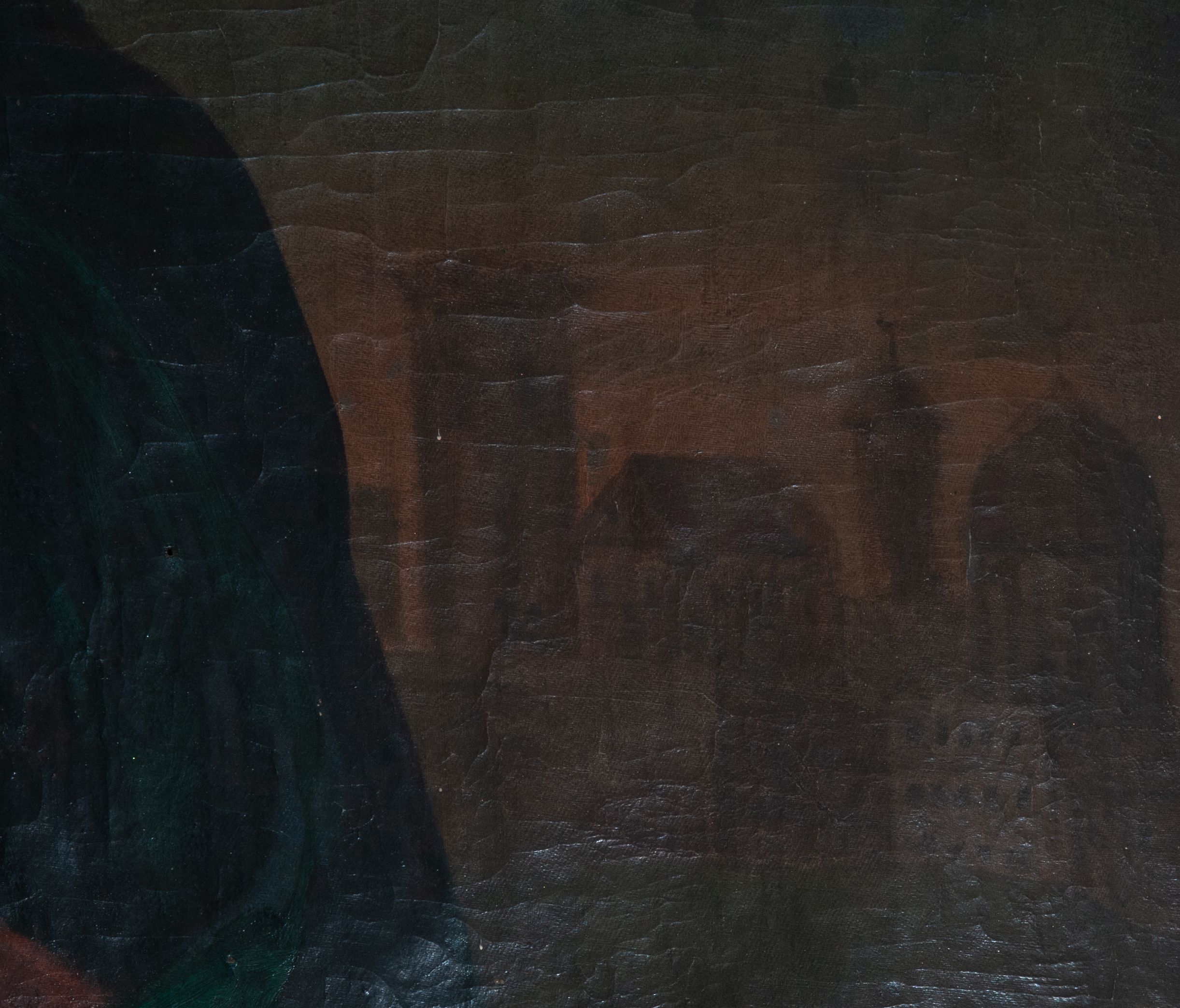 Płótno sfalowane, pociemniała warstwa malarska, widoczne krakelury.